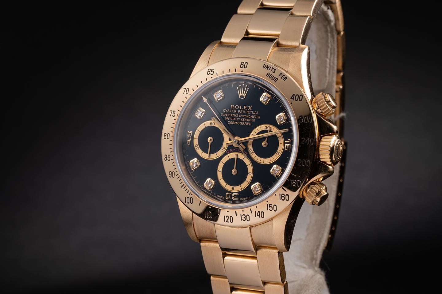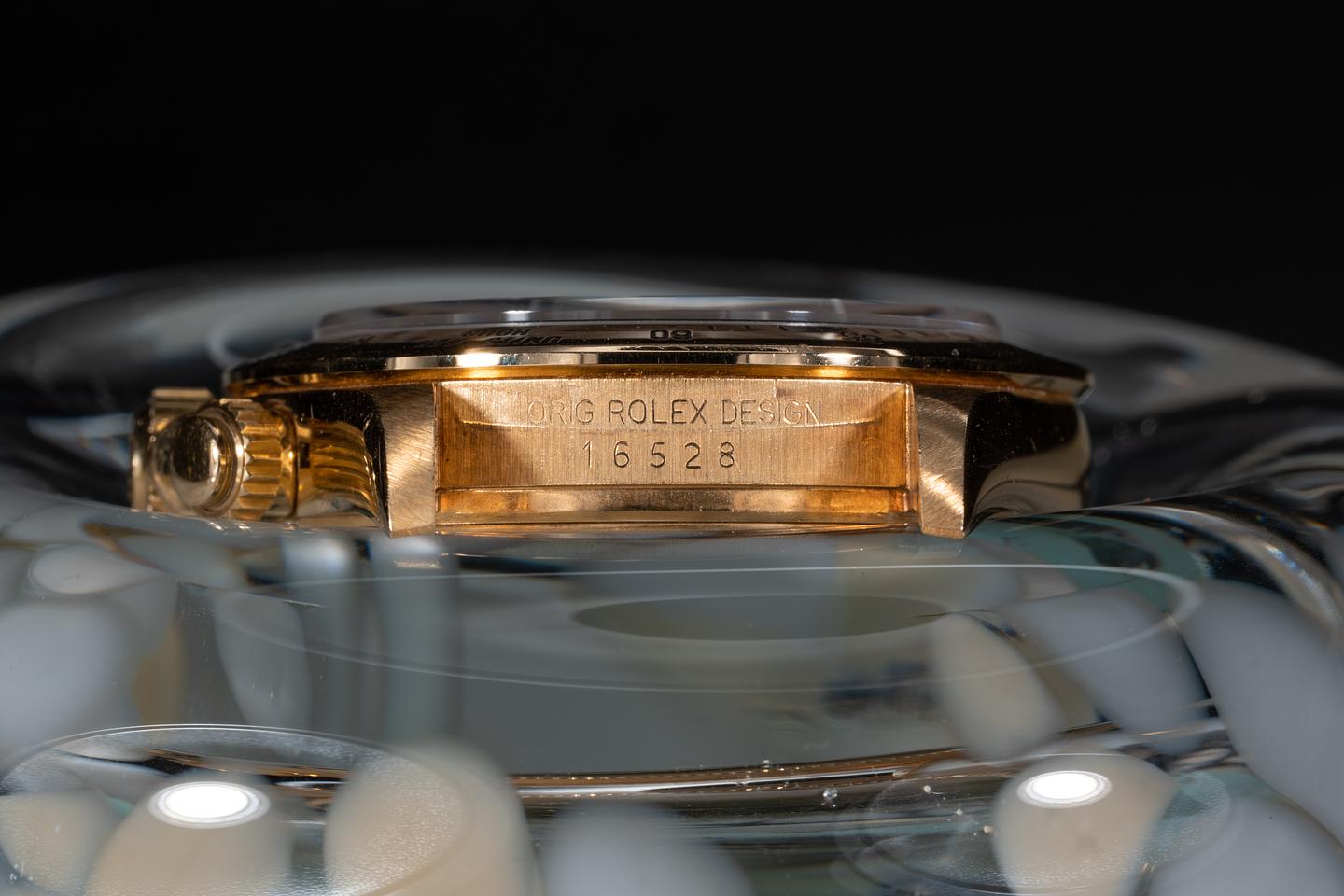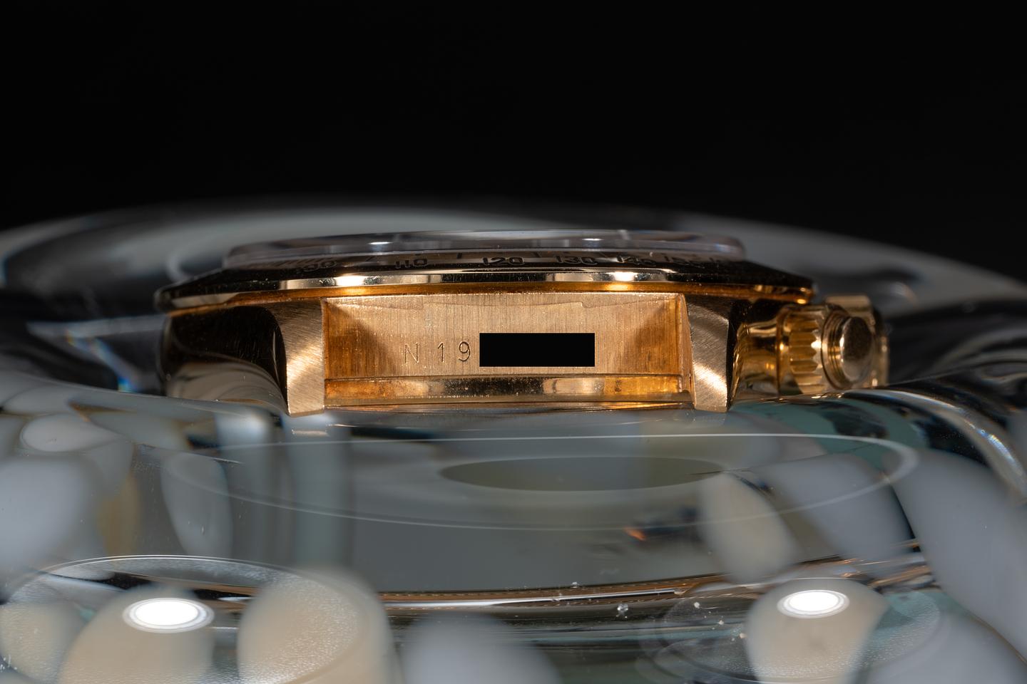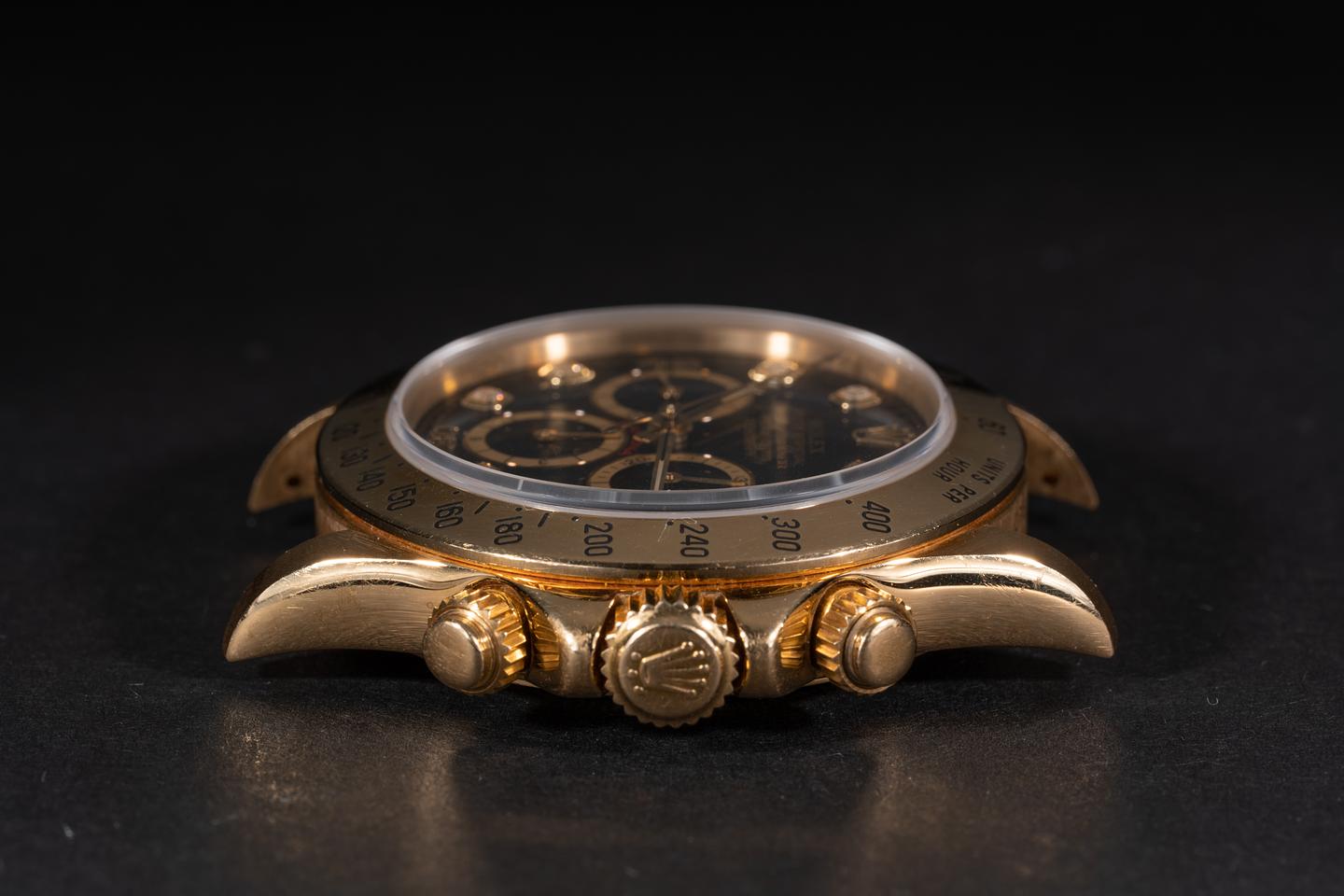 Case: The thick, sharp, and even 18k yellow gold case is excellent showing only very light wear from use. The 18k yellow gold bezel is also in excellent condition showing only very light wear from use.