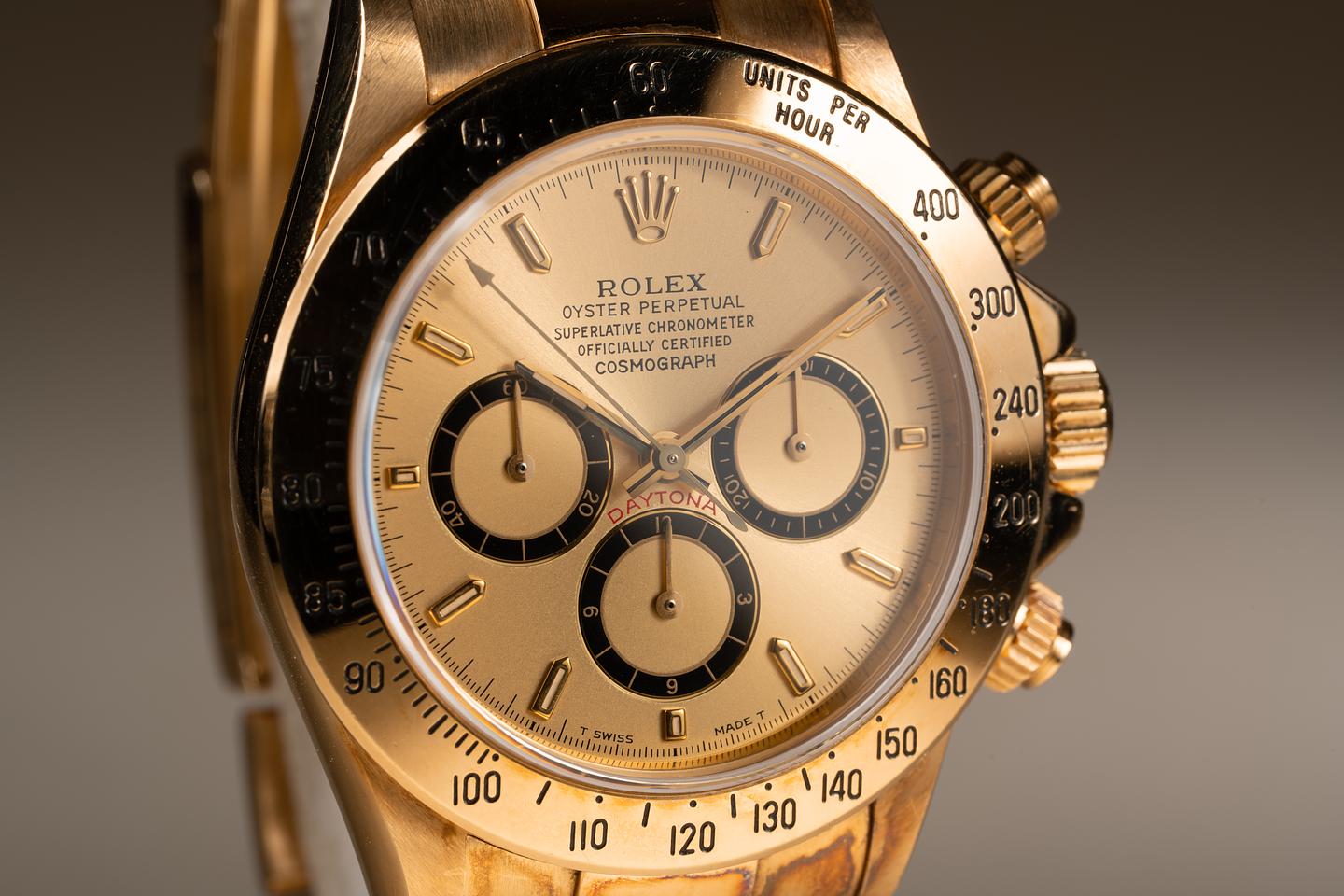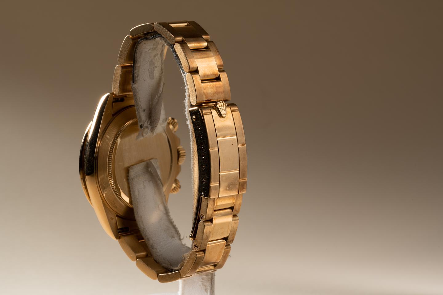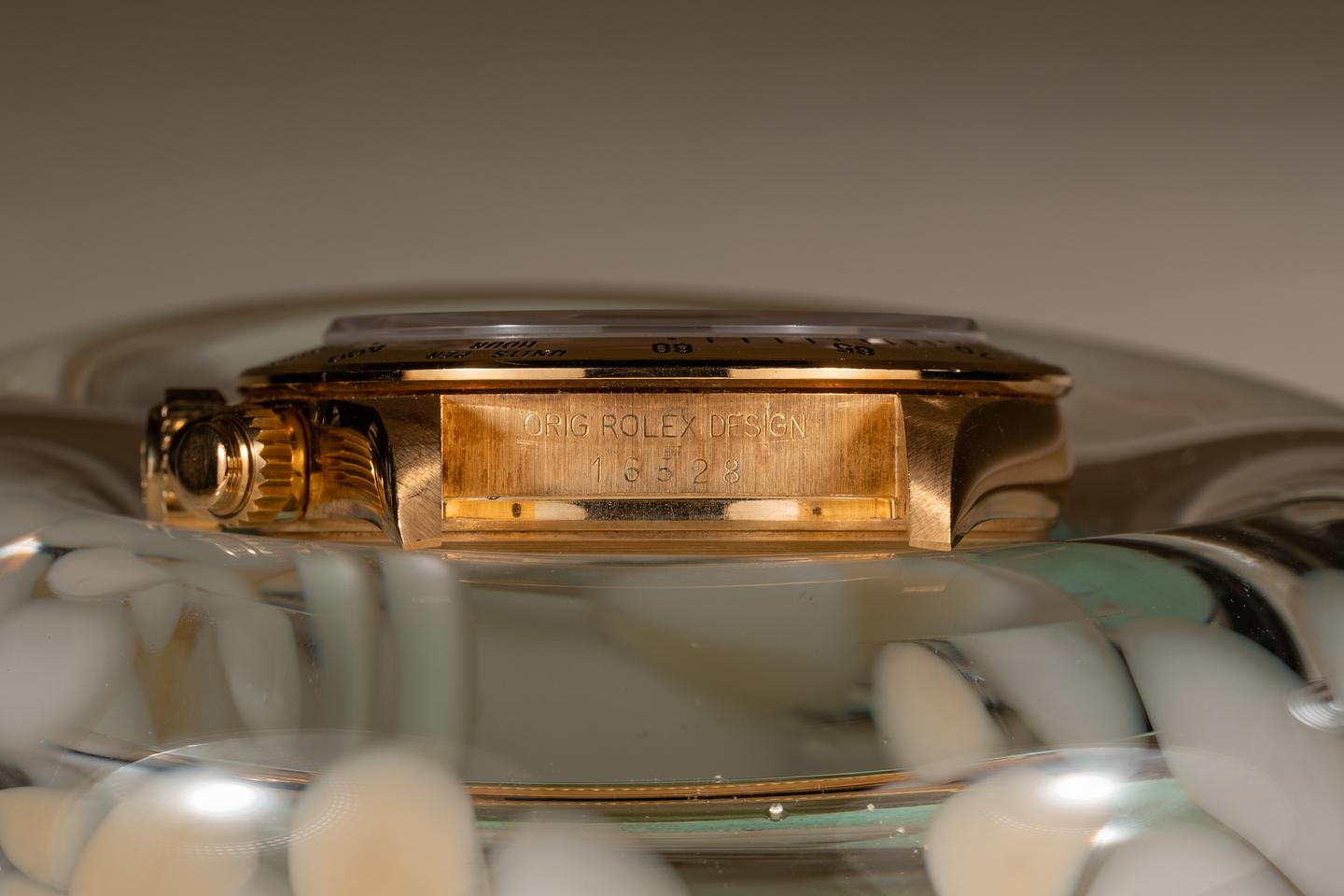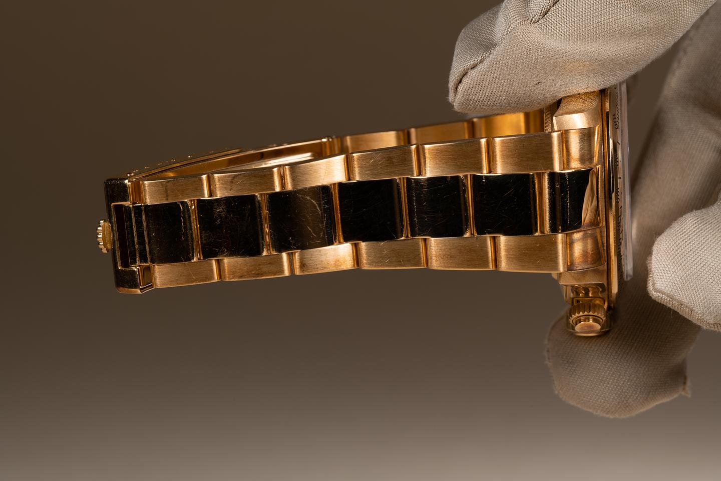 Bracelet: The 12 link 18K yellow gold non flip lock early 16528 Oyster bracelet is excellent showing only very light stretch for its age. The clasp is stamped with a matching 1991 date code.