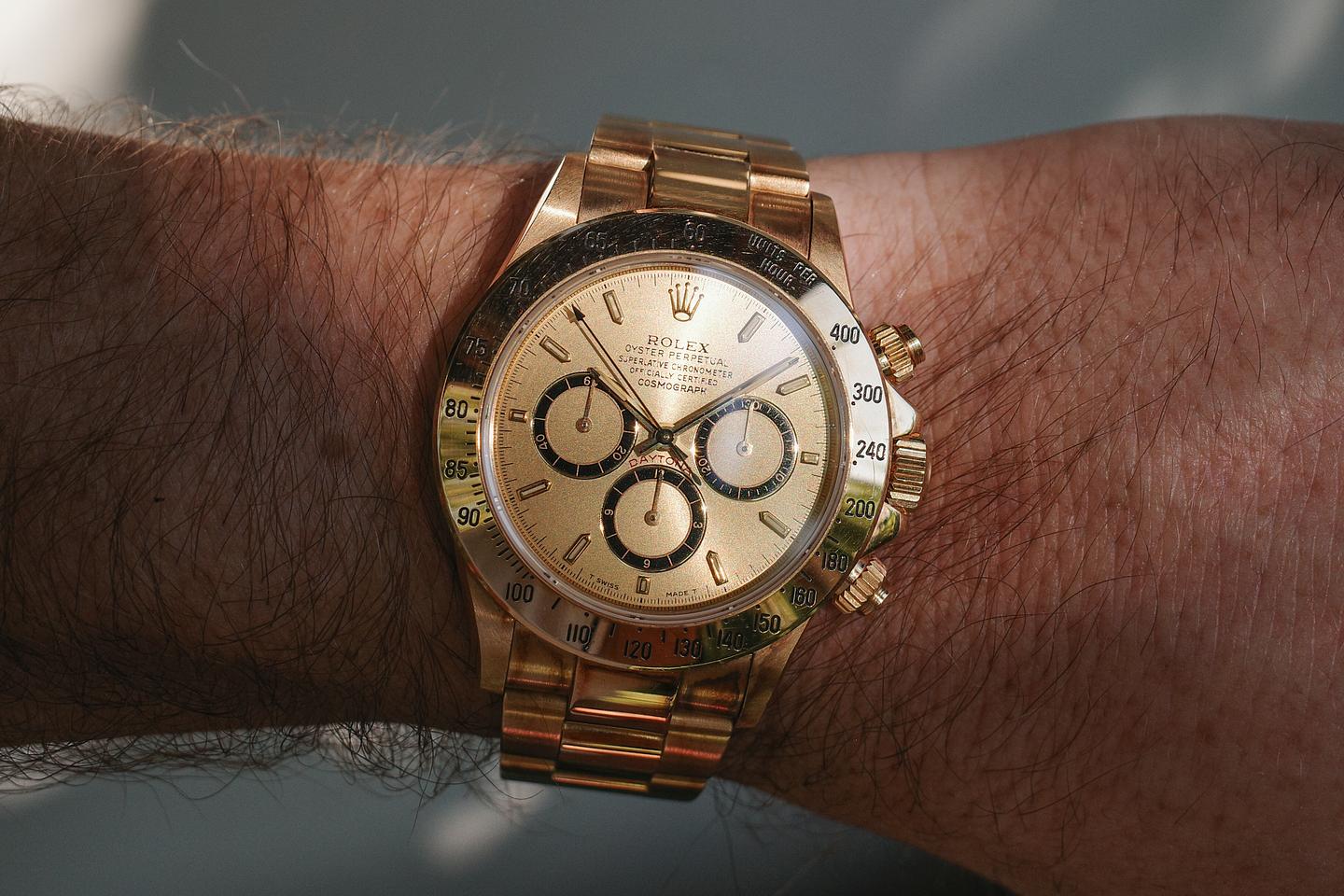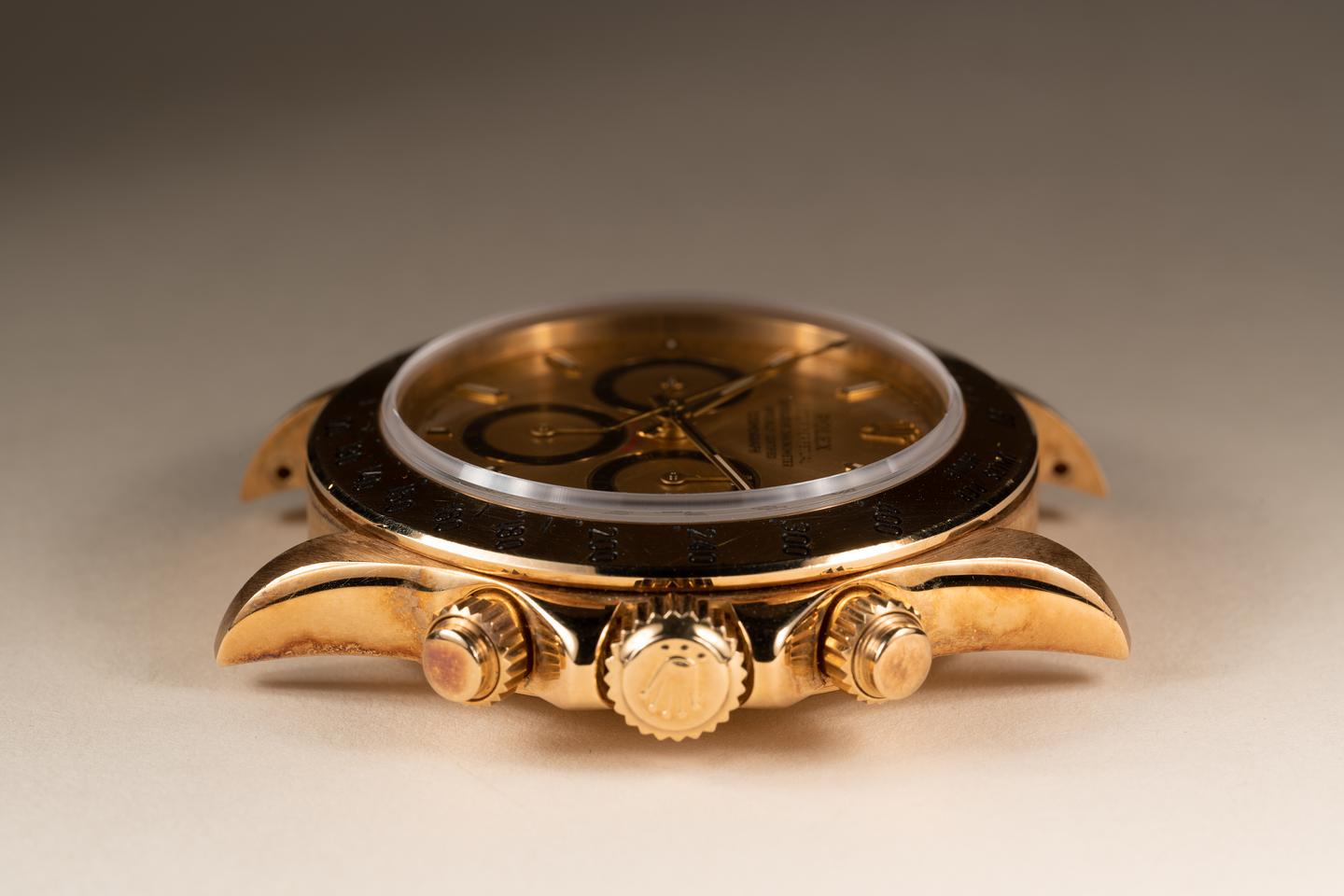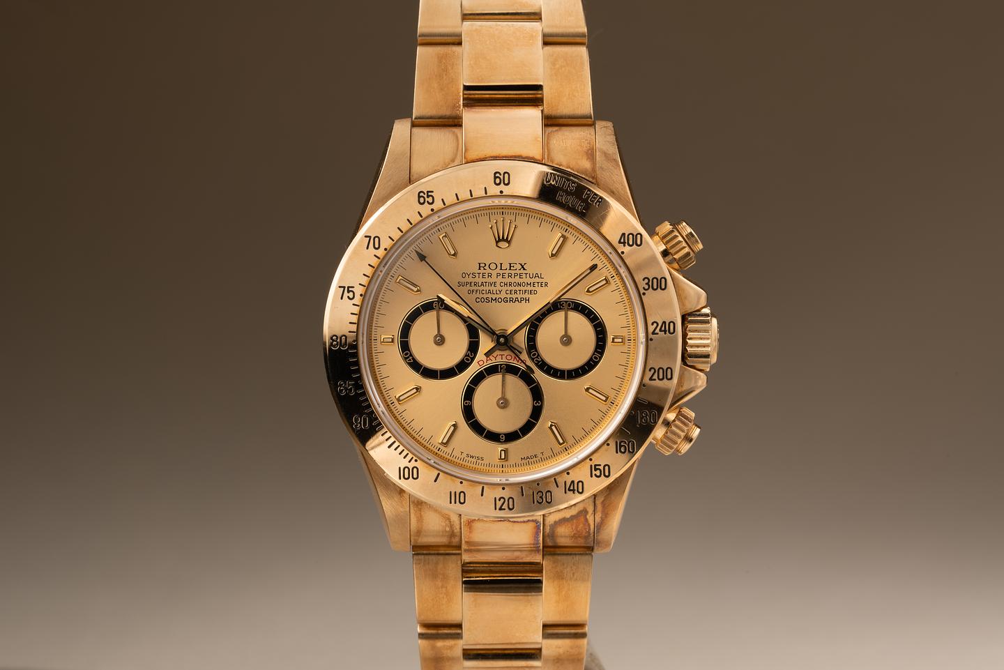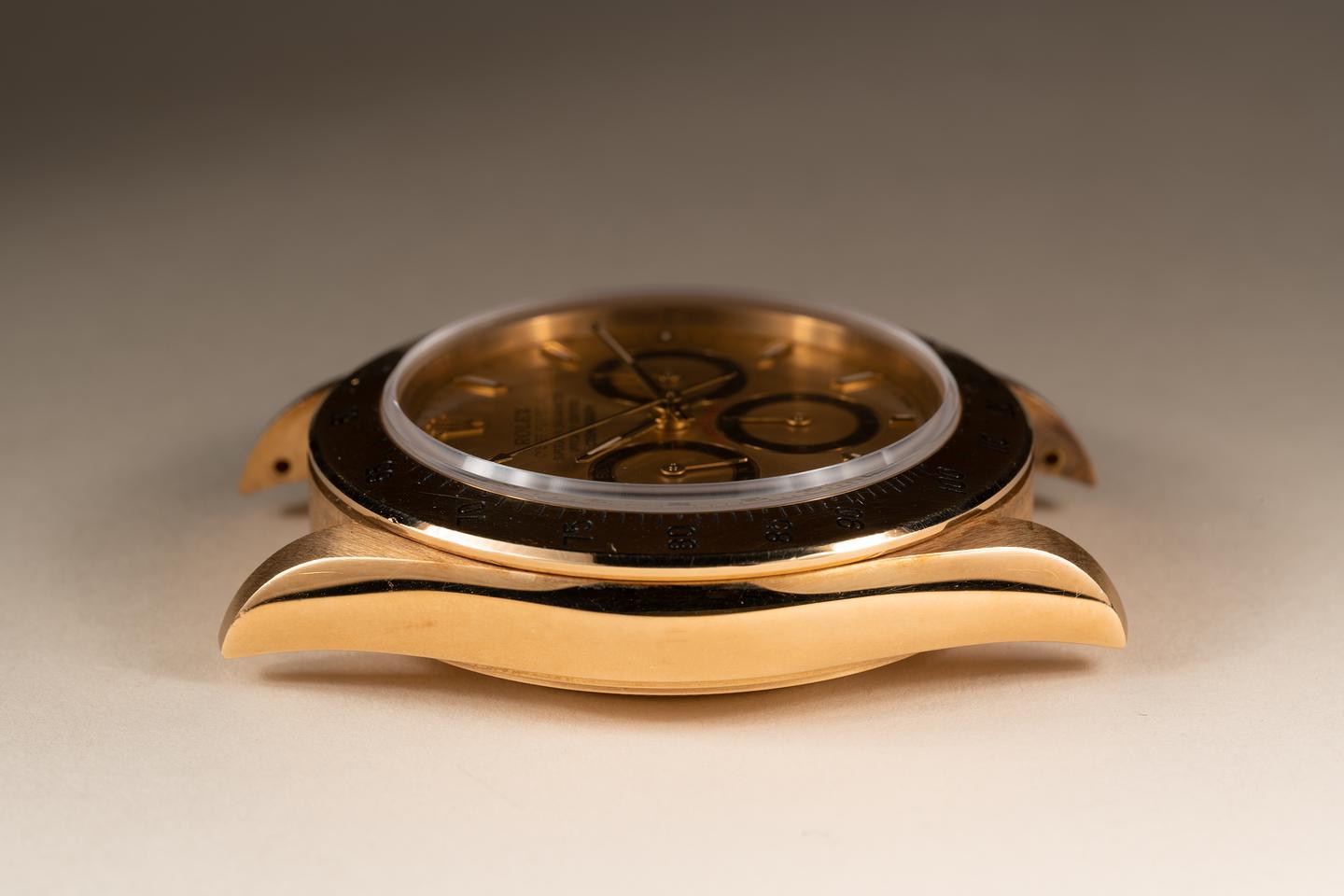 Bracelet: The 12 link 18K yellow gold non flip lock early 16528 Oyster bracelet is excellent showing only very light stretch for its age. The clasp is stamped with a matching 1991 date code.