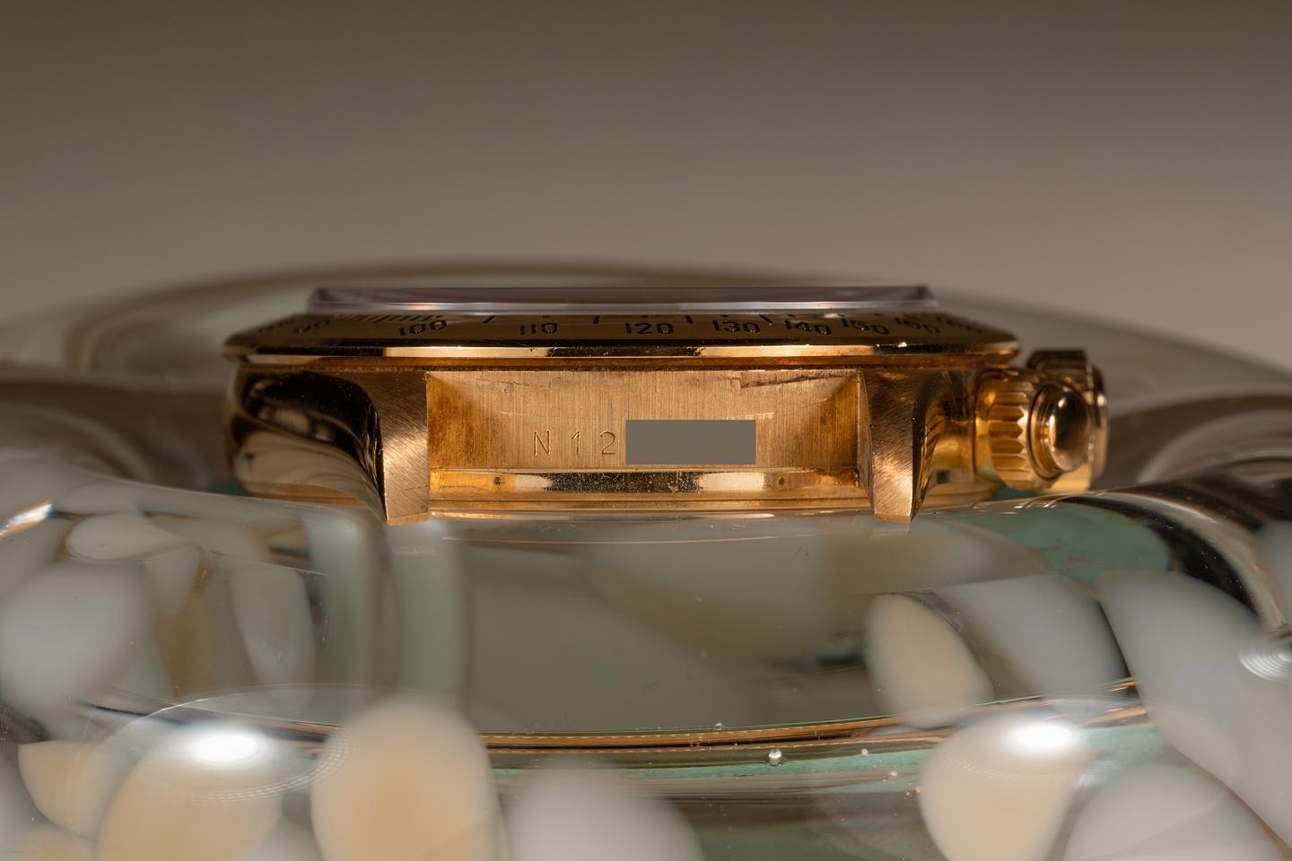 Case: The thick and even 18k yellow gold case is excellent showing a warm rost patina and only light wear from use. The 18k yellow gold bezel is also in excellent condition with a warm rosy patina that matches the case perfectly.