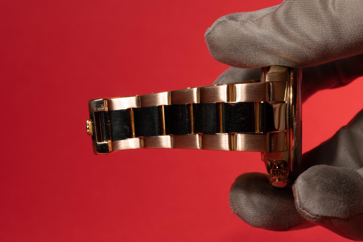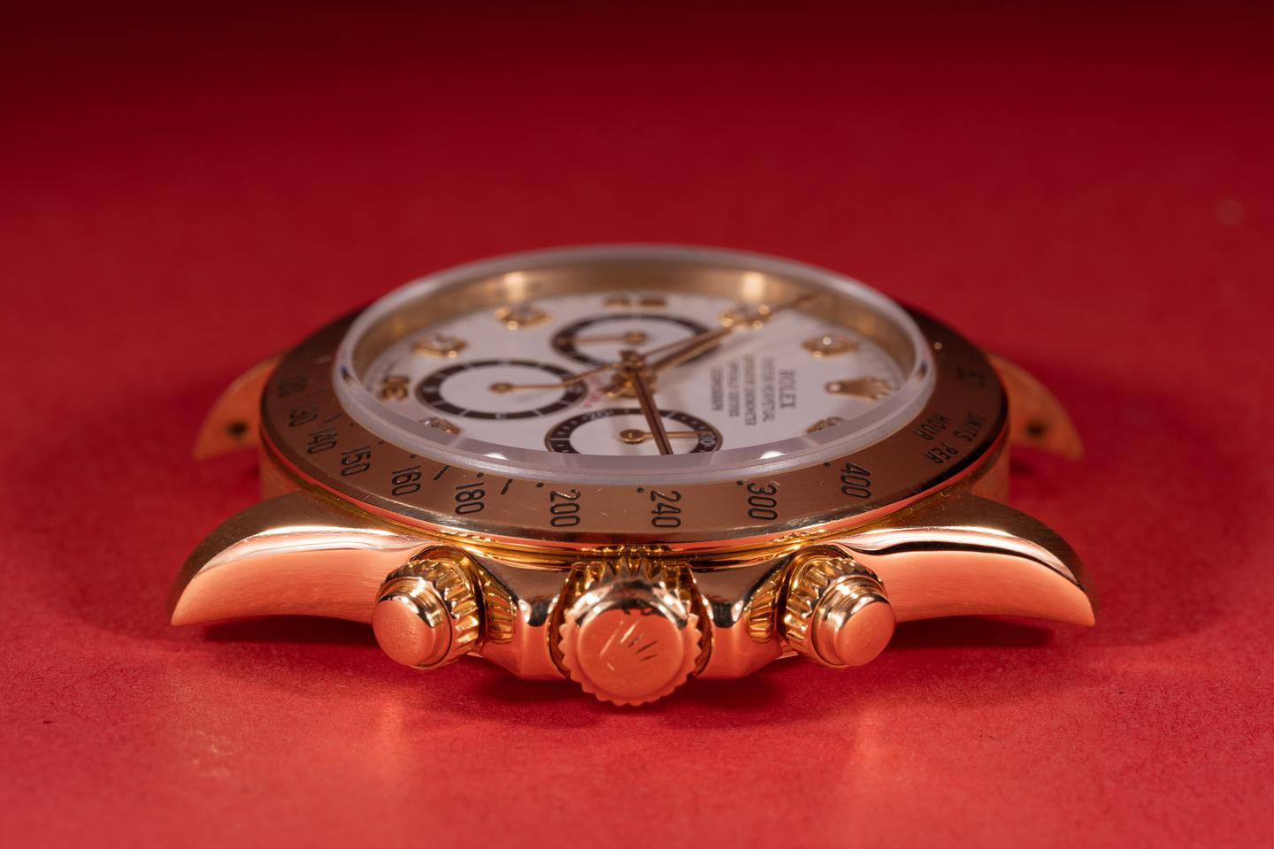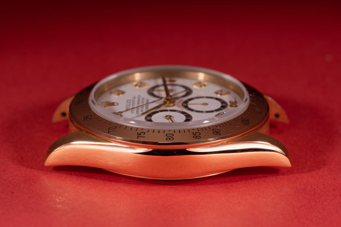 Case: The thick sharp and even case is excellent showing only very light wear from use. The 18k yellow gold bezel is also in excellent condition showing only very light wear from use.