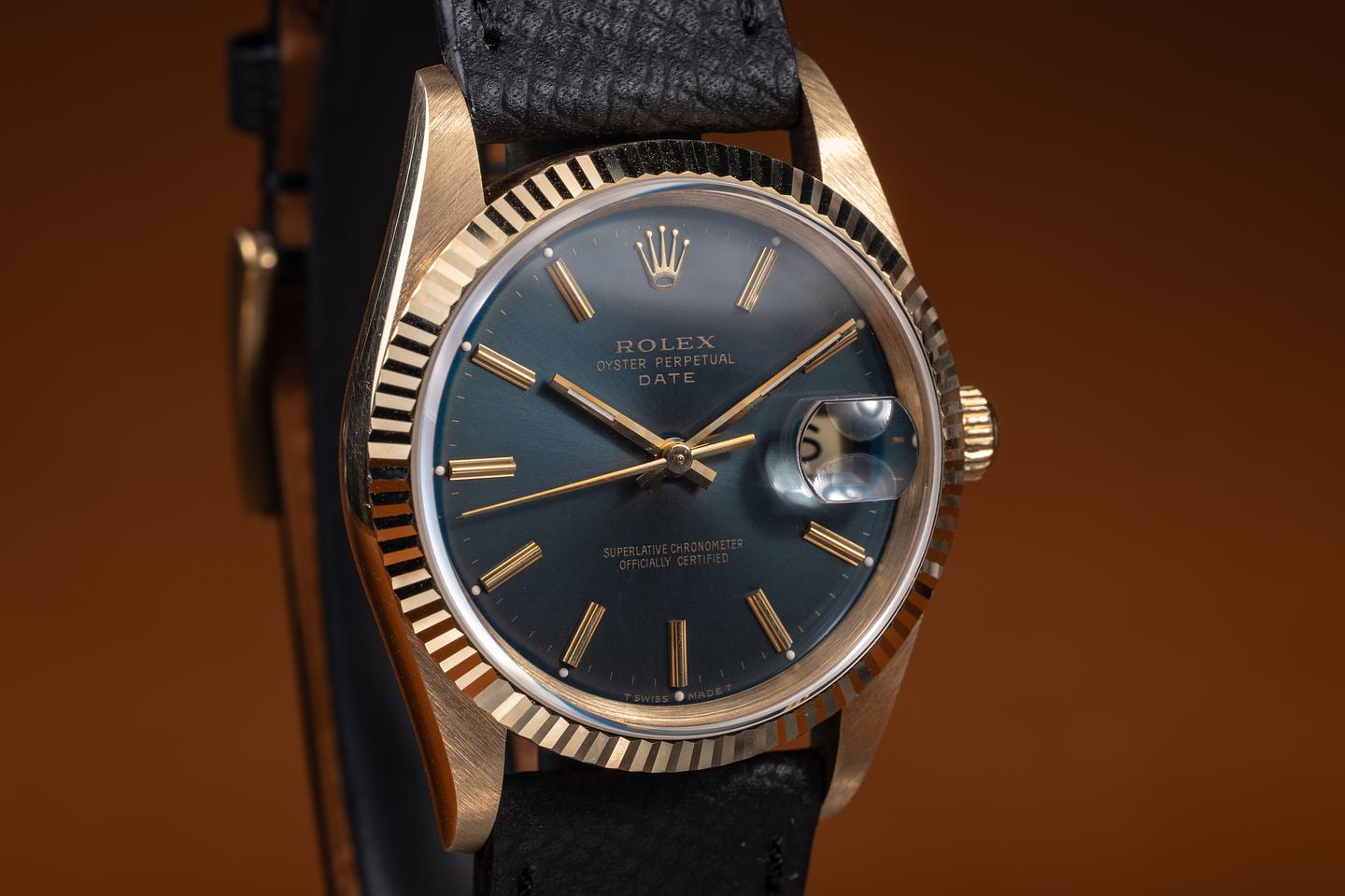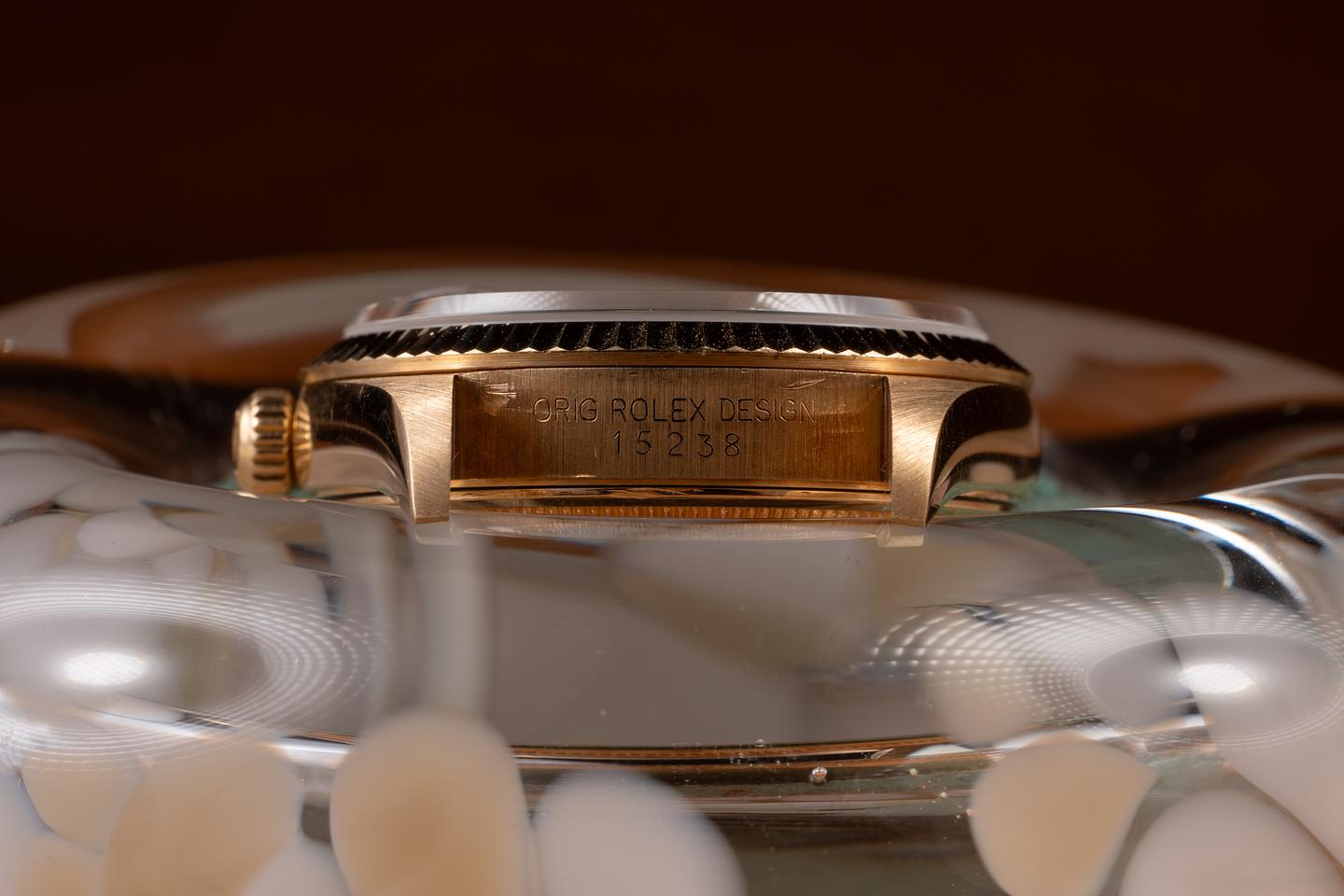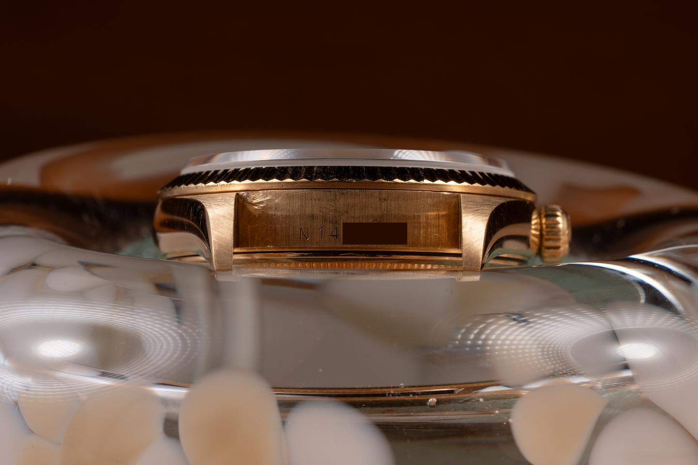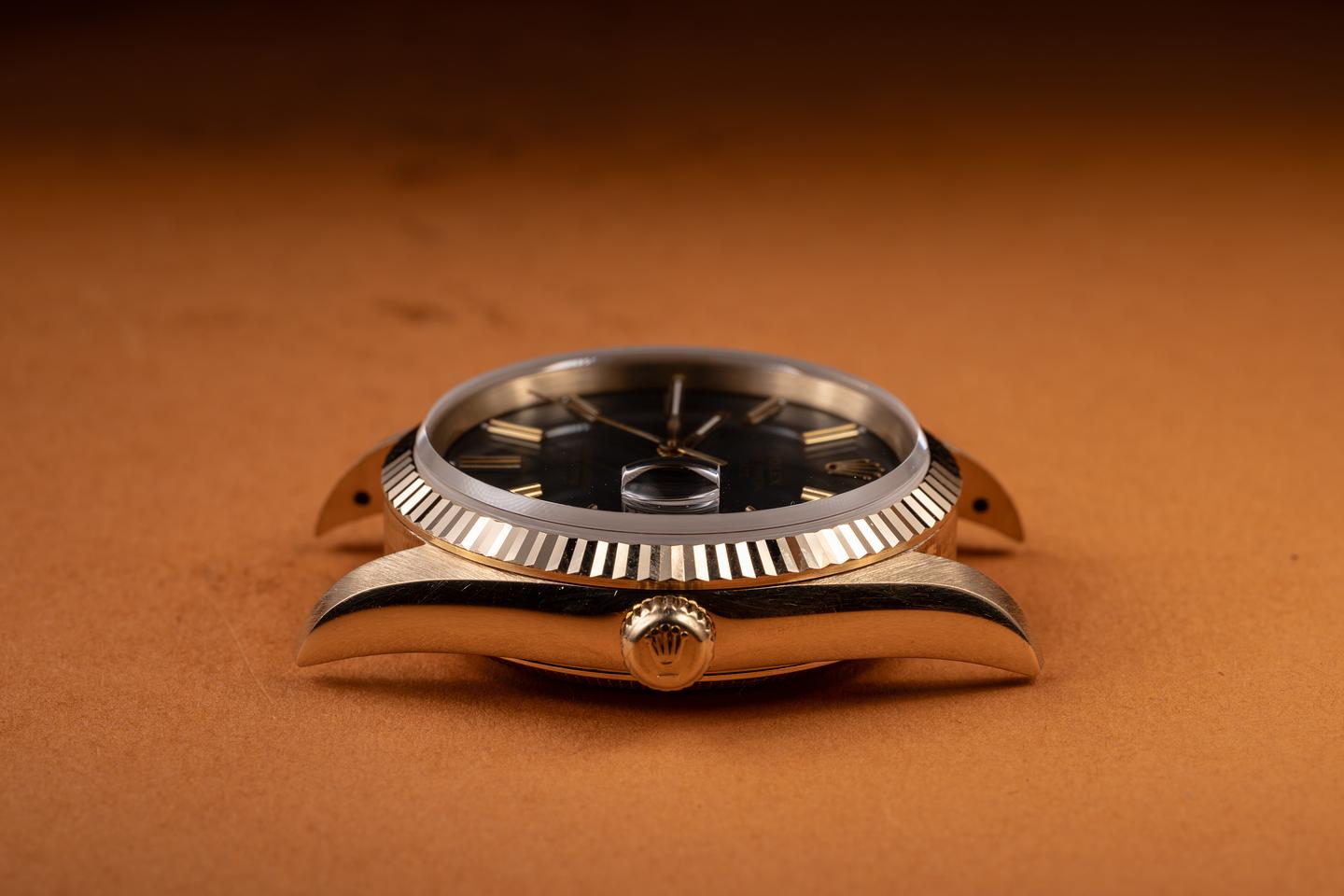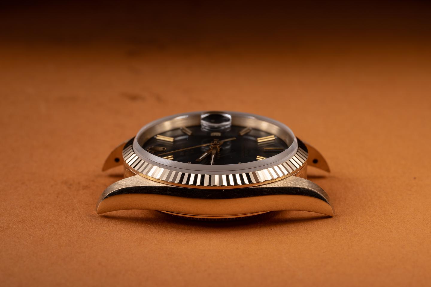 Case: The sharp 34mm 18K yellow gold case is excellent showing only very light wear. The sharp 18K yellow golf fluted bezel is also in excellent condition showing only very light wear.