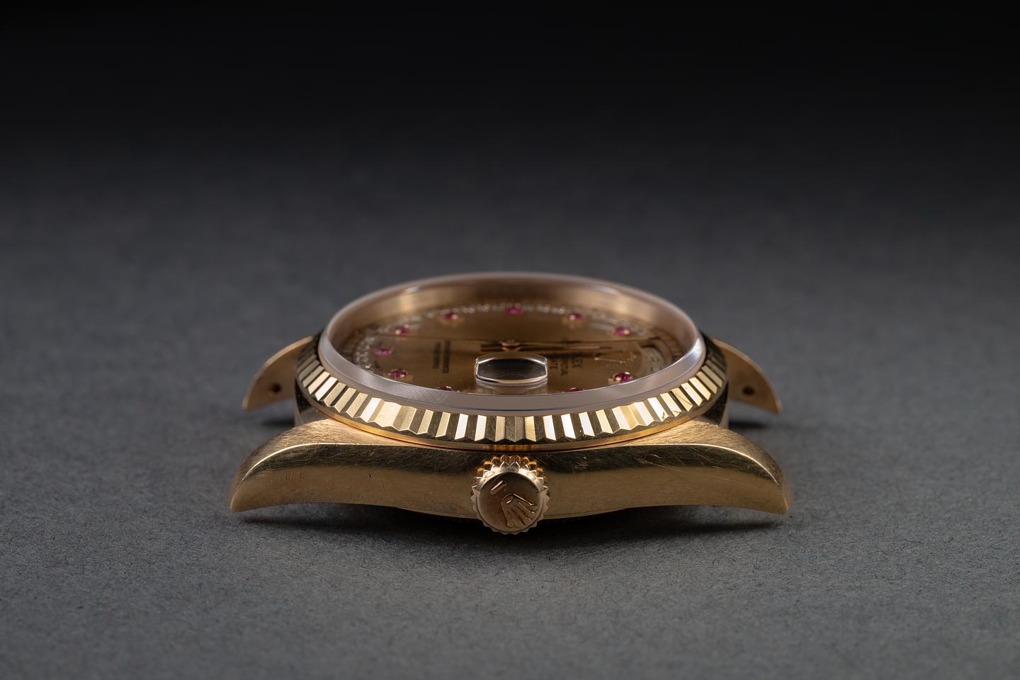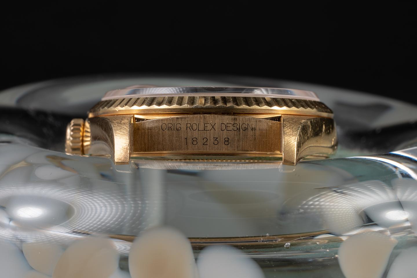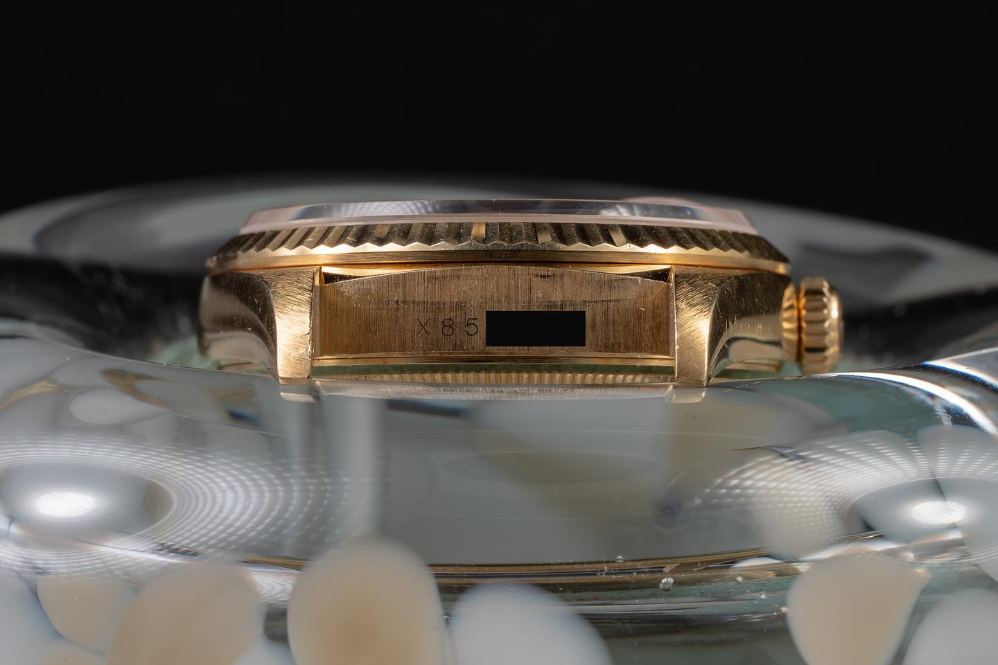 Case: The unpolished 18K yellow gold case is excellent, showing only light wear from use. The sharp, unpolished 18K yellow gold fluted bezel is also in excellent condition, showing only light wear from use.