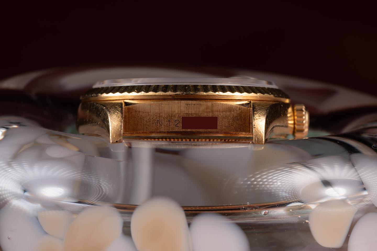 Case: The sharp, unpolished 18K Yellow gold case is excellent, showing average wear from use. The sharp, unpolished 18K yellow gold fluted bezel is also in excellent condition, showing average wear from use.