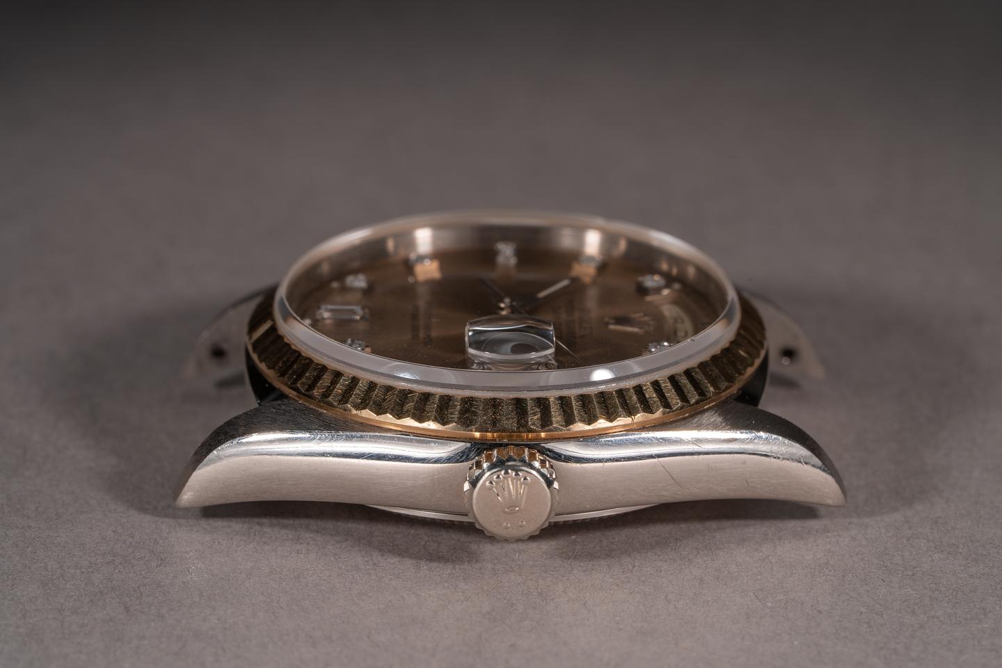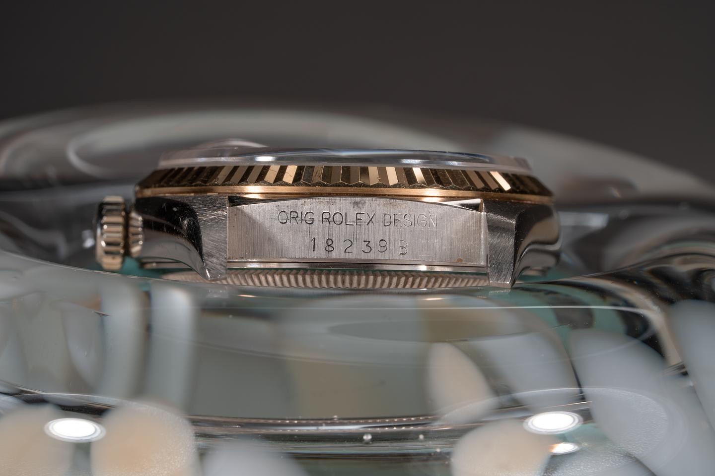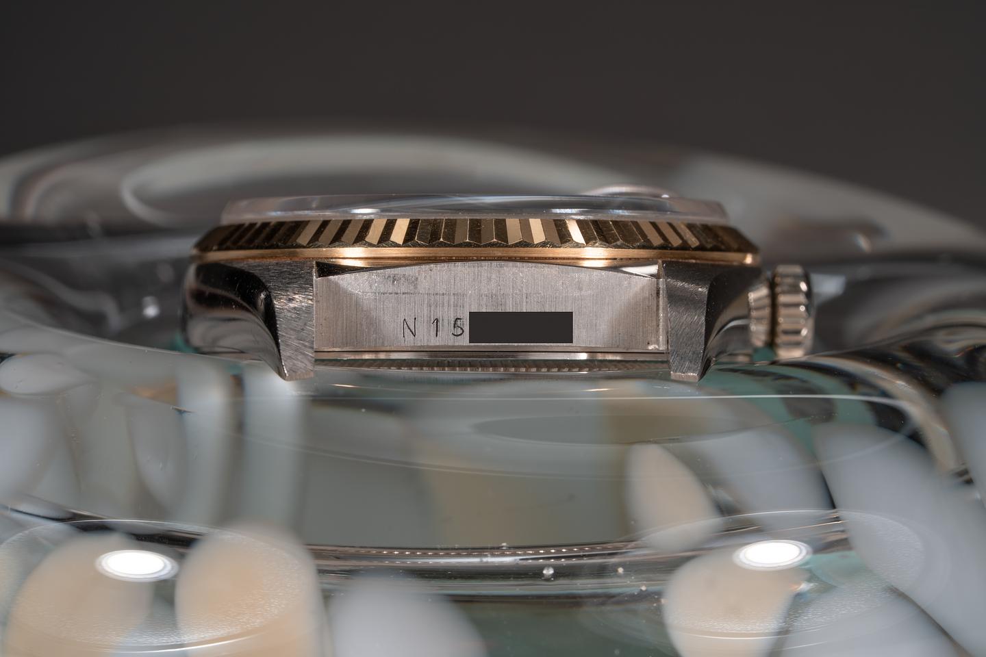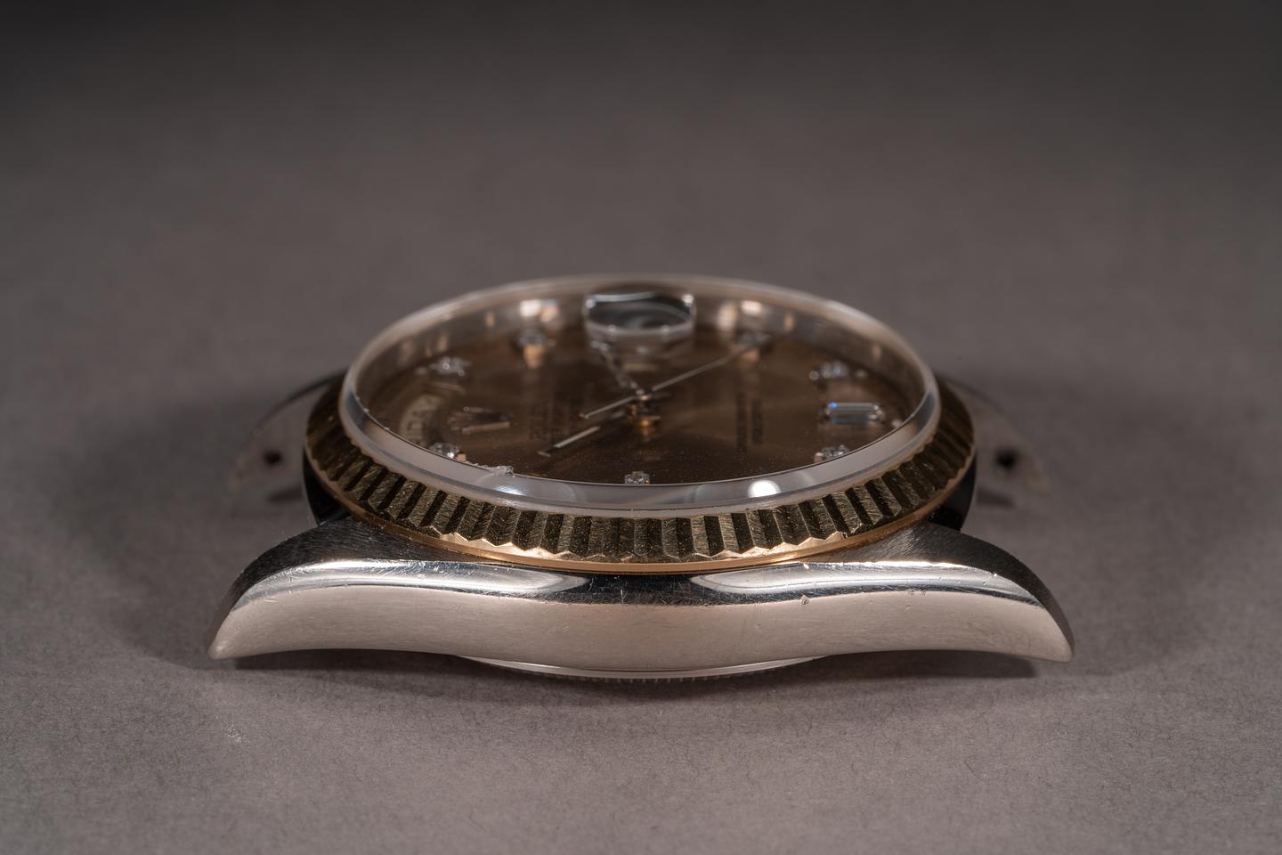 Case: The excellent 18k white gold case been polished in the past and shows some light wear from use. The 18k yellow gold bezel is sharp showing only light were from use.