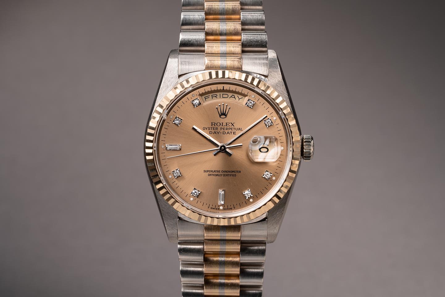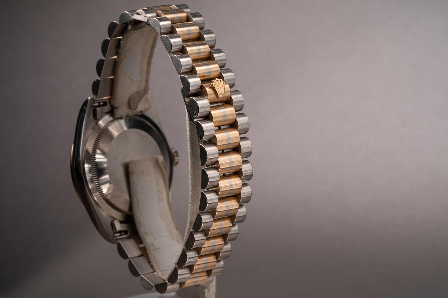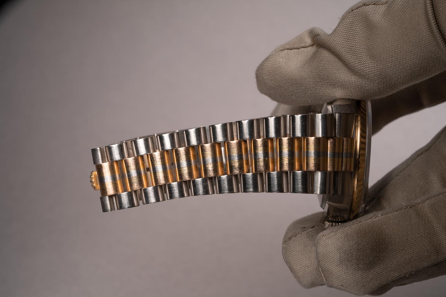 Bracelet: The 23 link 18k white, yellow, and rose gold president bracelet is excellent showing some light stretch for its age.