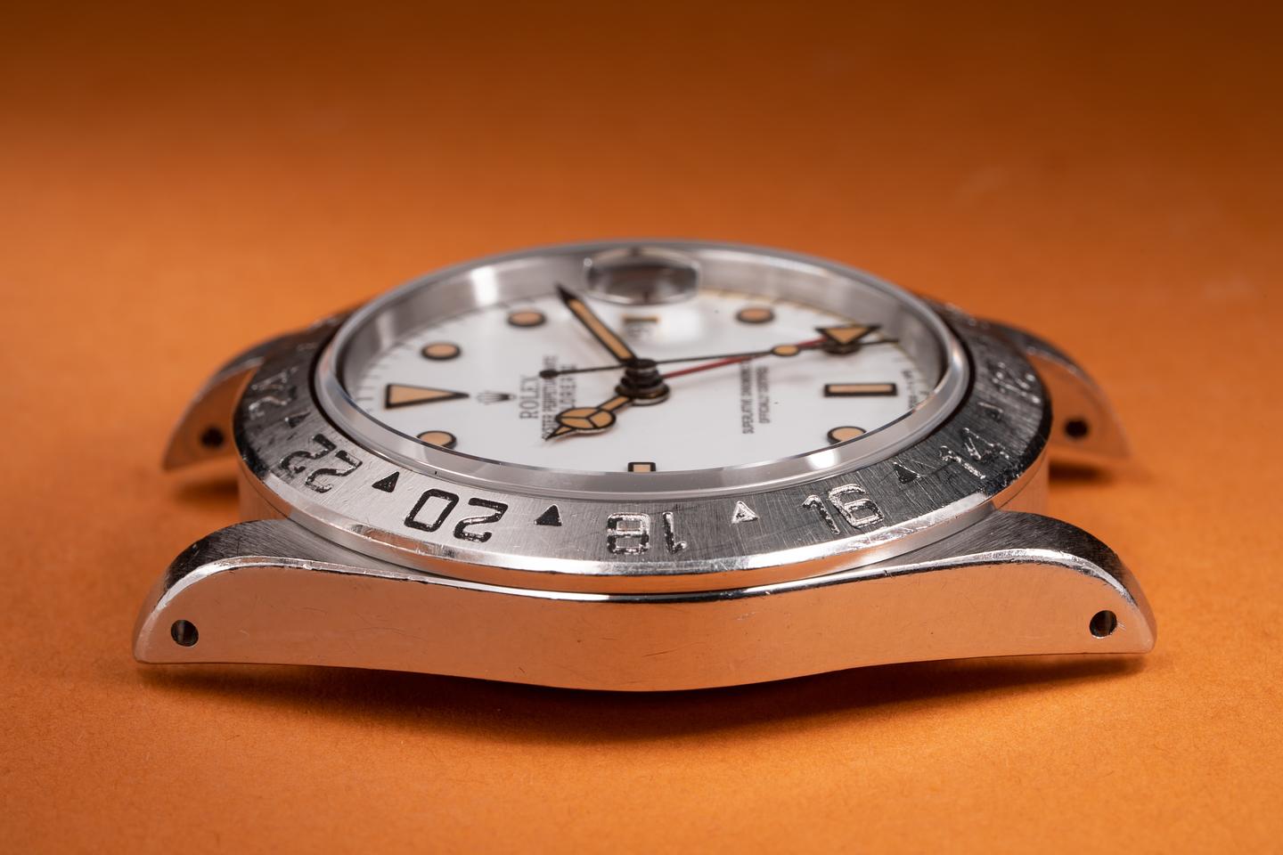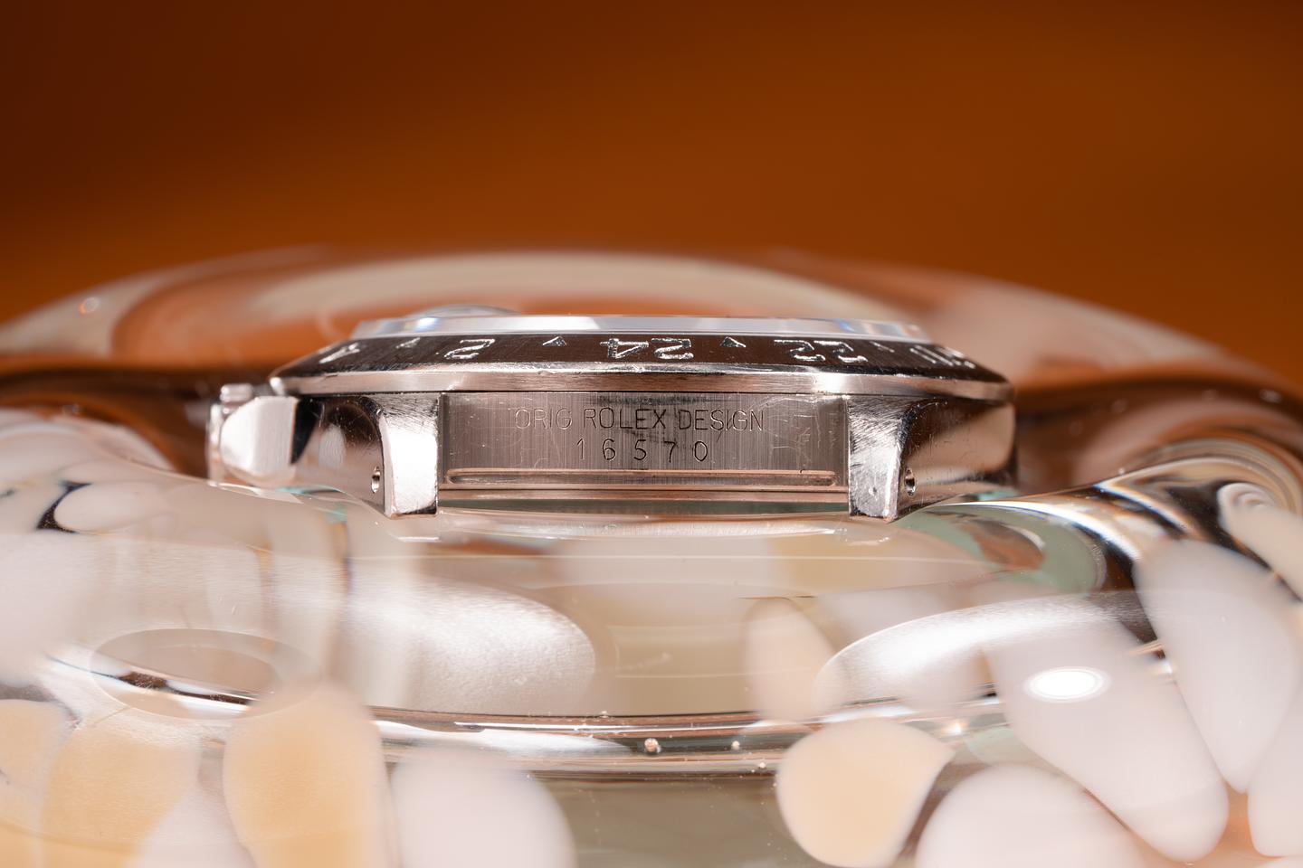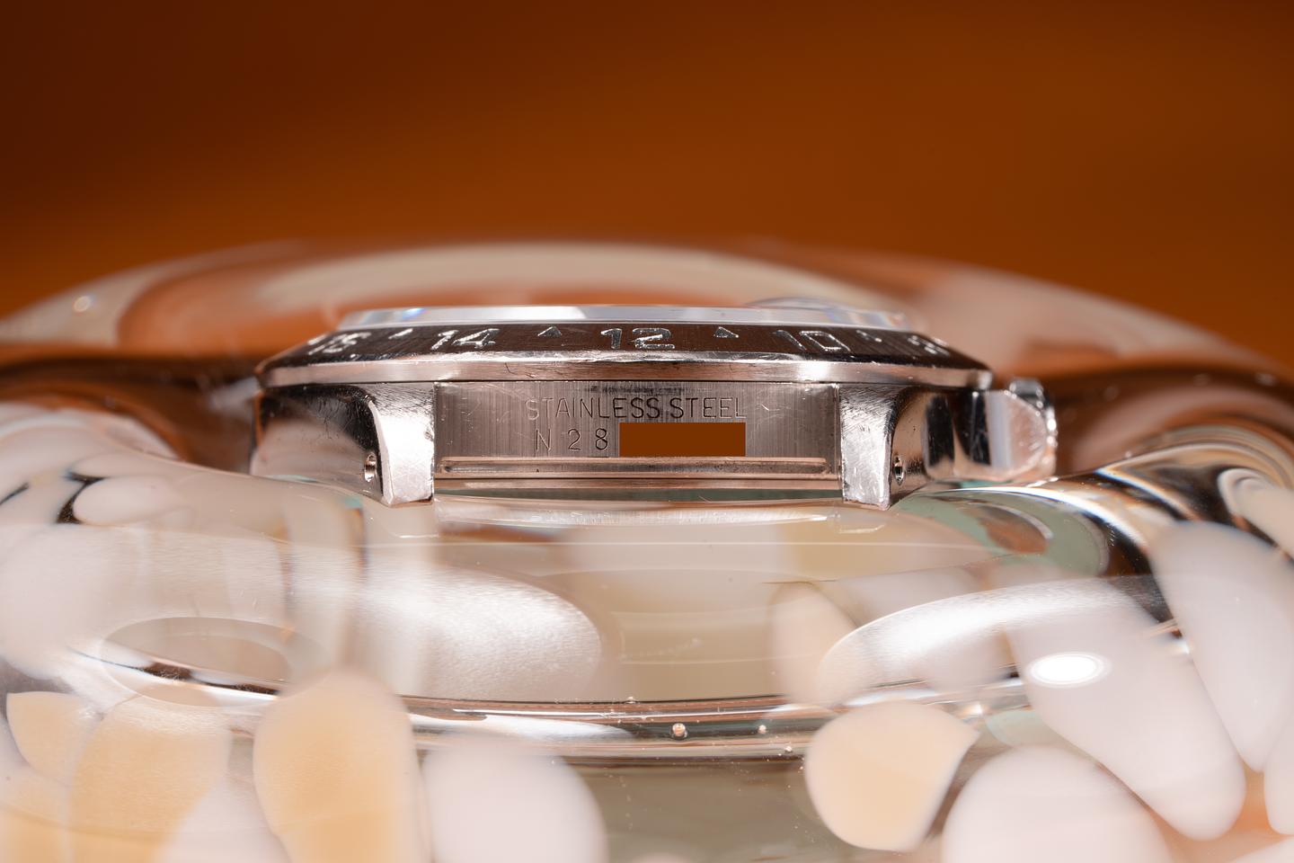 Case: The thick and even case is excellent and appears to be unpolished showing intact factory bevels. The case shows a bright semi-sleeve polished finish and shows some wear from use. The stainless bezel is also in excellent condition with an intact factory sunburst finish.