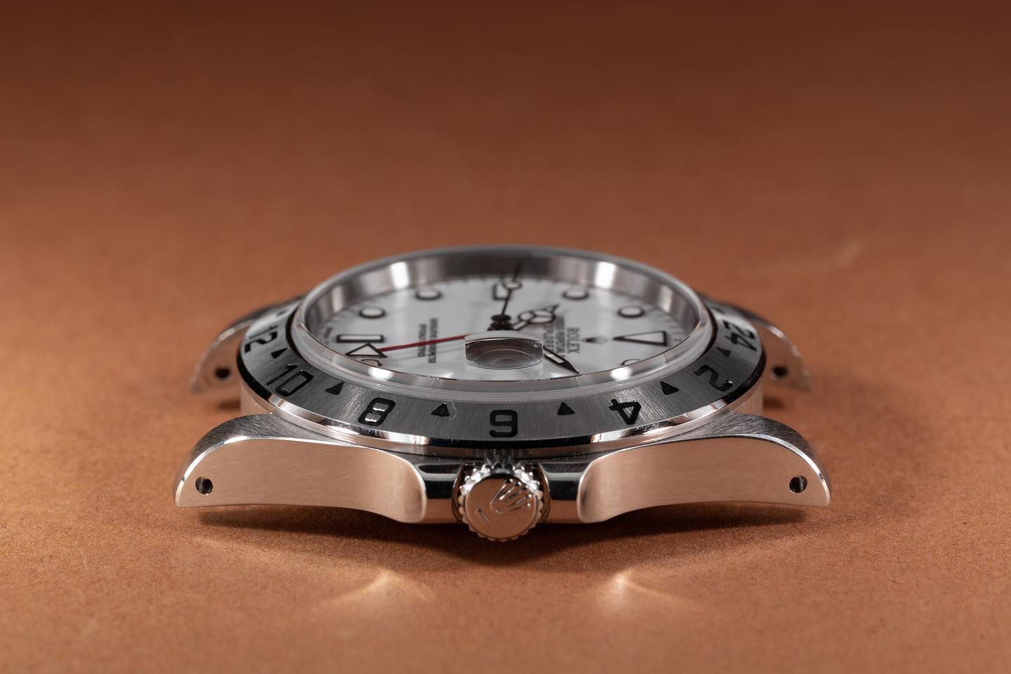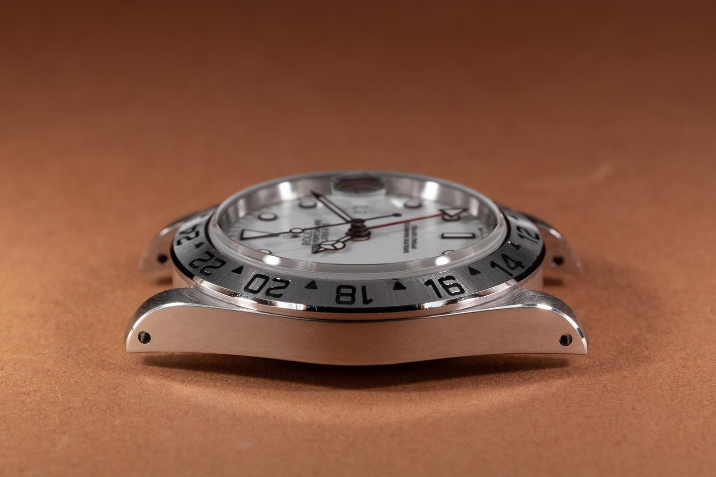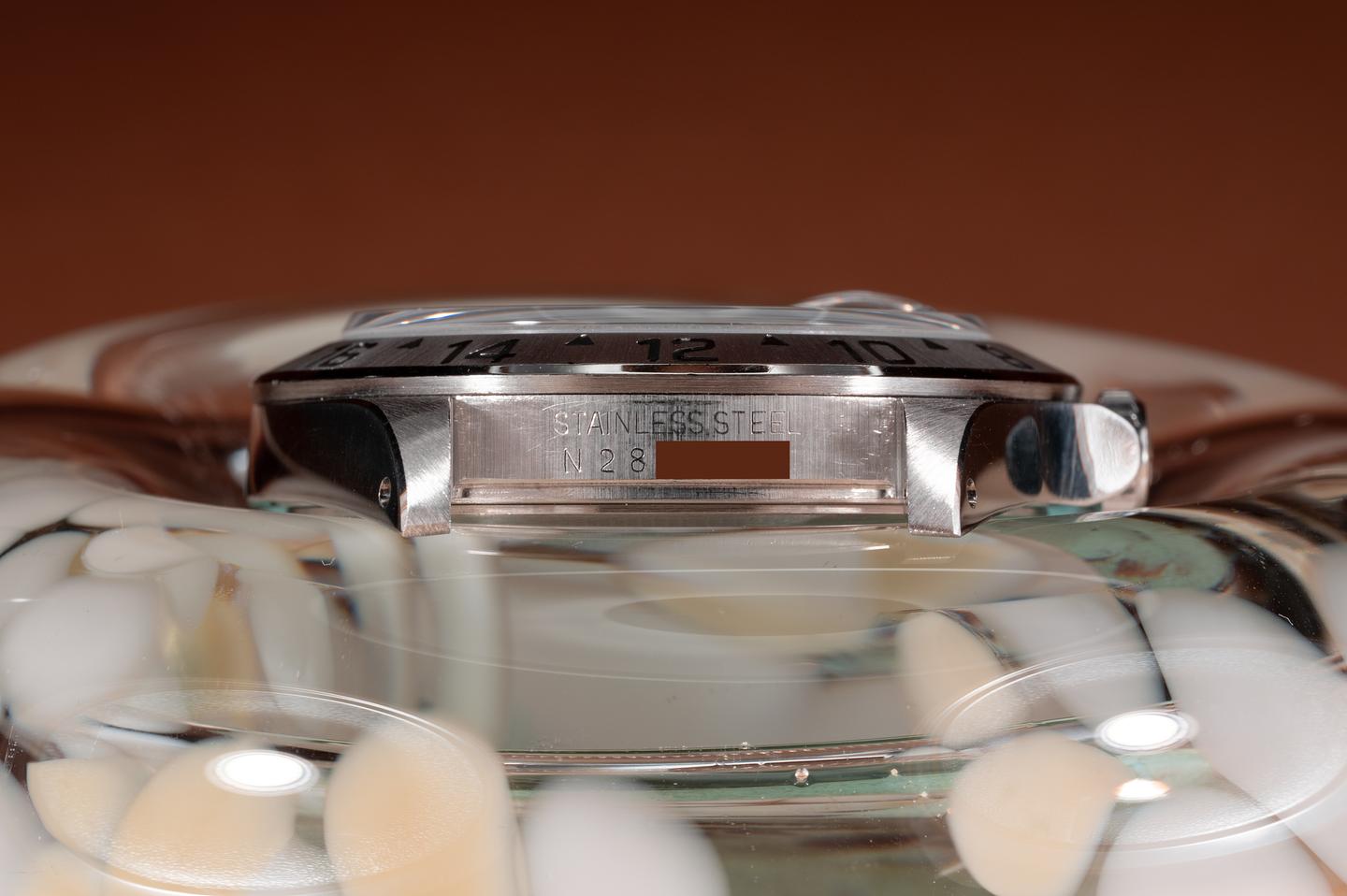 Case: The thick and even case has just returned from polishing showing sharp prominent bevels. The stainless bezel is also in excellent condition showing a sharp well defined sunburst finish.