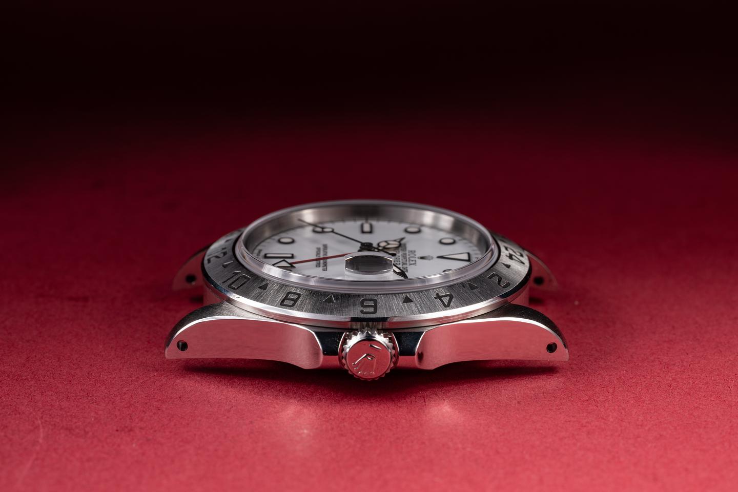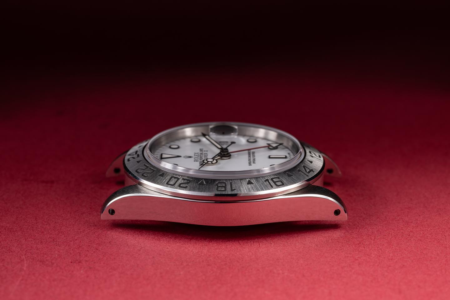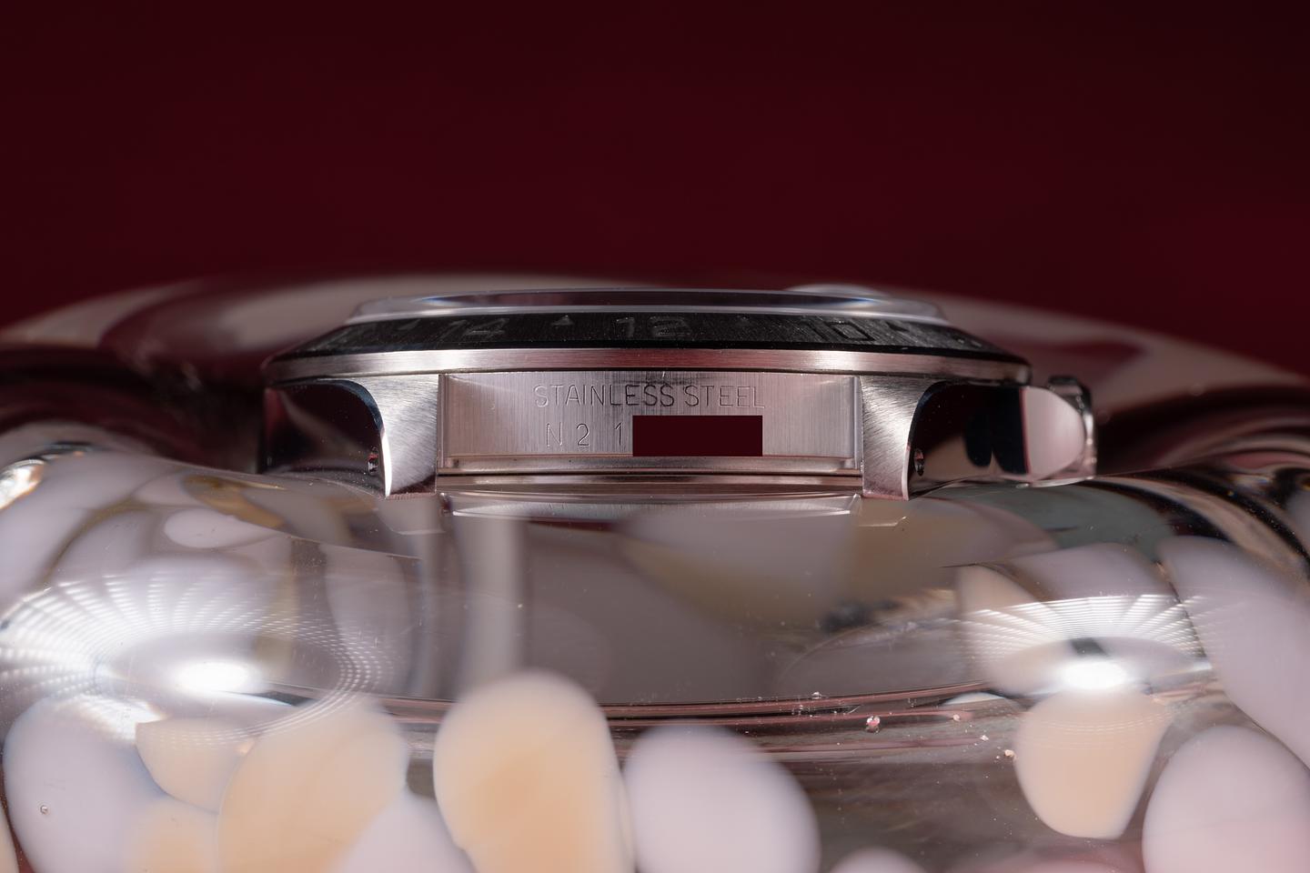 Case: The recently polished case is excellent, showing sharp, prominent bevels and only very light wear. The sharp stainless bezel is also in excellent condition, showing a sharp, well-defined sunburst finish and only very light wear.