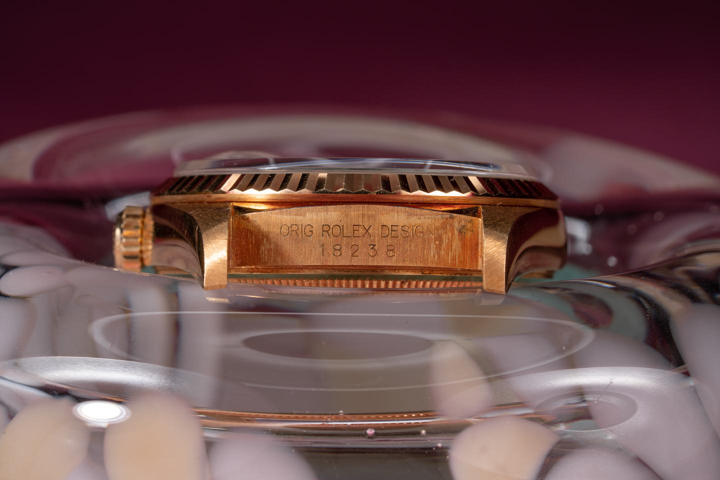 Case: The unpolished 18k yellow gold case is excellent showing a warm rosy patina and some light wear from use. There is a small indentation of the inside of the 1 o'clock lug. The 18k yellow gold fluted bezel is sharp showing only light wear from use.
