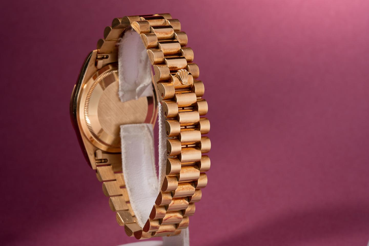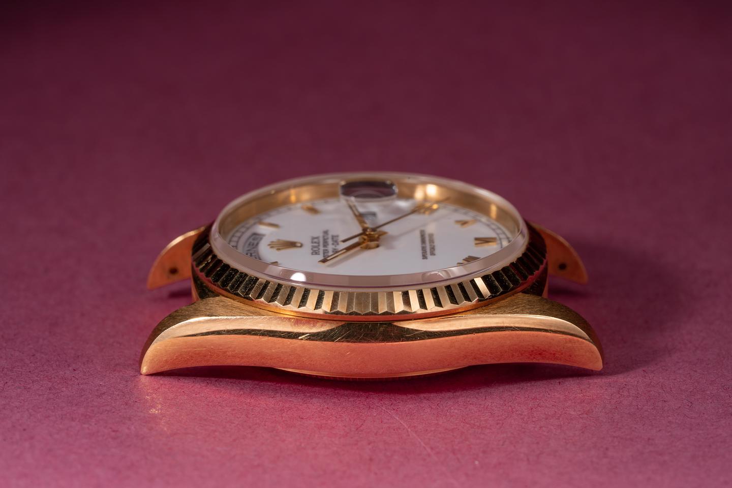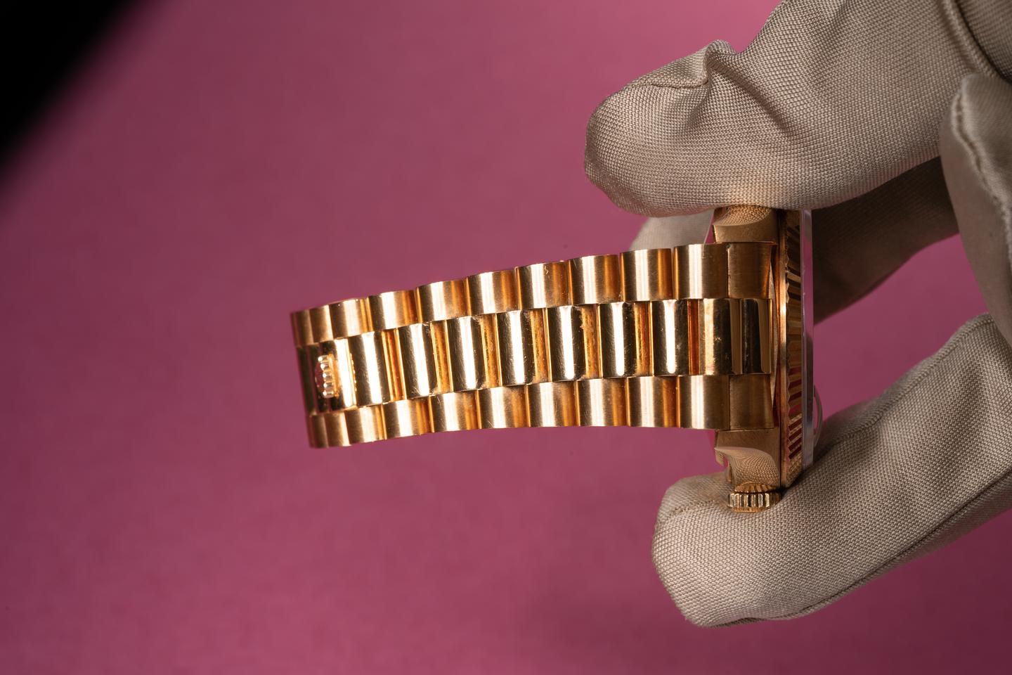 Bracelet: The 23 link 18k yg President bracelet is excellent showing only light stretch for its age. The clasp is stamped with a 1993 date code.
