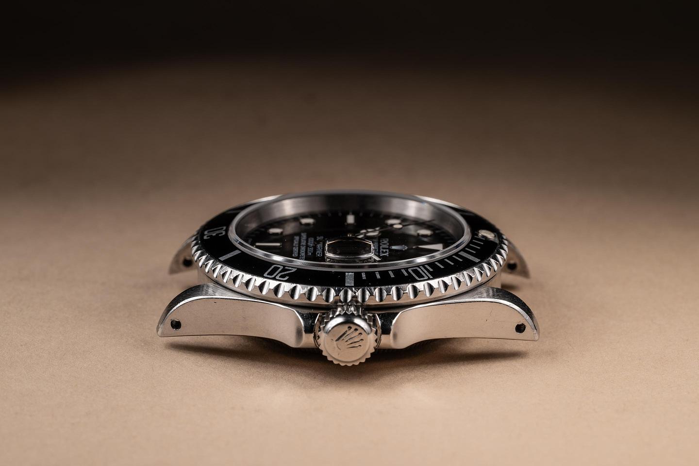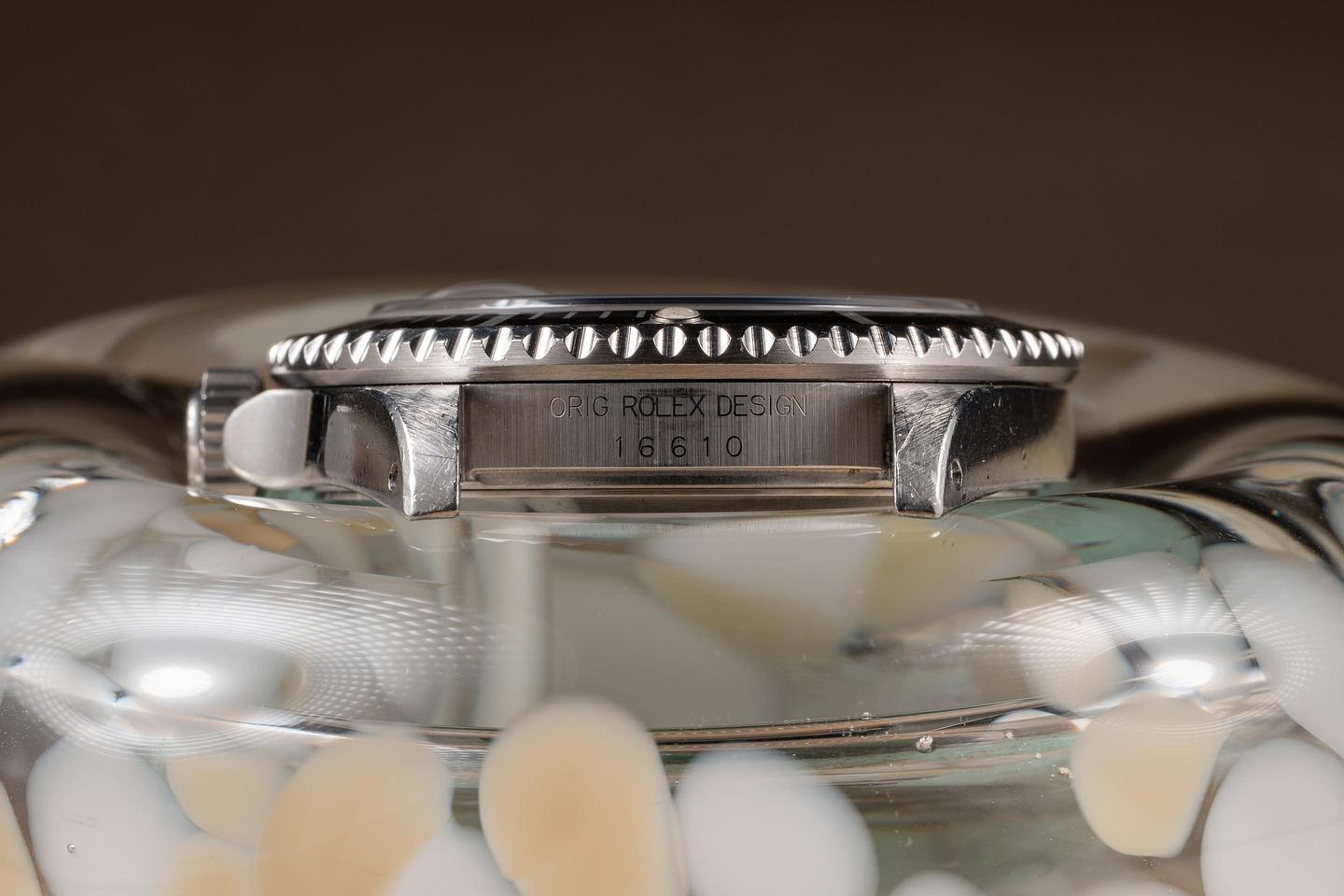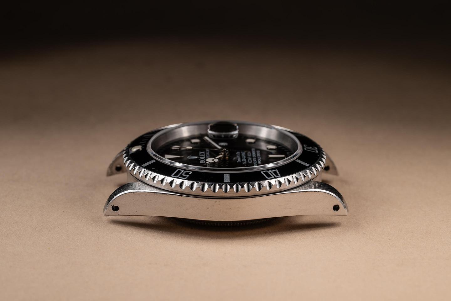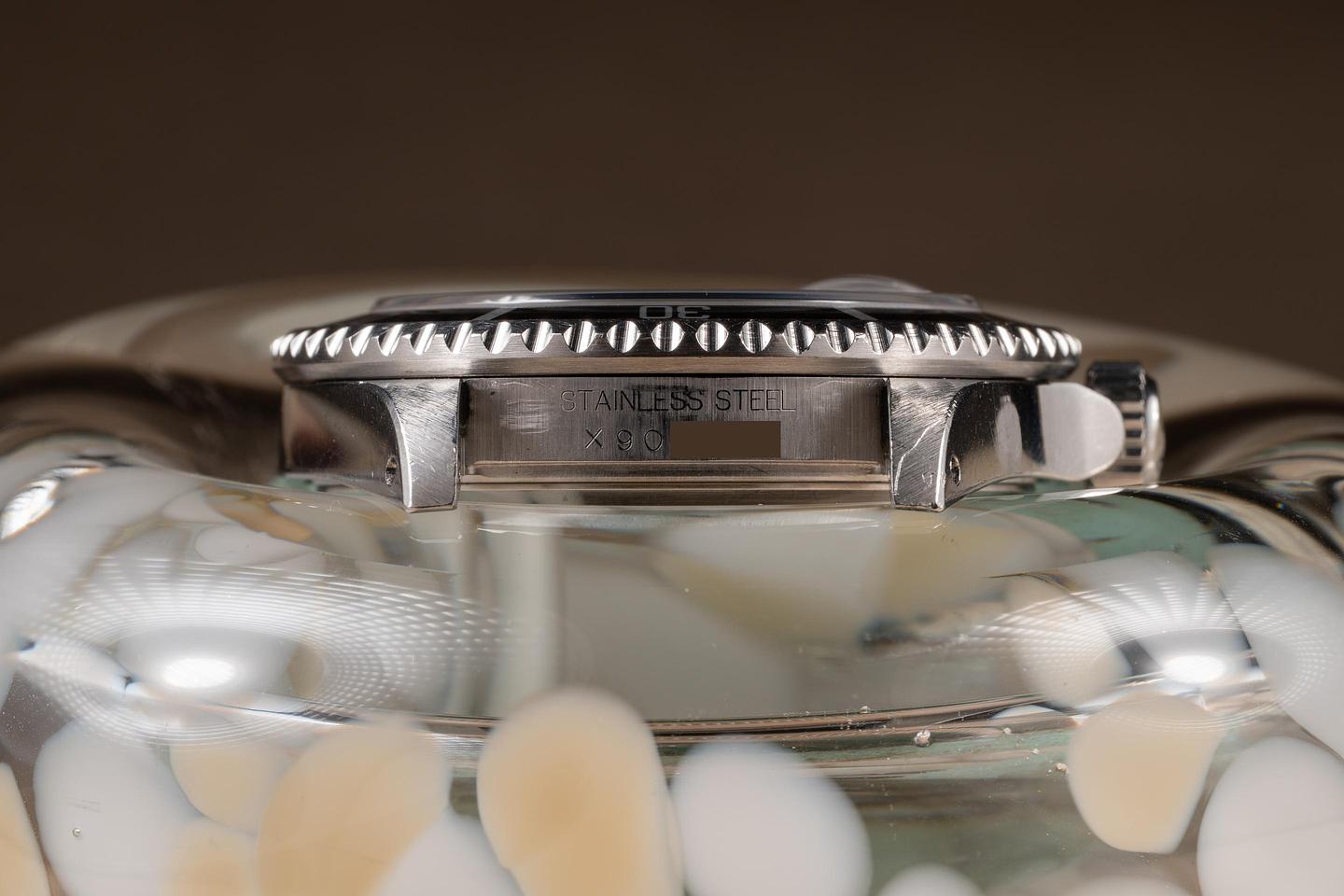 Case: The unpolished case is excellent, showing sharp prominent factory bevels and some light wear from use. The bezel insert is also in excellent condition and has faded to a dark navy blue hue, showing some light wear from use.