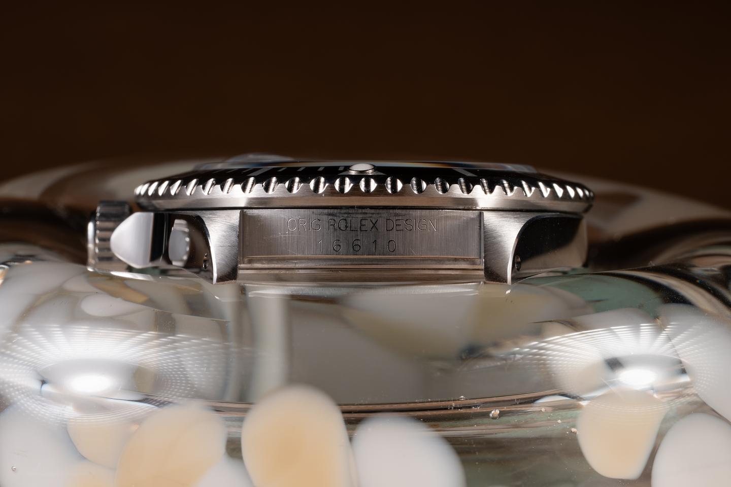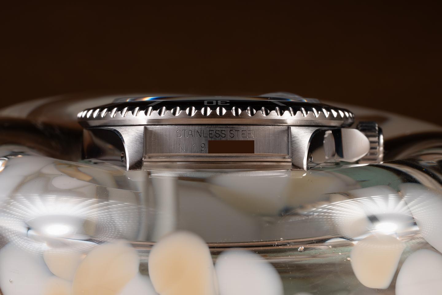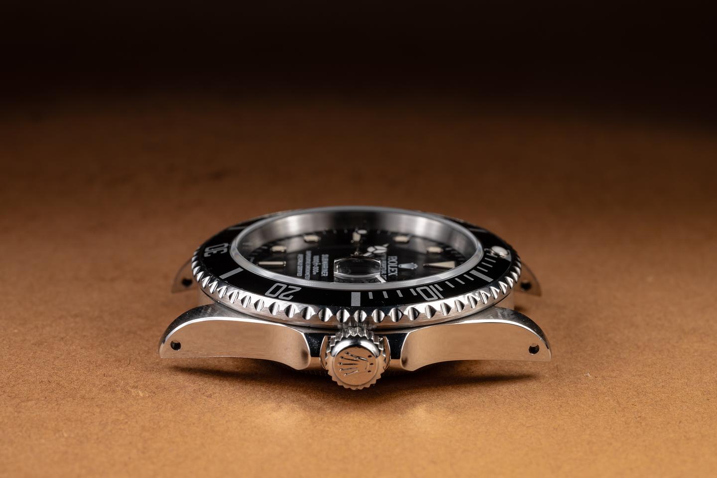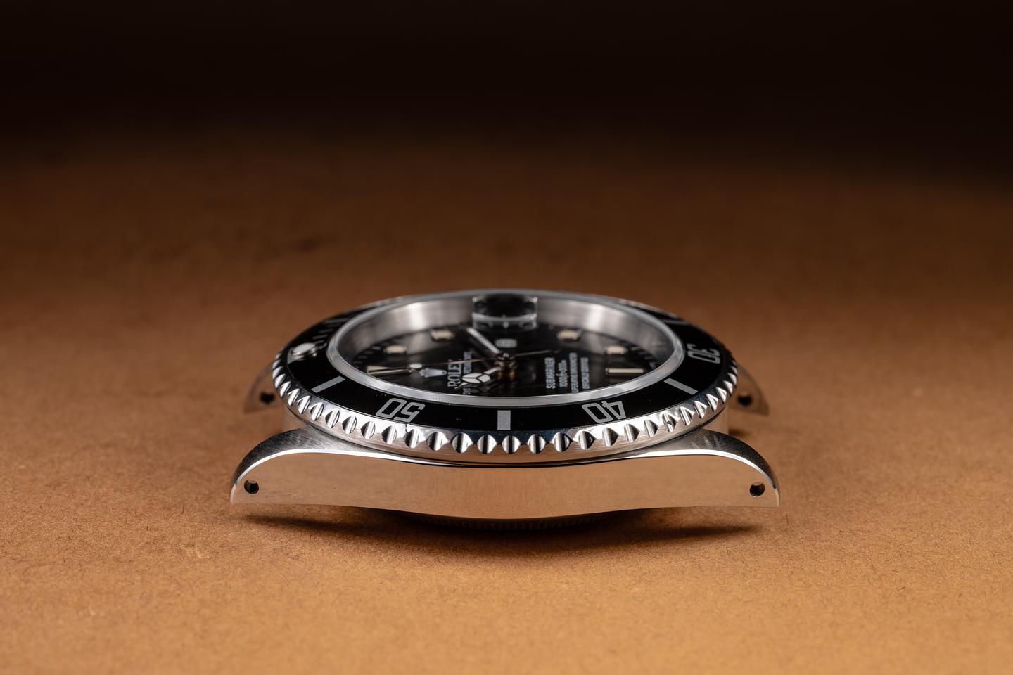 Case: The recently polished case is excellent, showing sharp, prominent bevels and only very light wear. The black bezel insert is also in excellent condition, showing only light wear from use.
