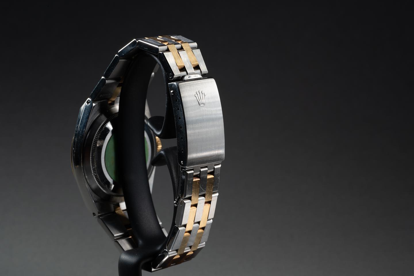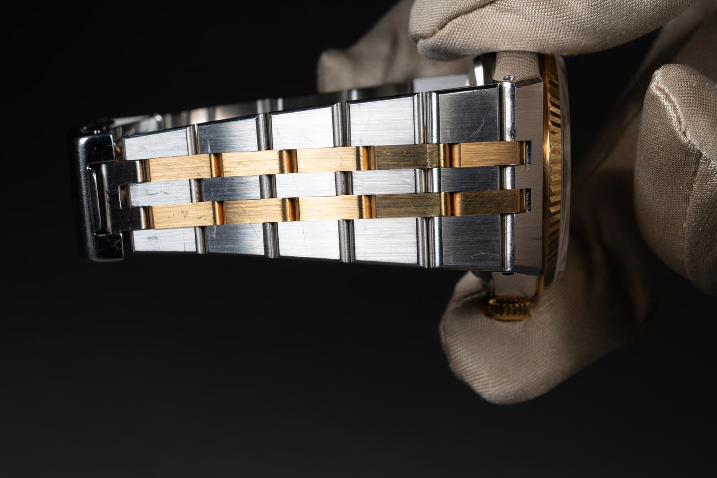 Case: The 36mm oyster quartz case is excellent showing prominent bevels and only light wear from use. The sharp 18k yellow gold fluted bezel is also in excellent condition showing only light wear from use.
