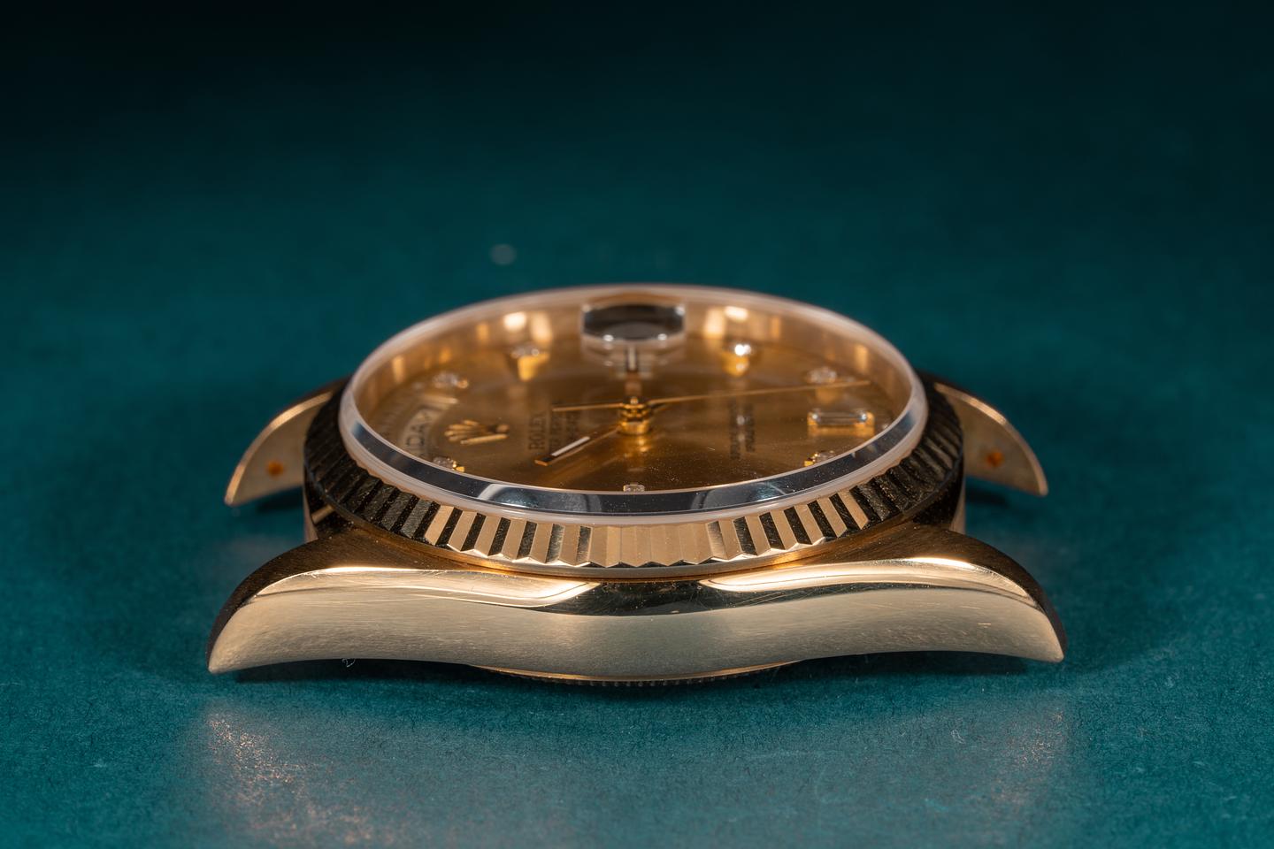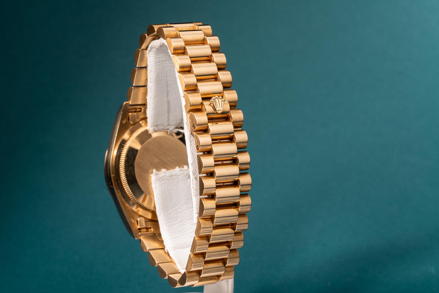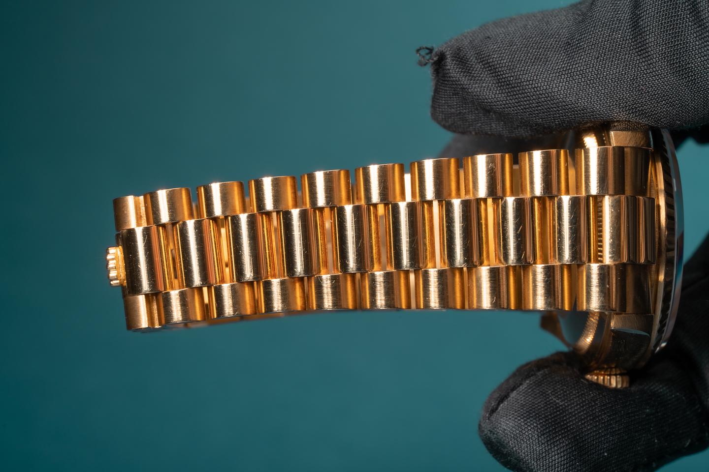 Bracelet: The 23 link 18k yellow gold president bracelet is excellent showing only light stretch for its age. The bracelet has a warm rosy patina that matches the patina of the case perfectly.