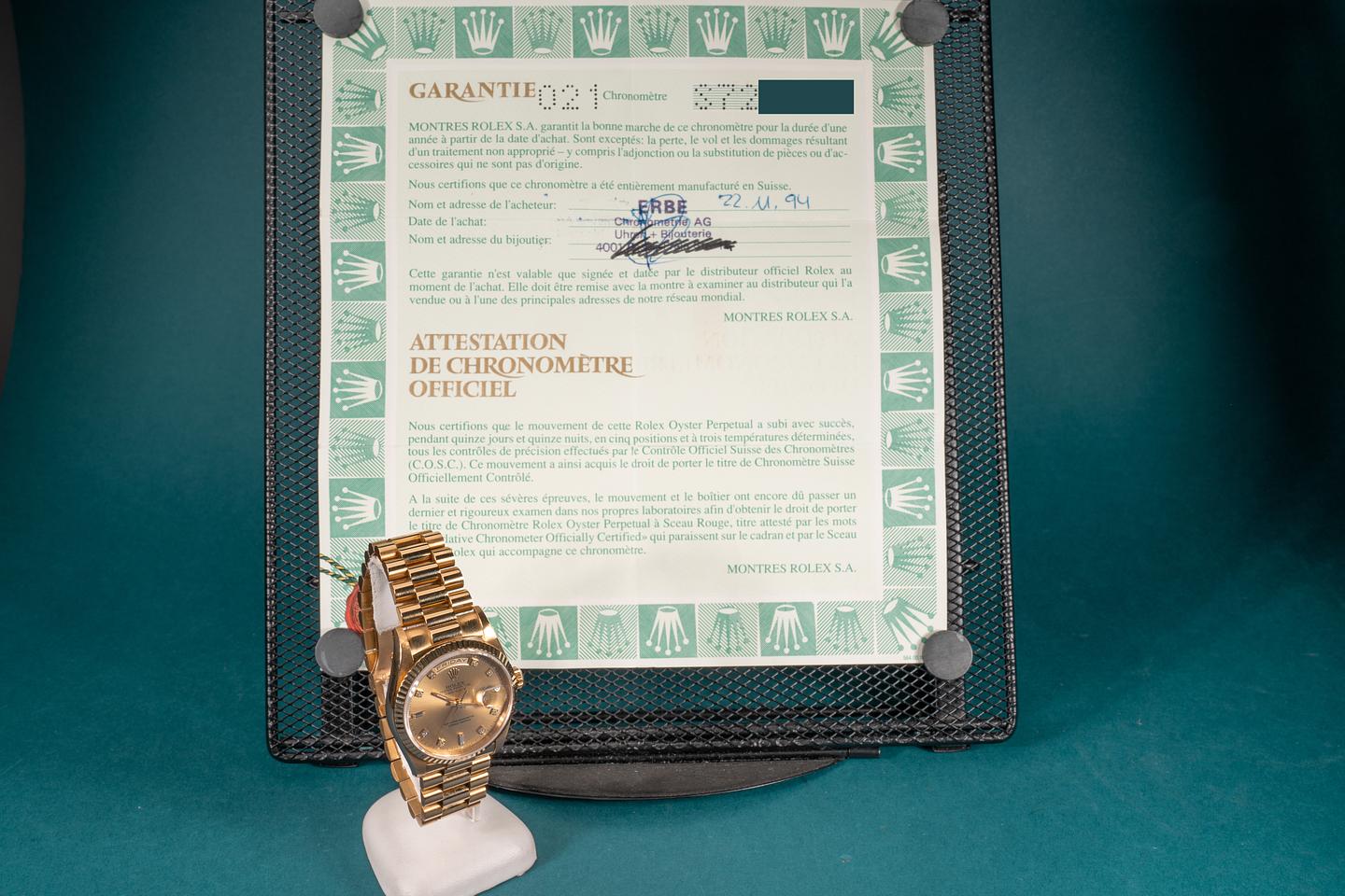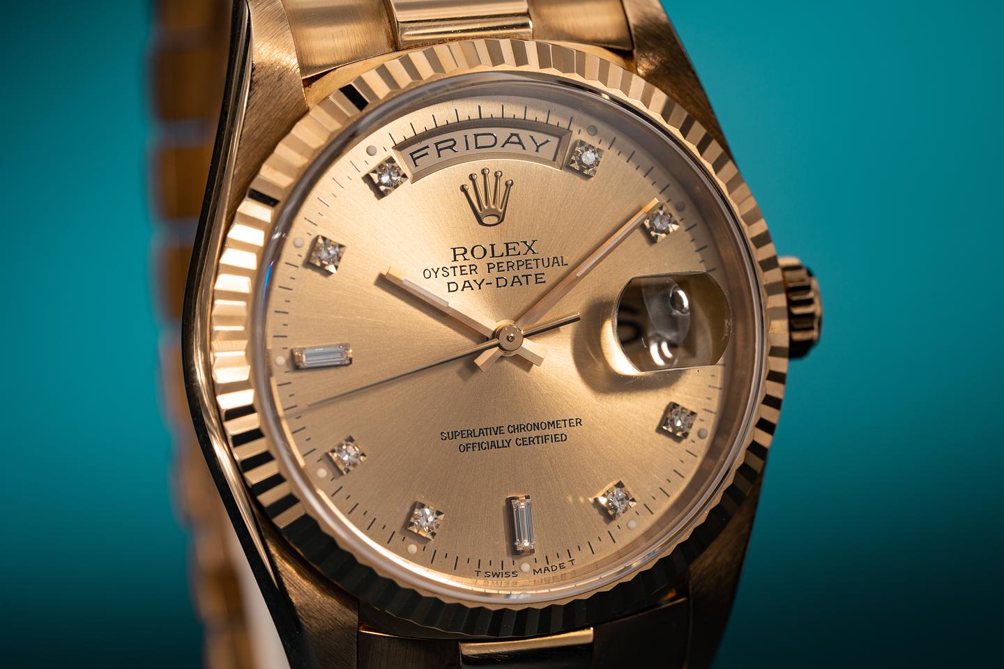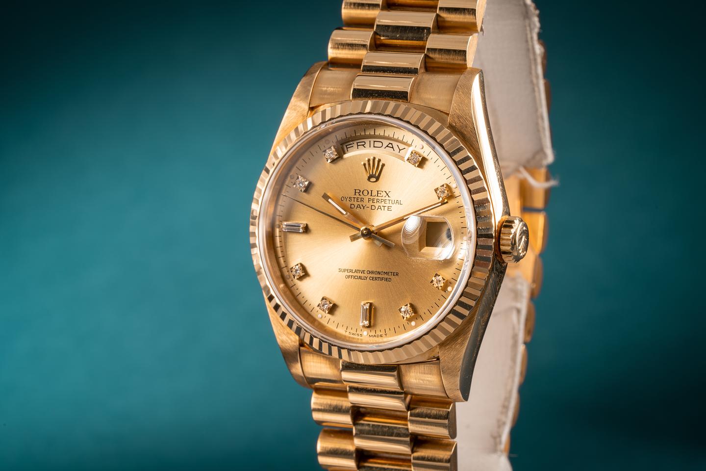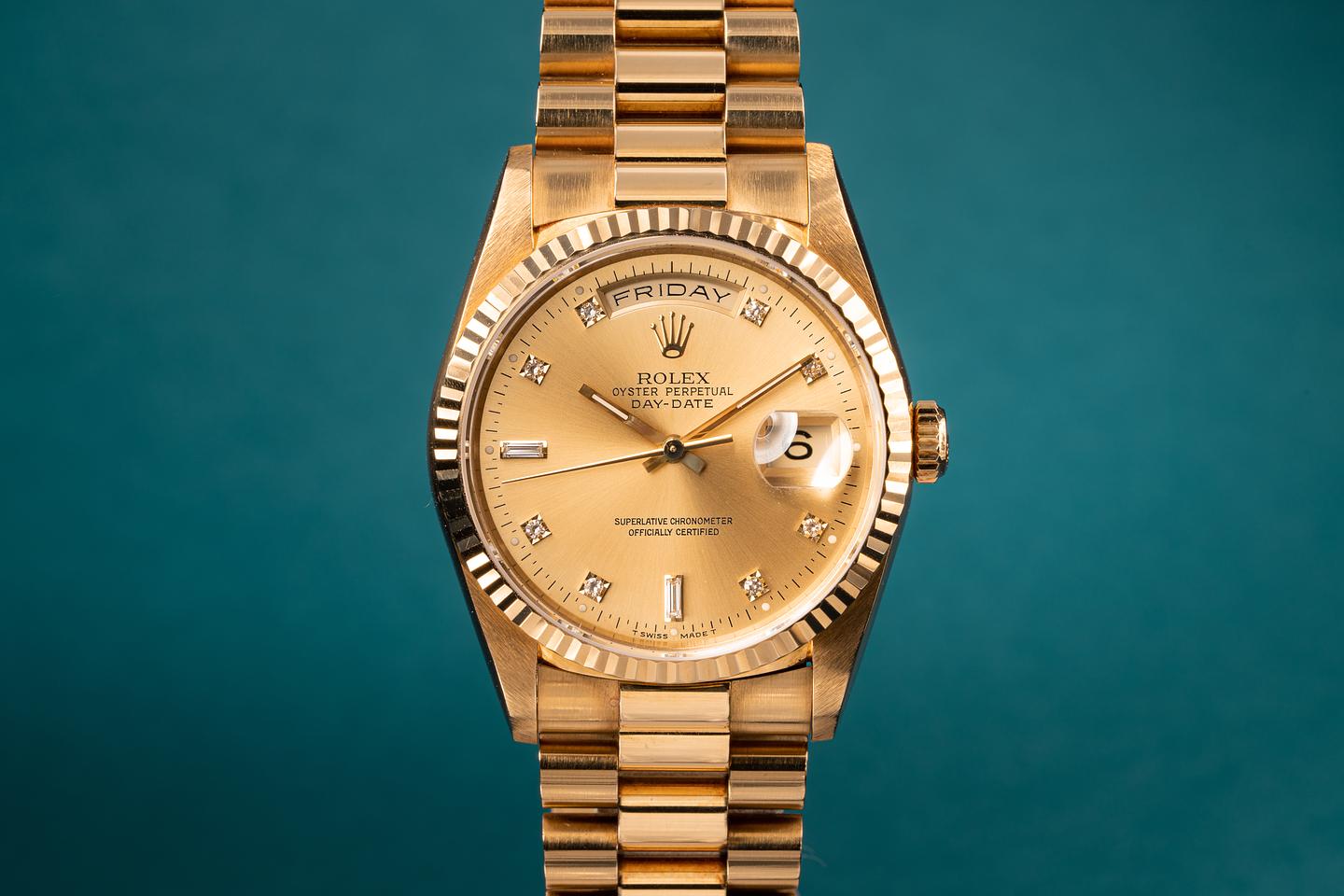 Bracelet: The 23 link 18k yellow gold president bracelet is excellent showing only light stretch for its age. The bracelet has a warm rosy patina that matches the patina of the case perfectly.