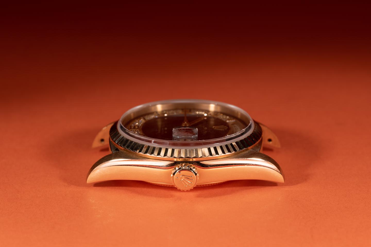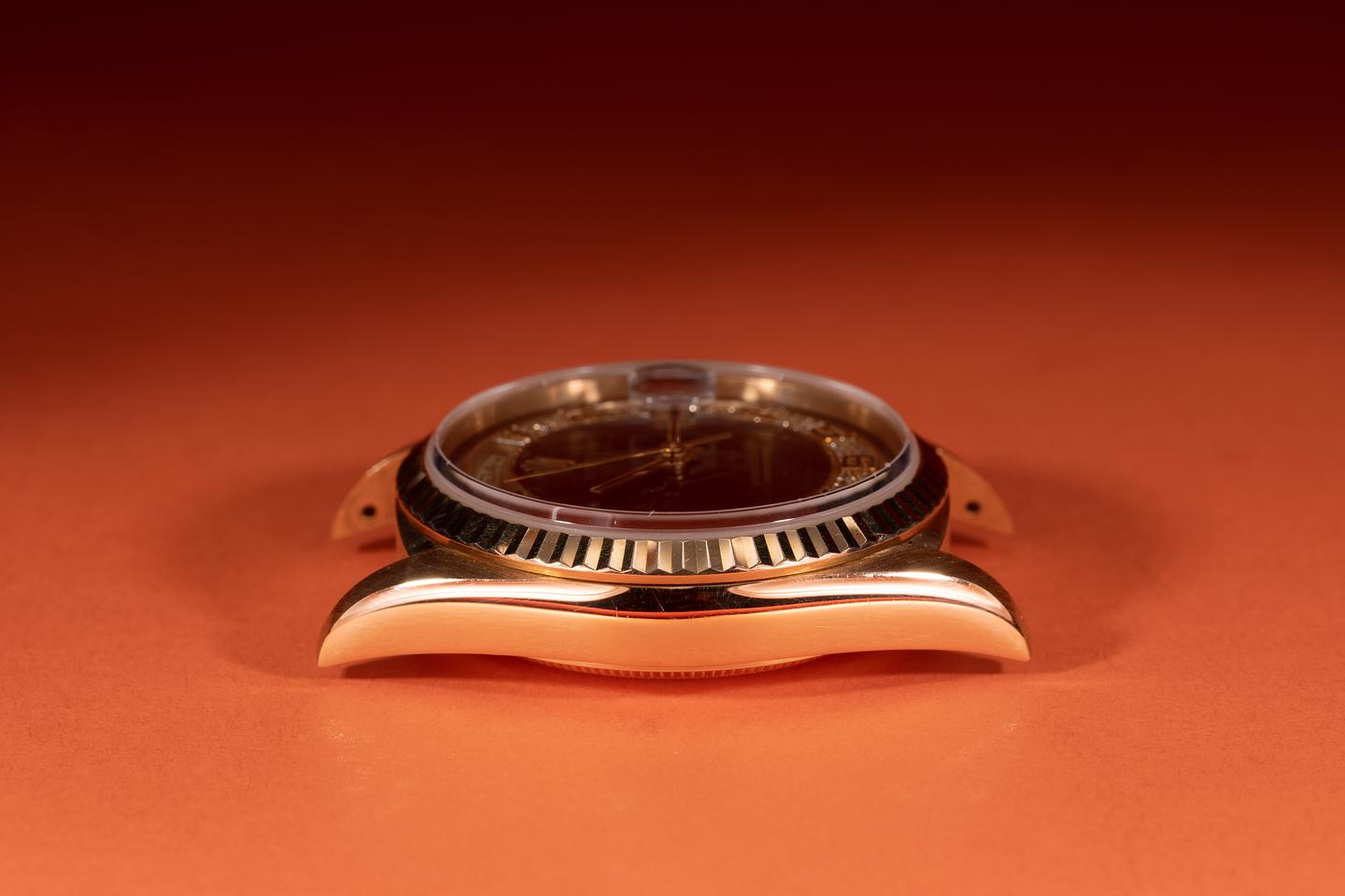 Case: The thick and even 18k yellow gold case is excellent showing only extremely light wear from use. The sharp 18k fluted bezel is also in excellent condition showing only extremely light wear from use.