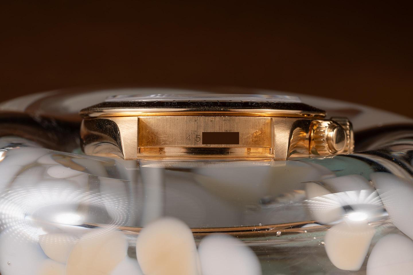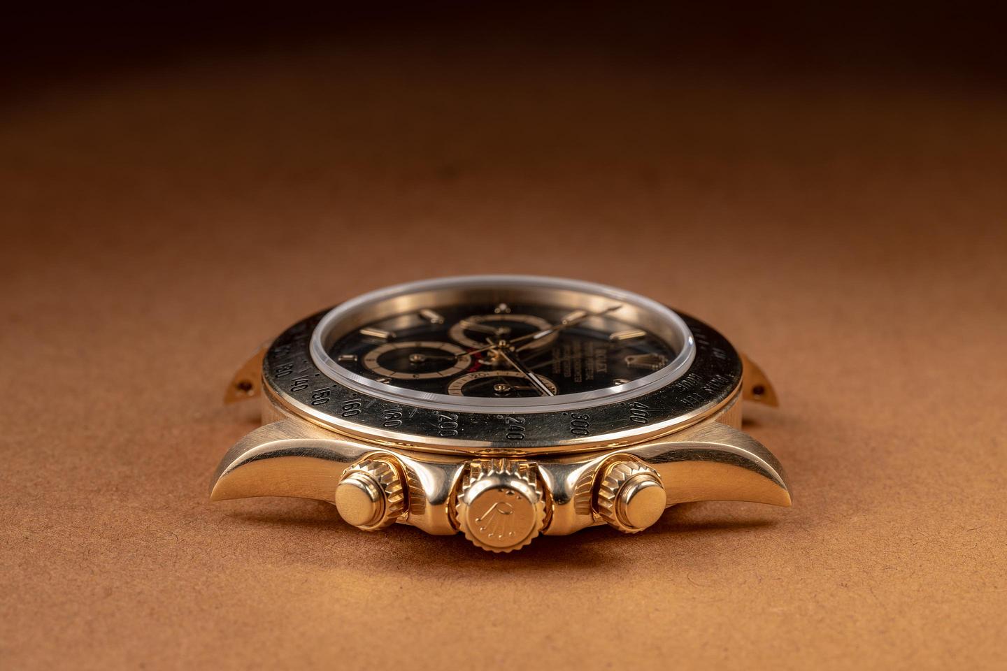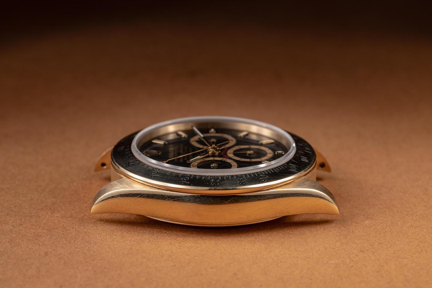 Case: The thick, sharp, and even 18K yellow gold case is excellent, showing only very light wear from use. The 18K yellow gold bezel is also in excellent condition, showing only light wear from use.