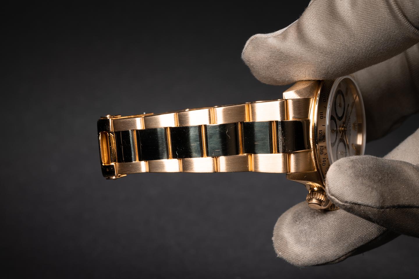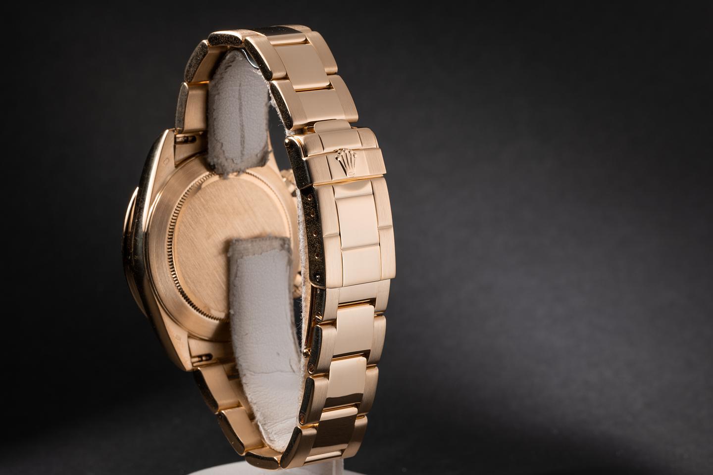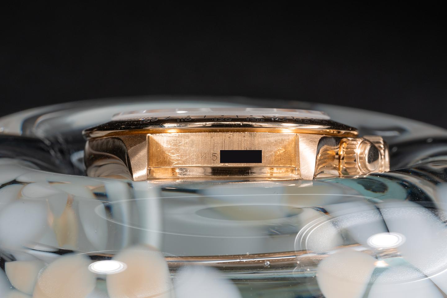 Case: The thick and even 18k yellow gold case is excellent showing only very light wear from use. The 18k yellow gold bezel is also in excellent condition showing only very light wear from use.