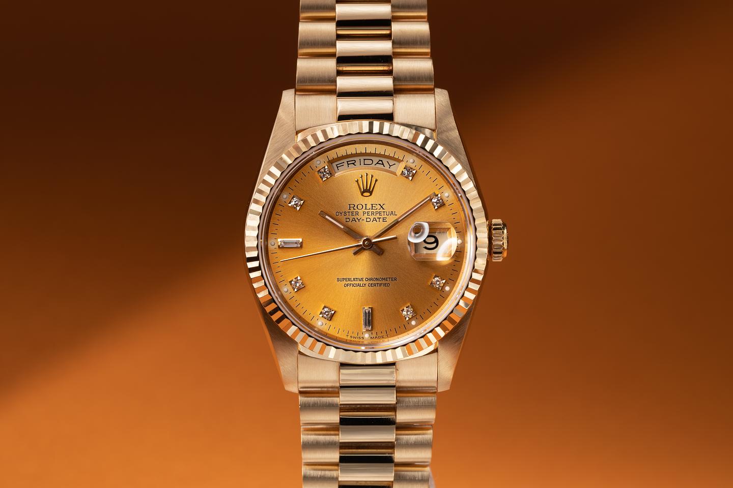 Dial: The diamond dial has aged to a deep and vibrant gold hue and shows no visible wear. The lume has aged to a clean creamy hue and the hands match perfectly.