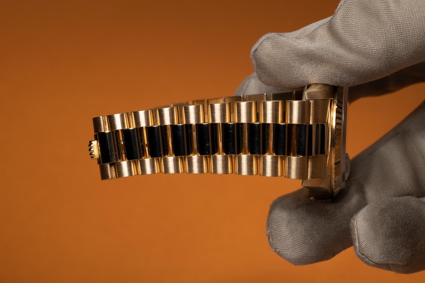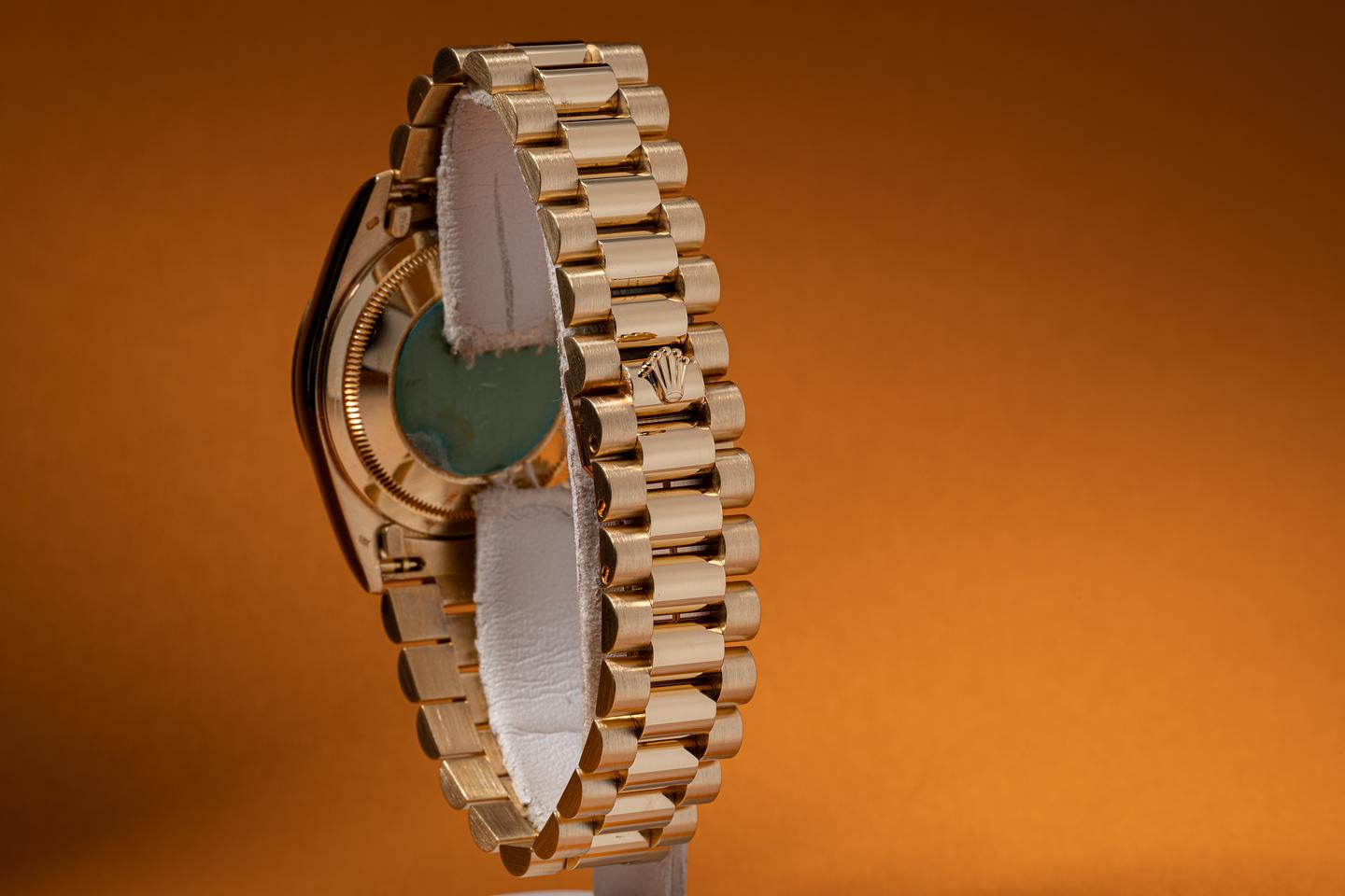 Bracelet: The 20 link 18k yellow gold President bracelet is excellent showing only light stretch for its age.