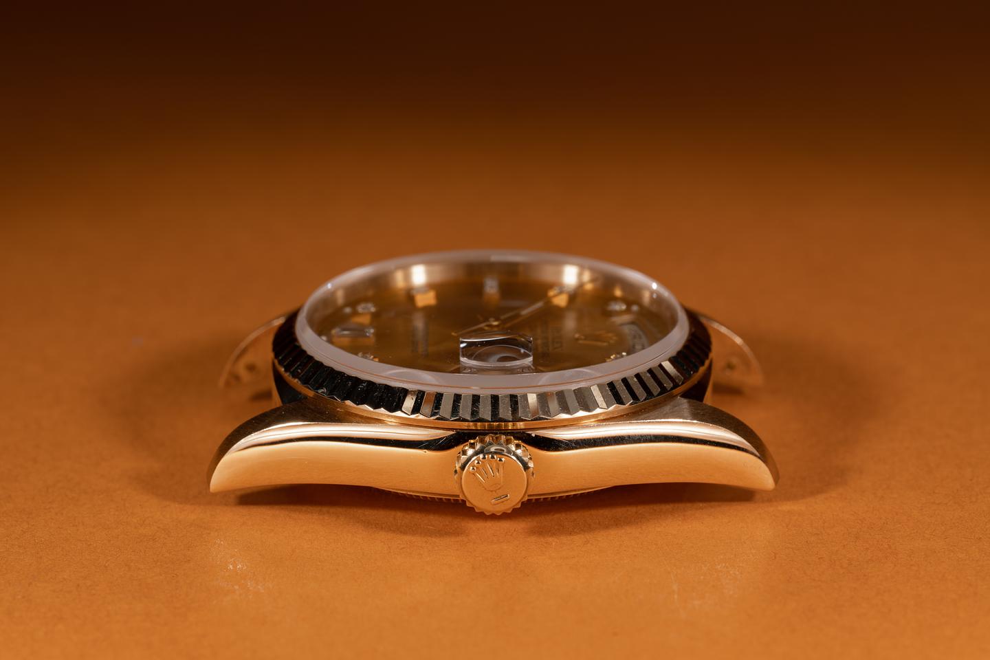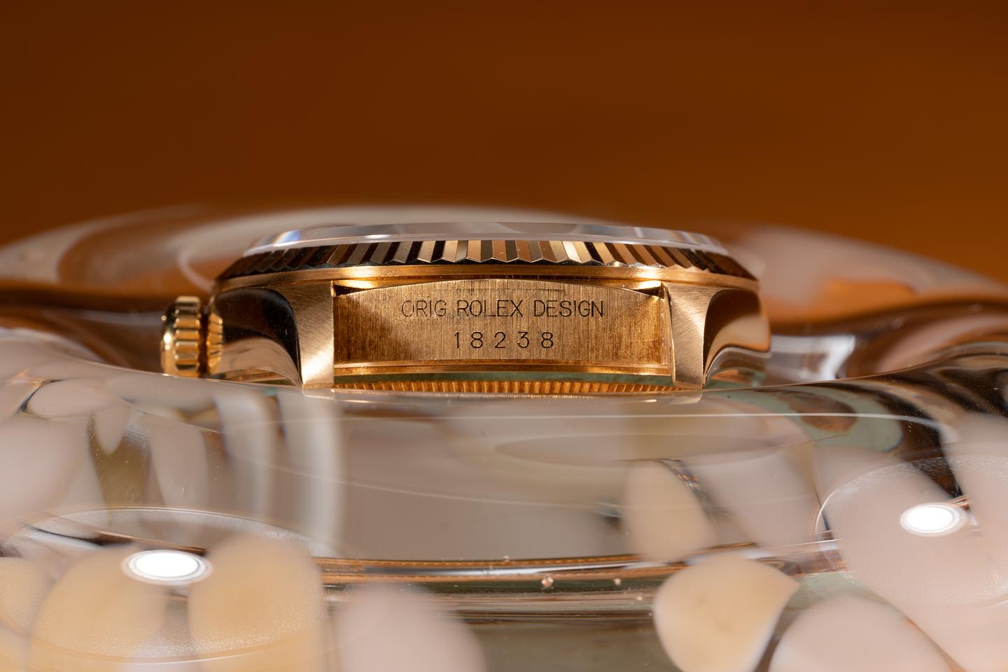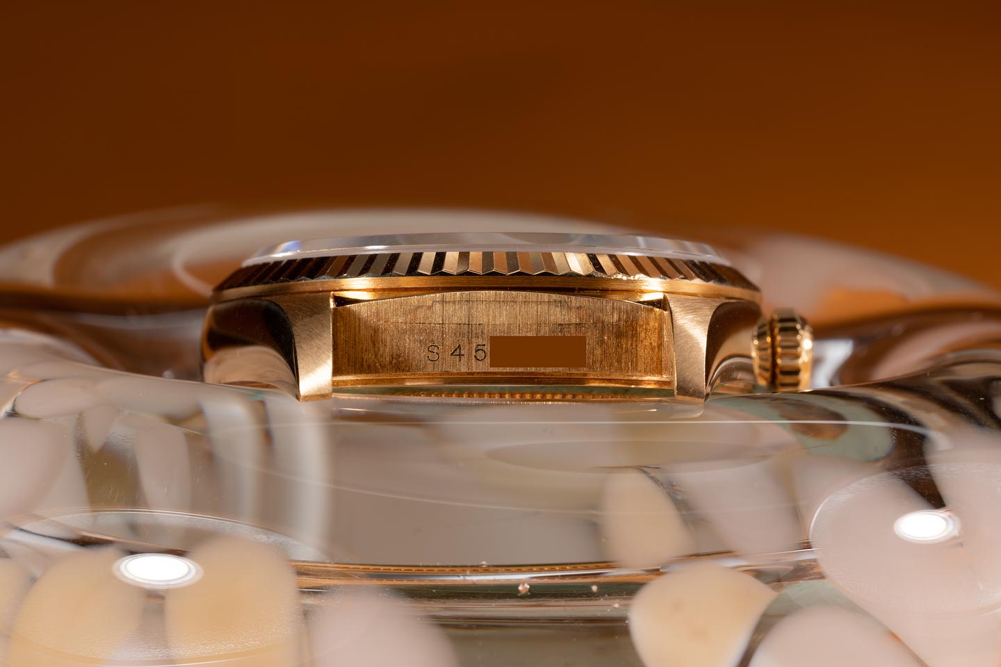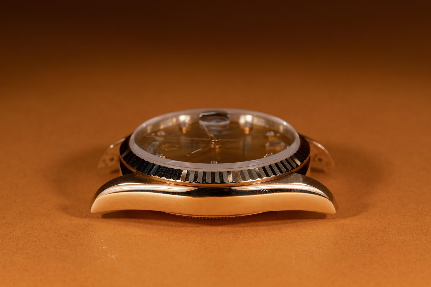 Case: The thick and even 18k yellow gold case is excellent showing only very light wear from use. The sharp 18k fluted bezel is also in excellent condition showing only very light wear from use.