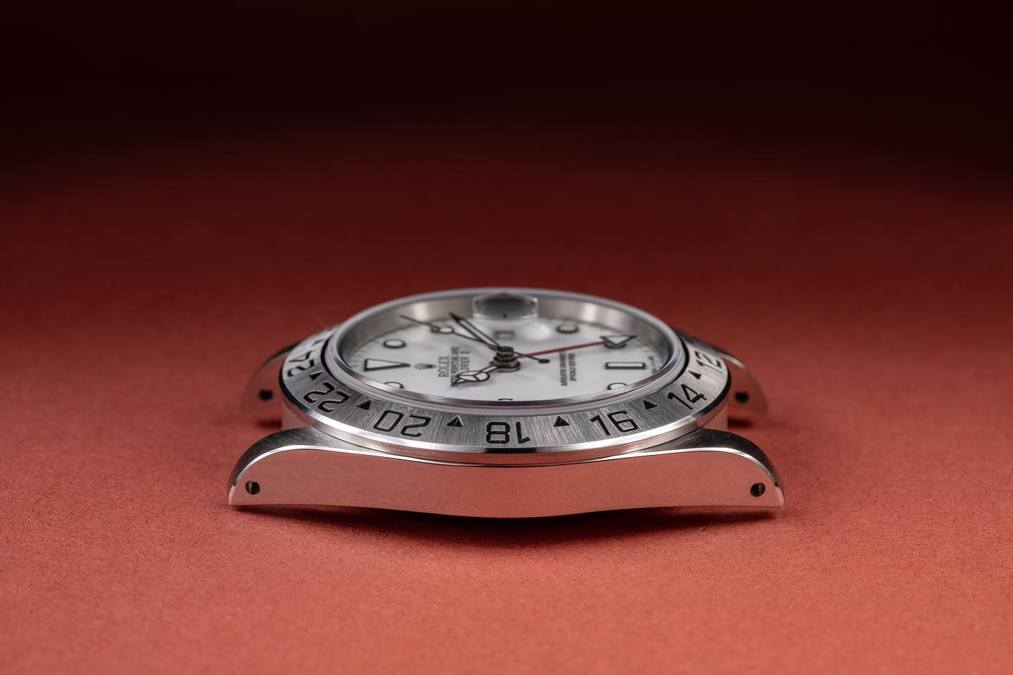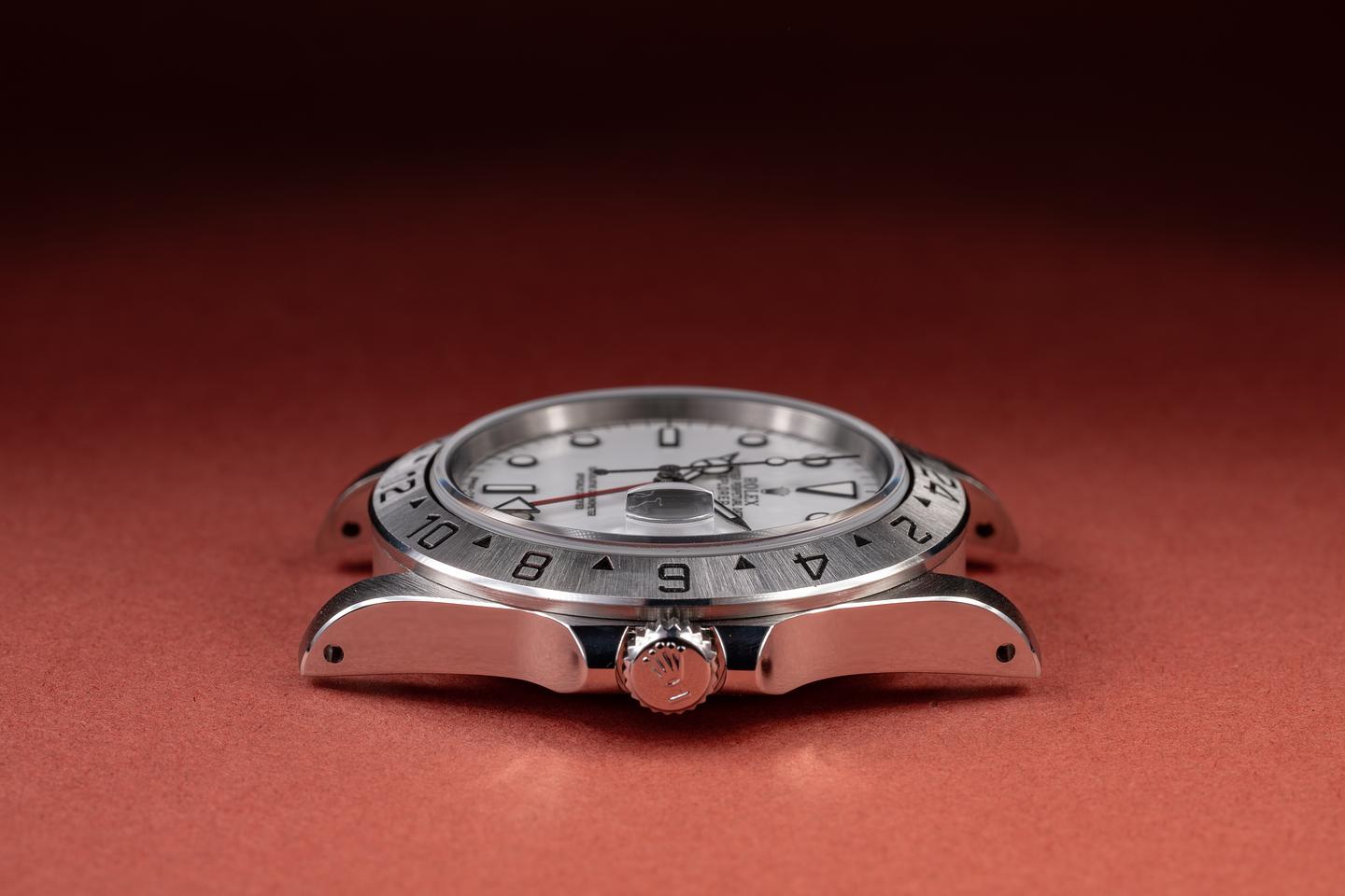 Case: The recently polished case is excellent, showing sharp, prominent bevels and only very light wear. The stainless bezel is also in excellent condition, showing a sharp, well-defined sunburst finish and only very light wear.