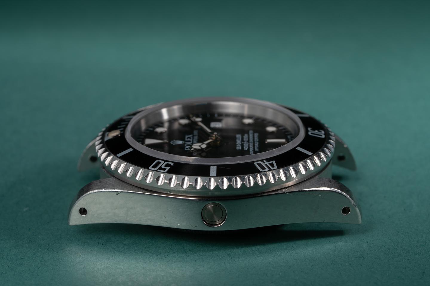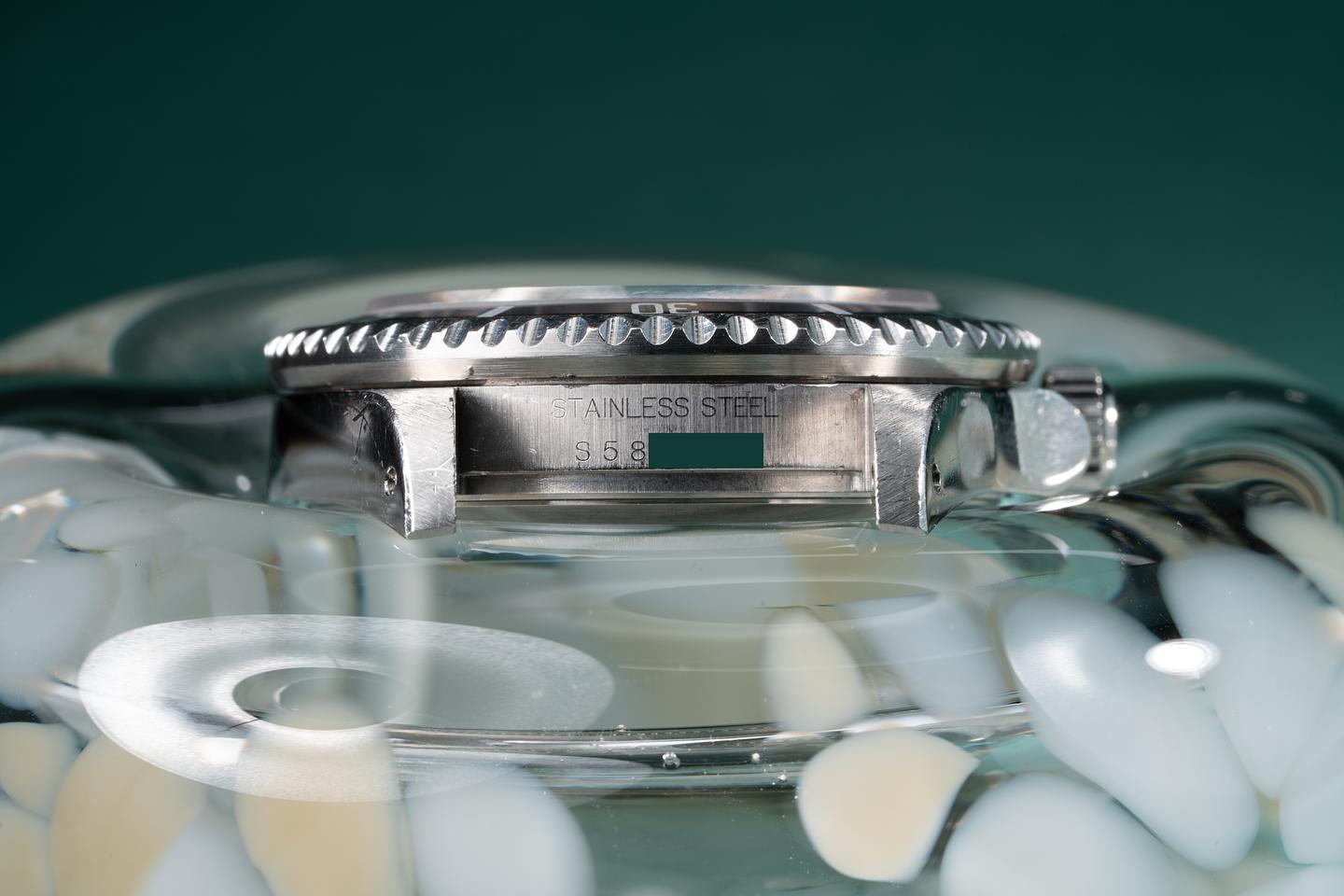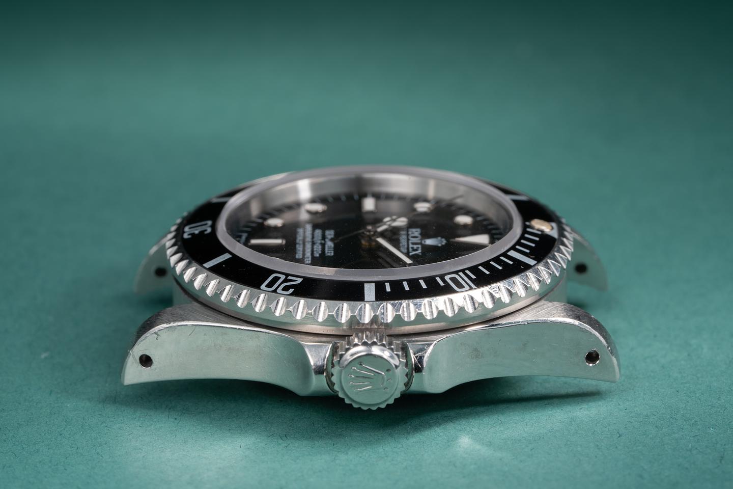 Case: The thick and even case is excellent showing sharp prominent bevels and some wear from use. The black bezel insert is also excellent showing some light wear from use.