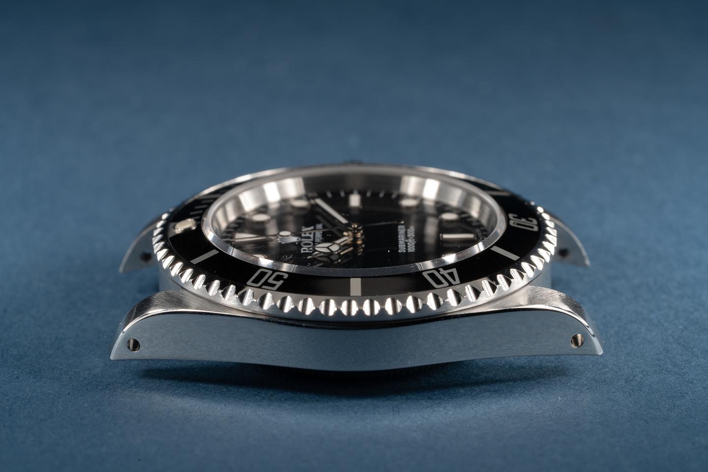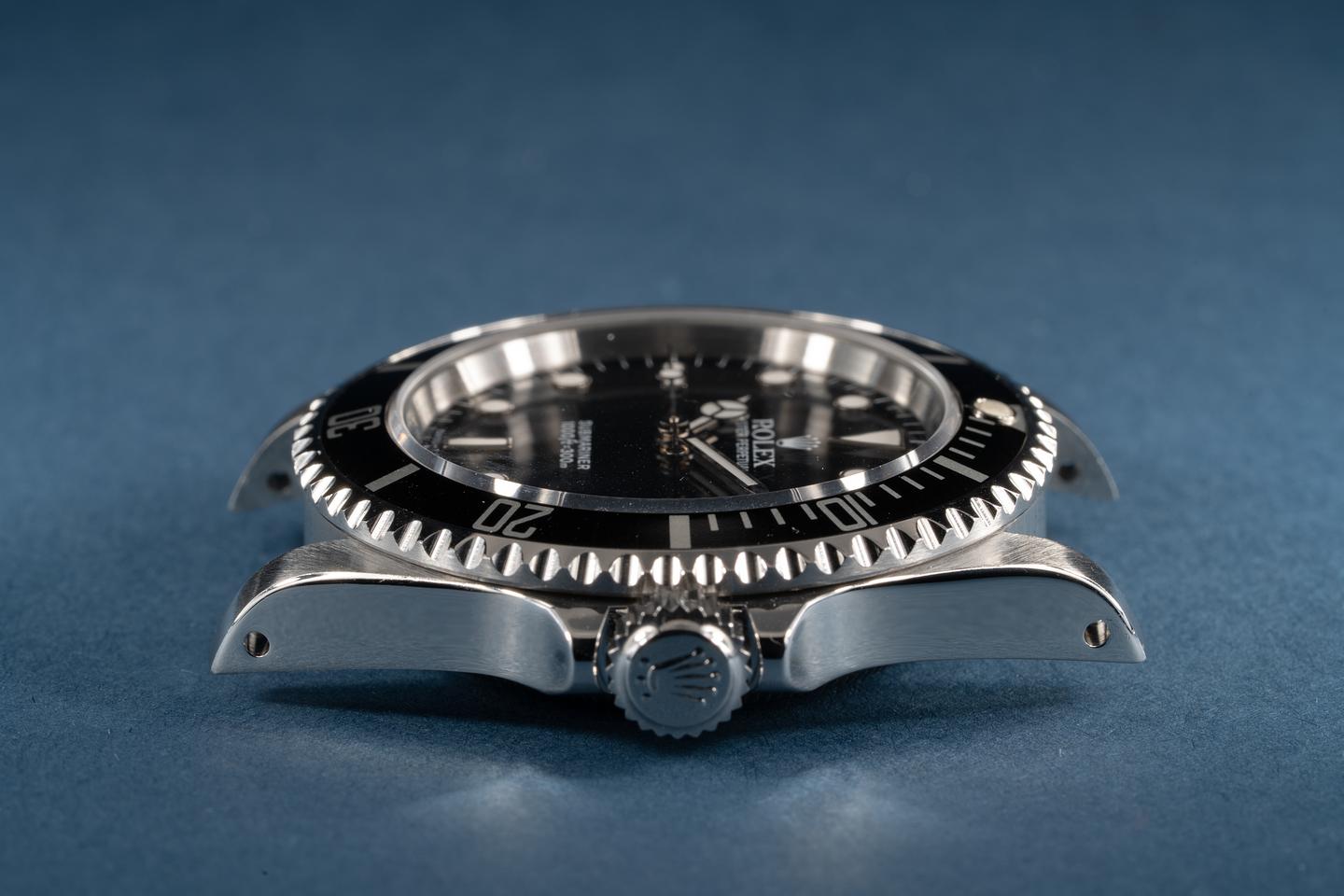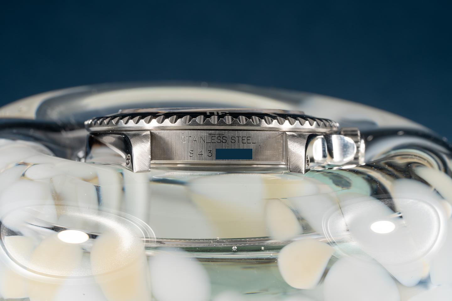 Case: The previously polished case is excellent showing only very light wear from use. The black bezel insert is also excellent showing only very light wear. The original caseback sticker is still intact.