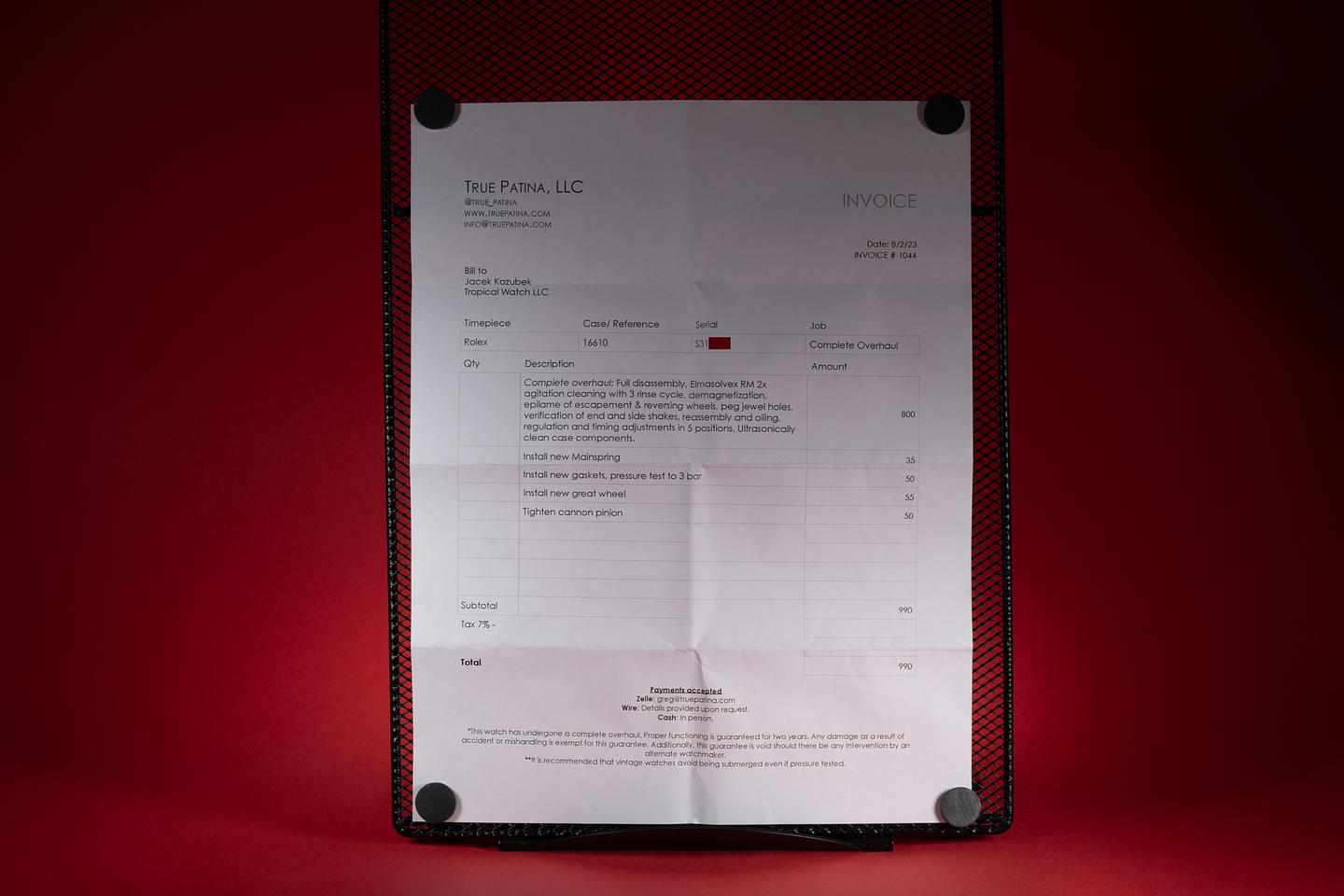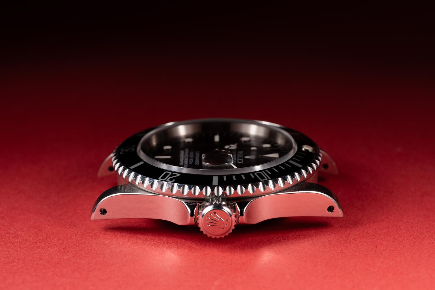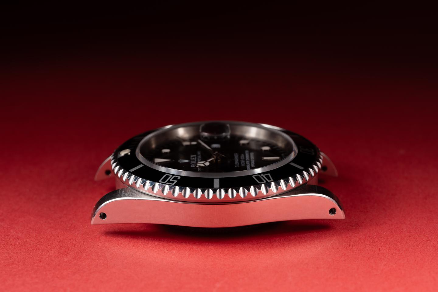 Case: The previously polished case is excellent showing only light wear from use. The black bezel insert is also excellent and shows only light wear from use.