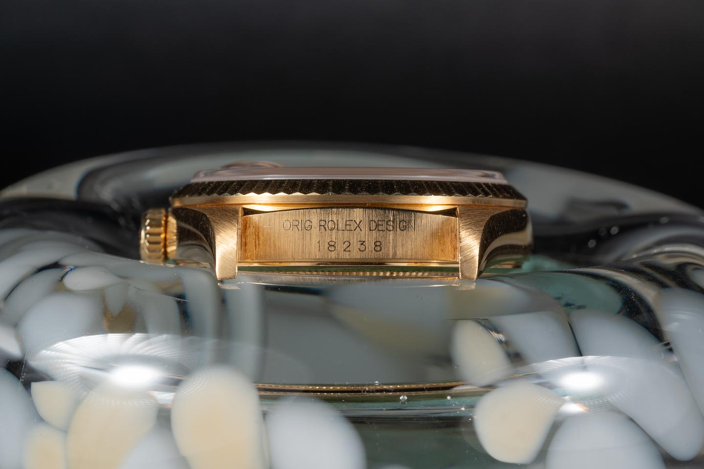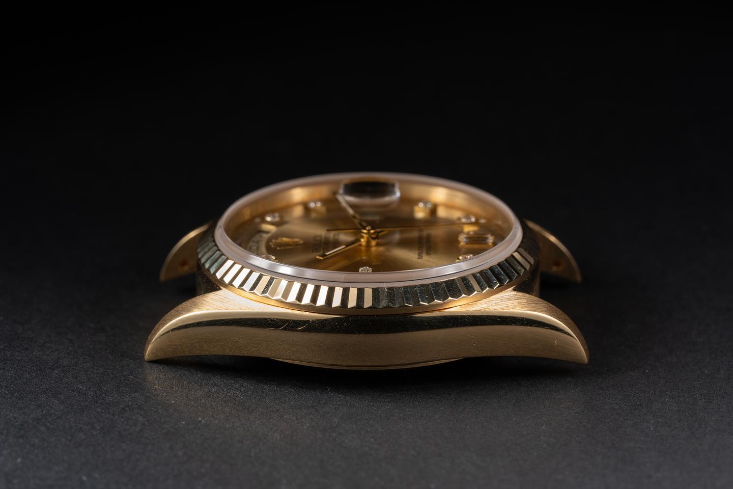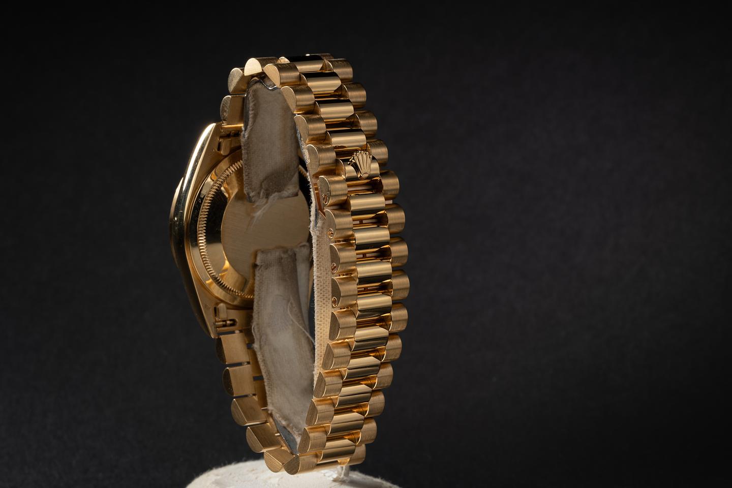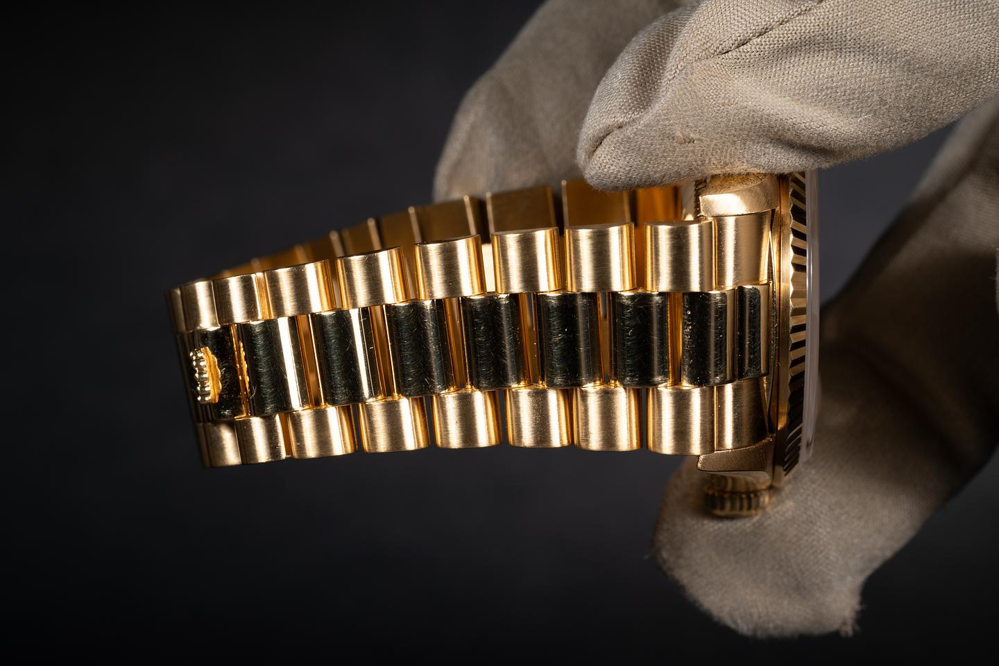 Bracelet: The 22 link 18K yellow gold President bracelet is excellent showing only light stretch for its age. The clasp is stamped with a matching 1994 date code.