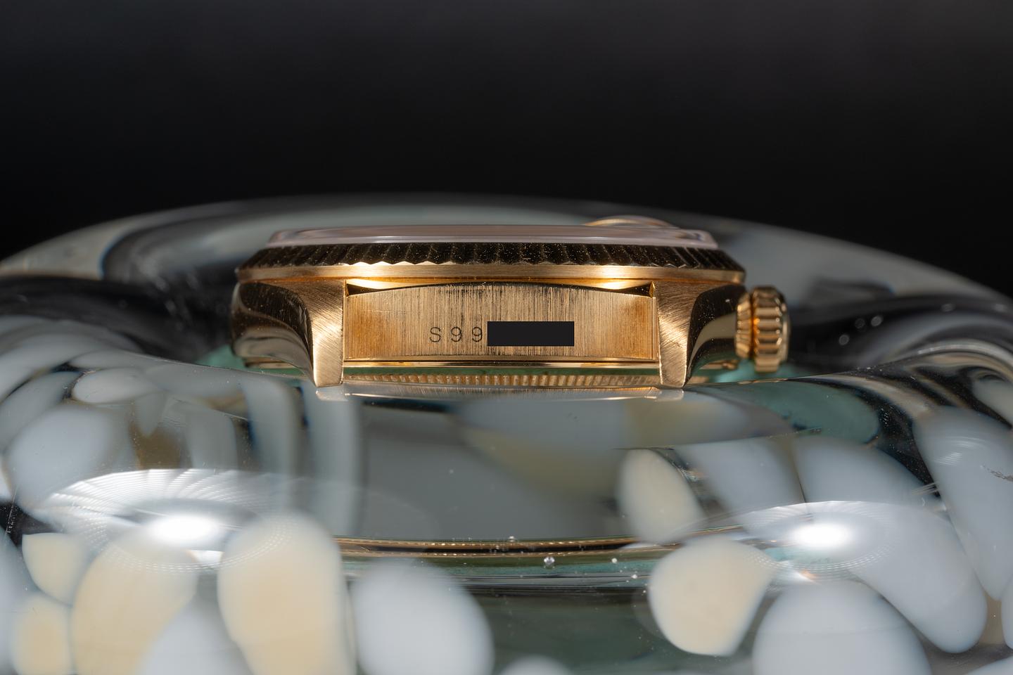 Case: The sharp 18k yellow gold case is excellent showing only very light wear from use. The sharp 18k yellow gold fluted bezel is also in excellent condition showing only very light wear from use.