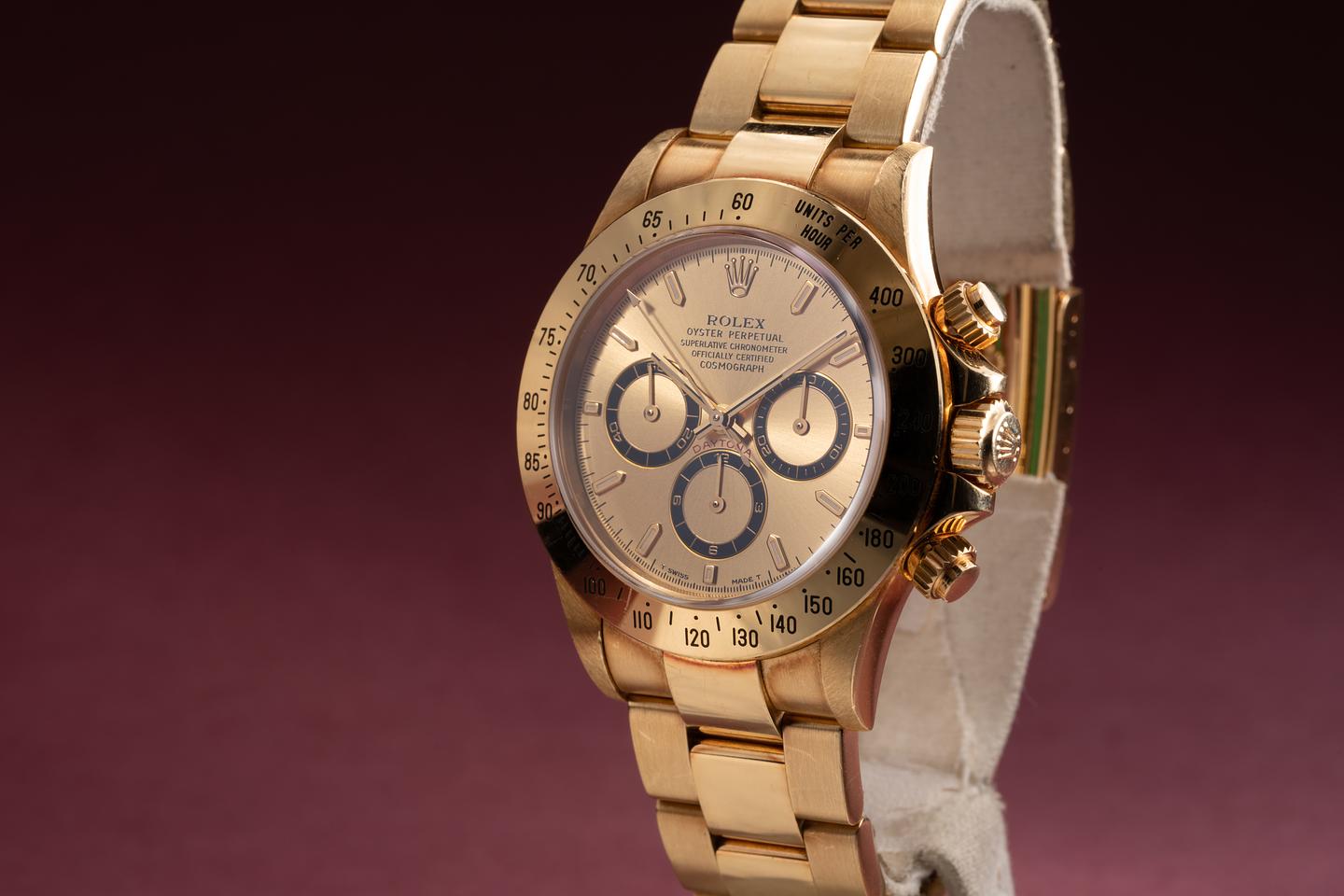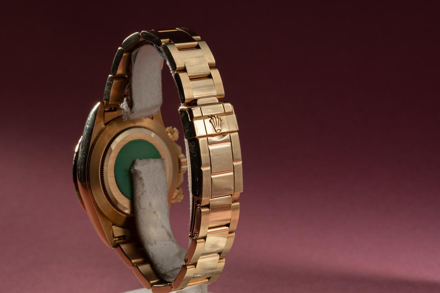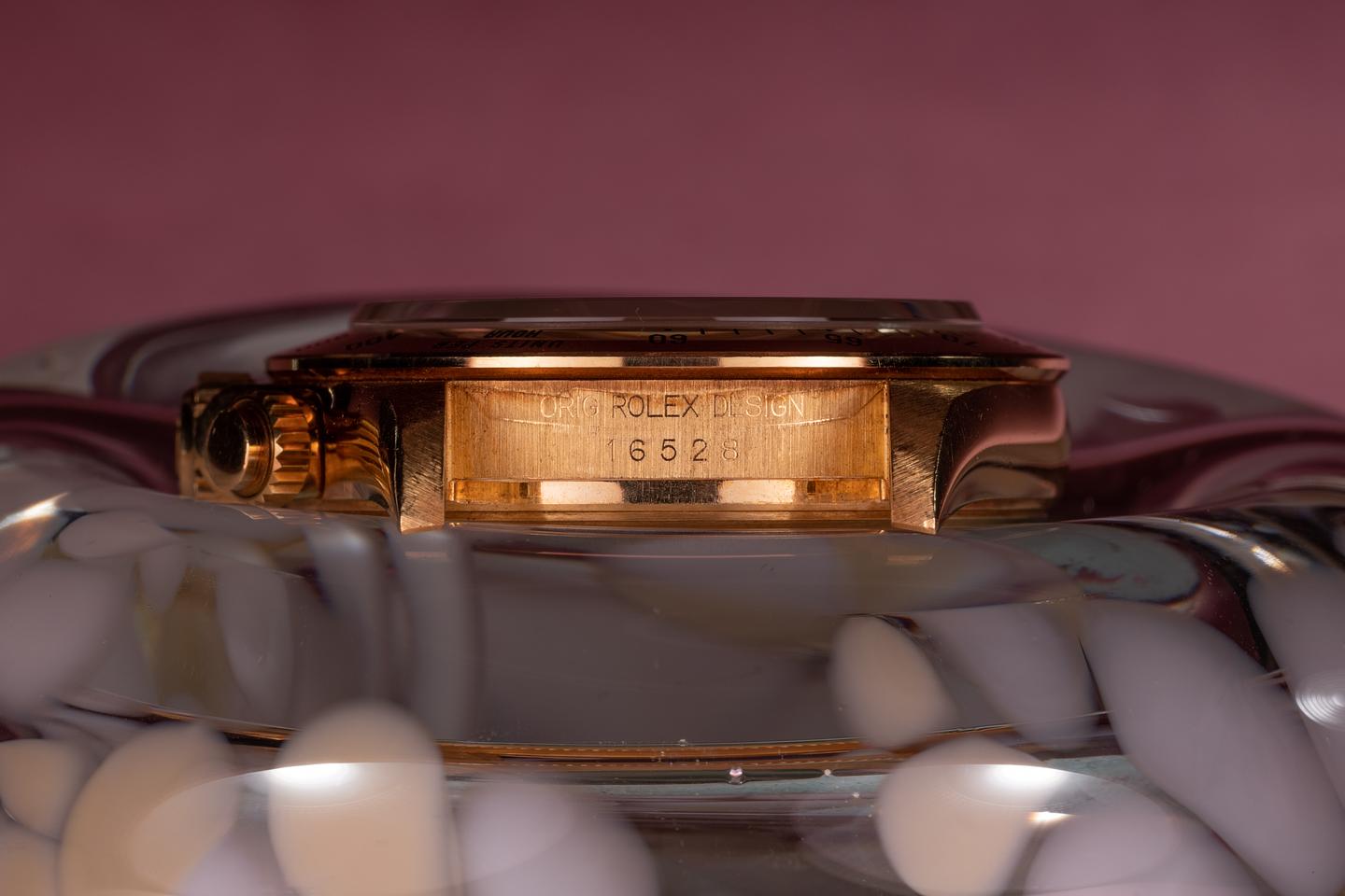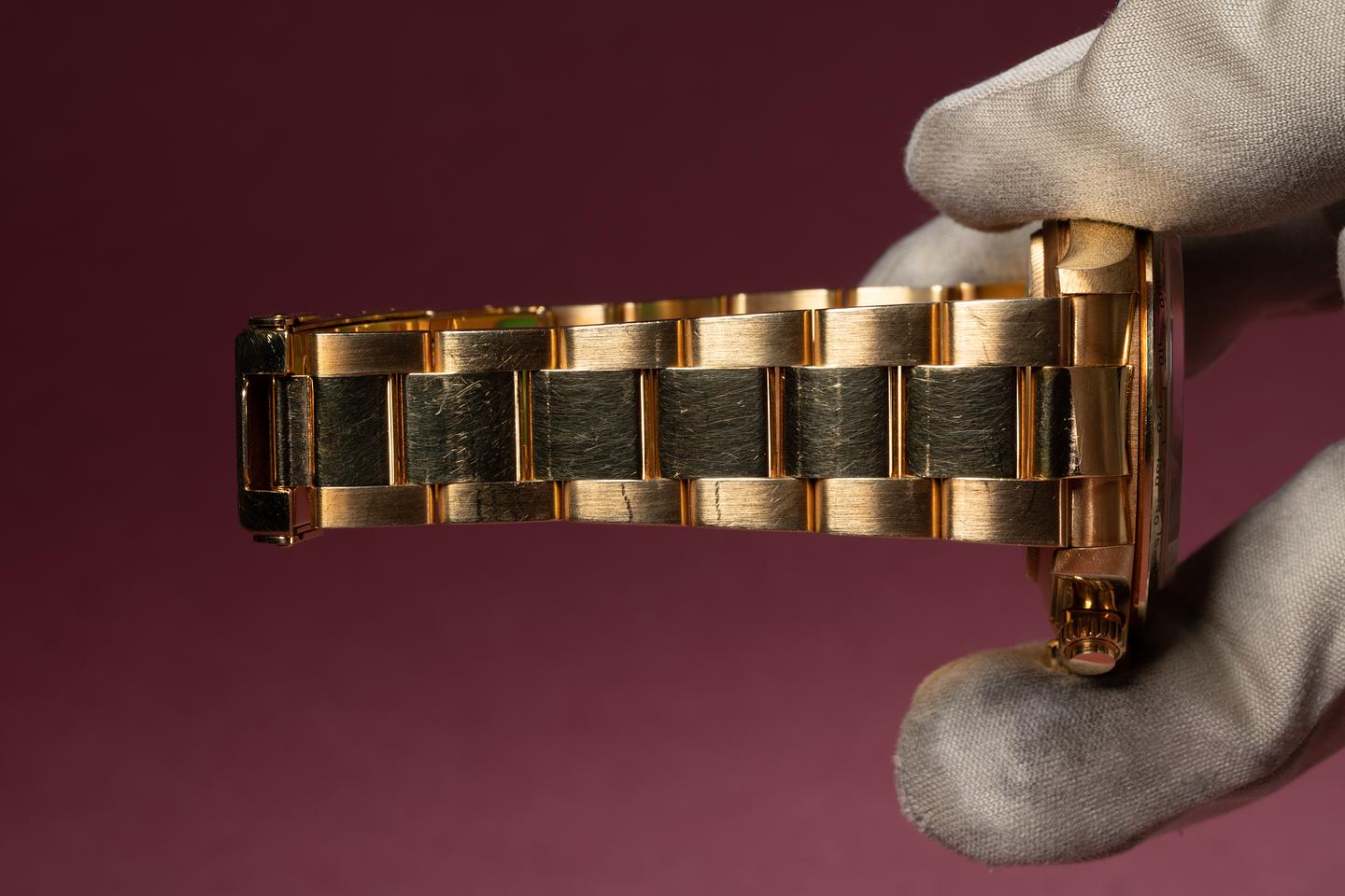 Bracelet: The 13 link 18k yellow gold oyster bracelet is excellent showing a warm rosy patina and only very light stretch for its age. The clasp is stamped with a matching 1994 date code.
