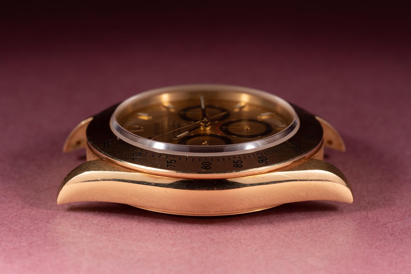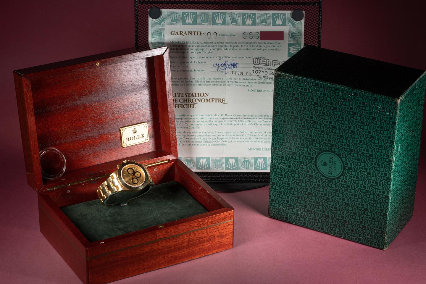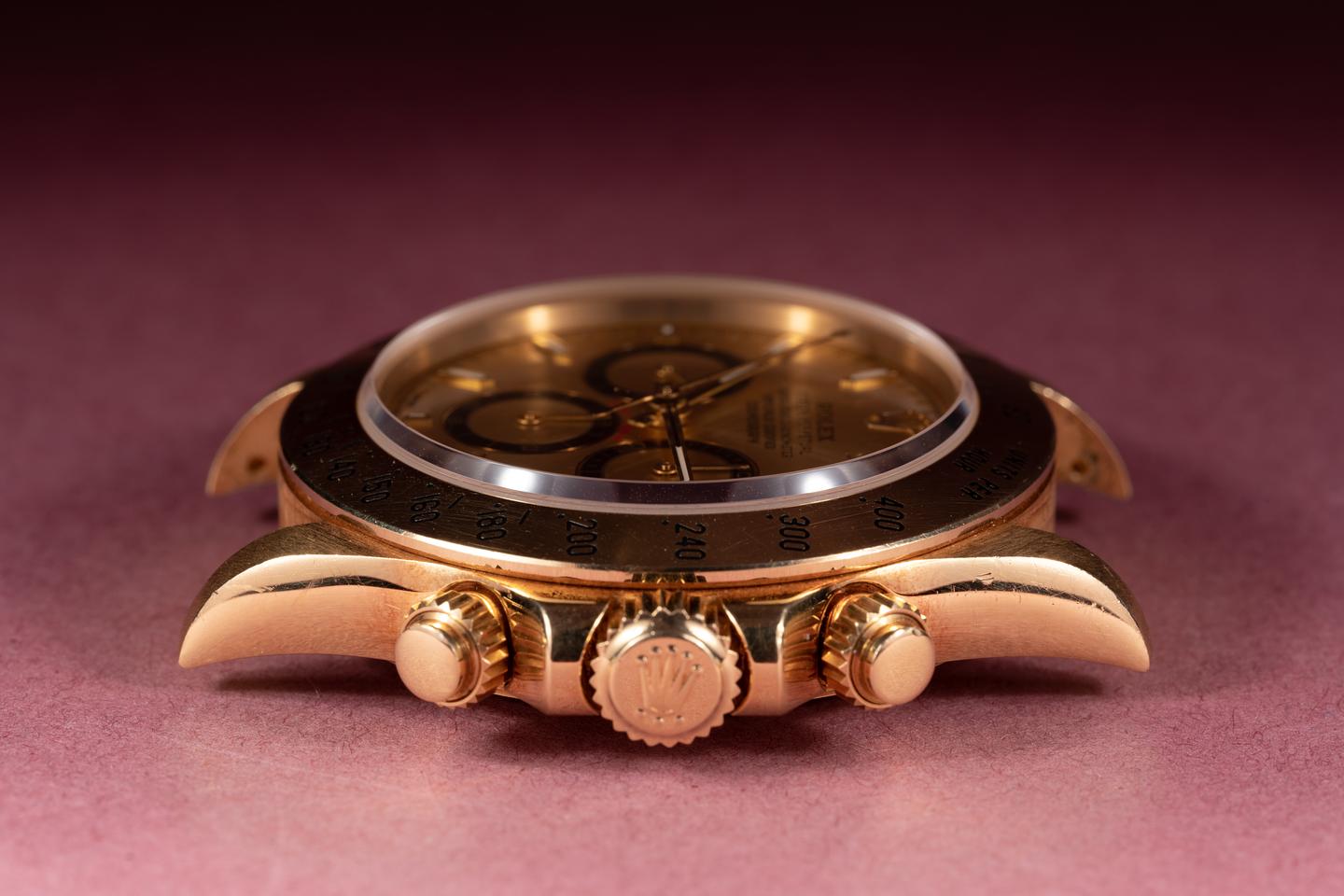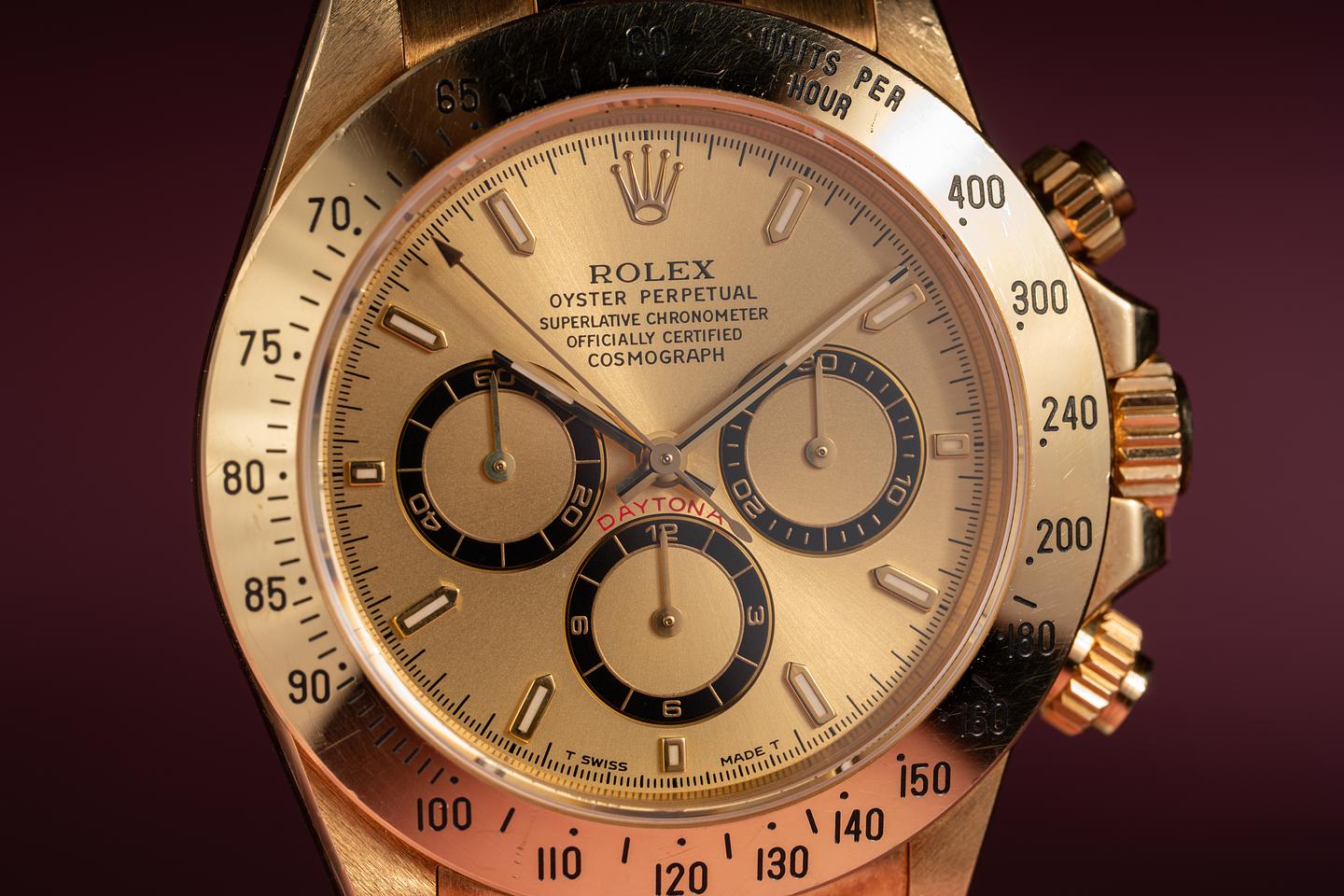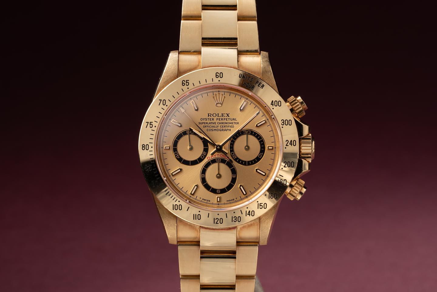 Bracelet: The 13 link 18k yellow gold oyster bracelet is excellent showing a warm rosy patina and only very light stretch for its age. The clasp is stamped with a matching 1994 date code.