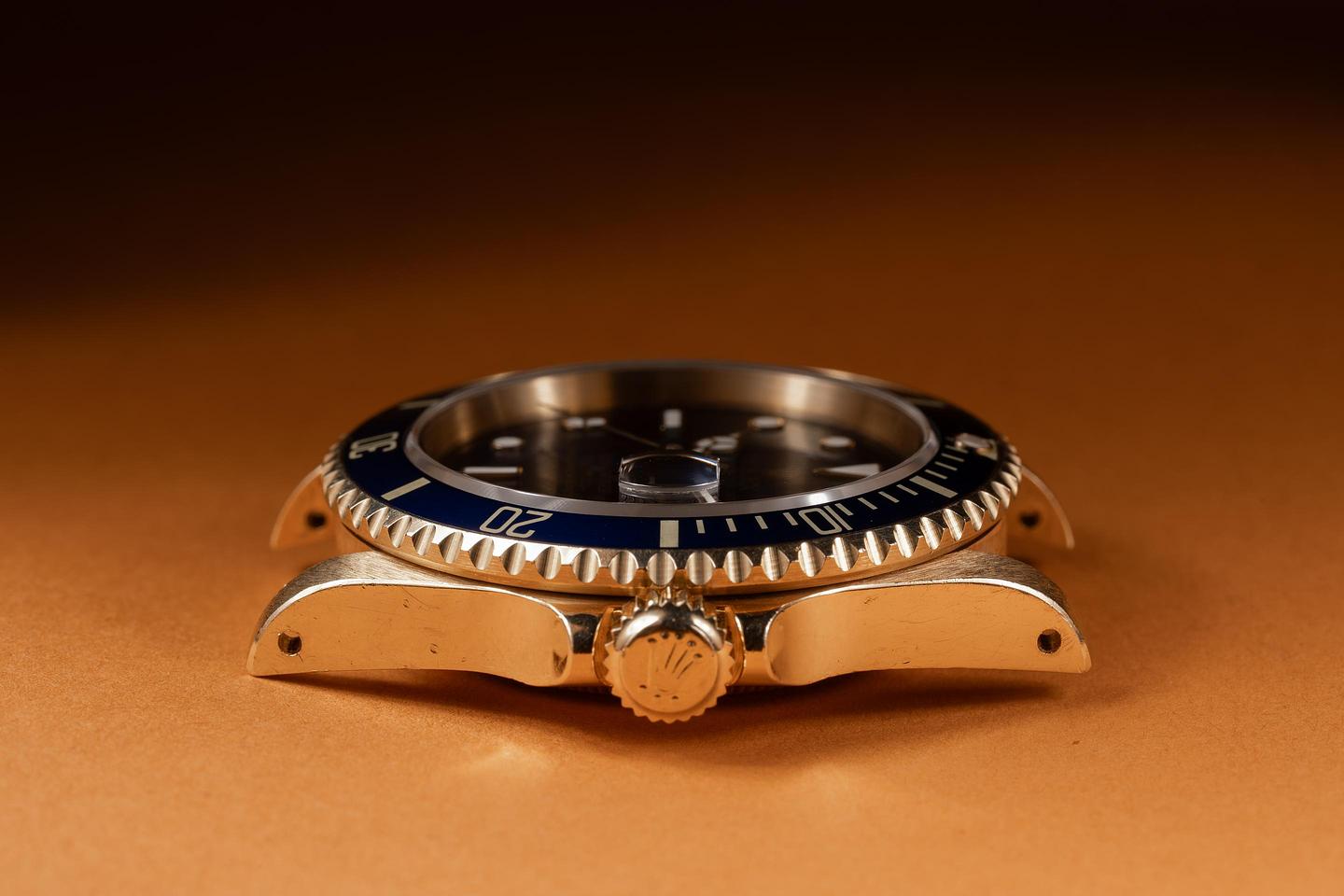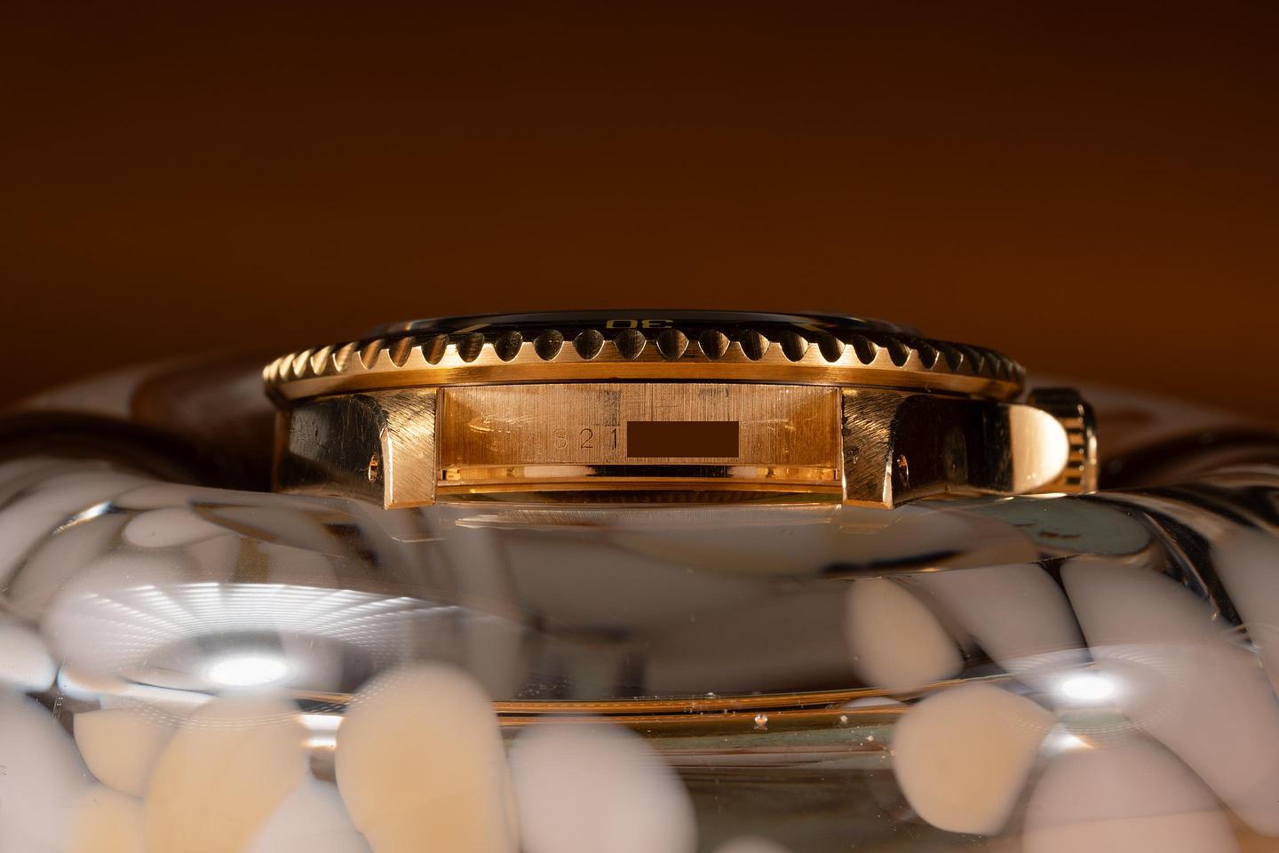 Case: The thick, even 18k yellow gold case appears to be unpolished showing sharp prominent factory bevels and light to average wear from use. The blue bezel insert is also in excellent condition showing only light wear from use.