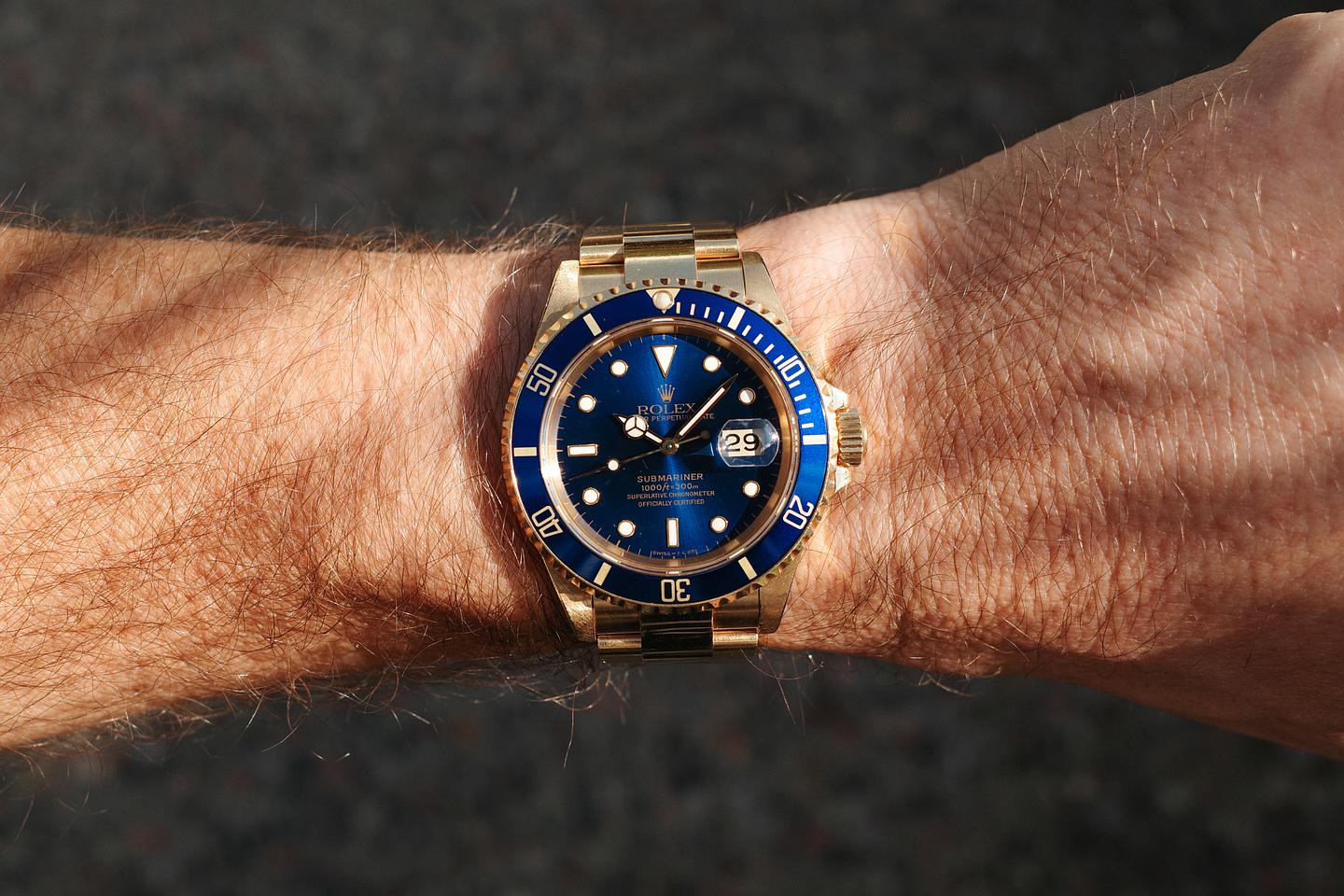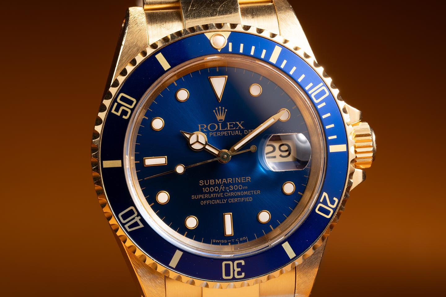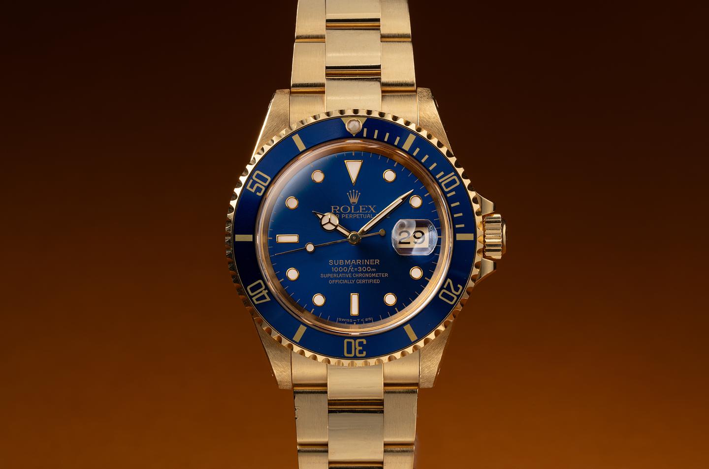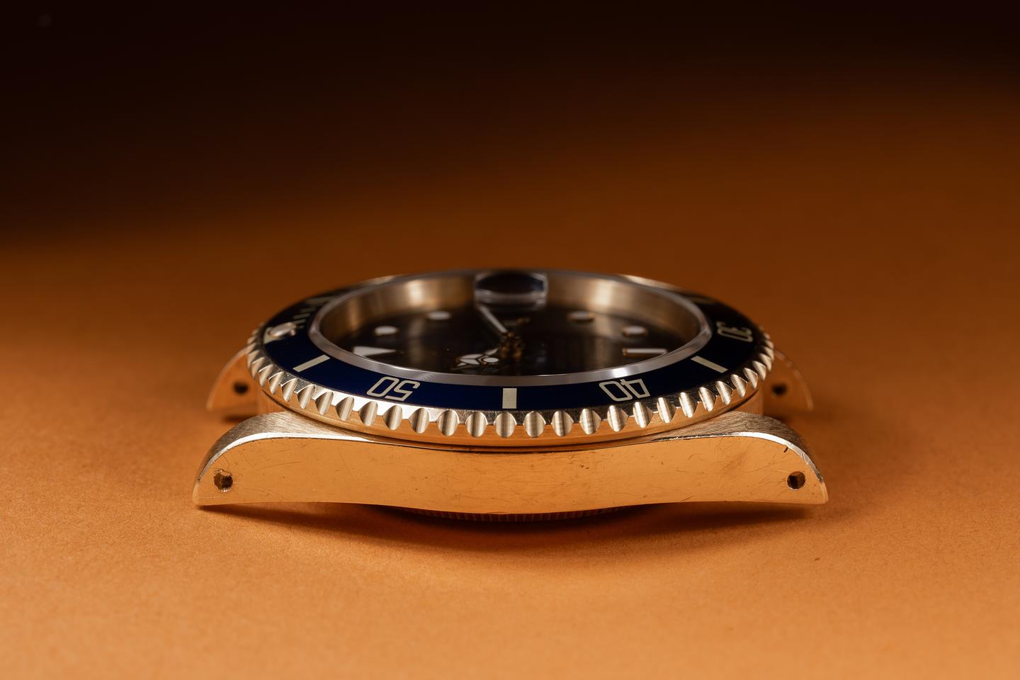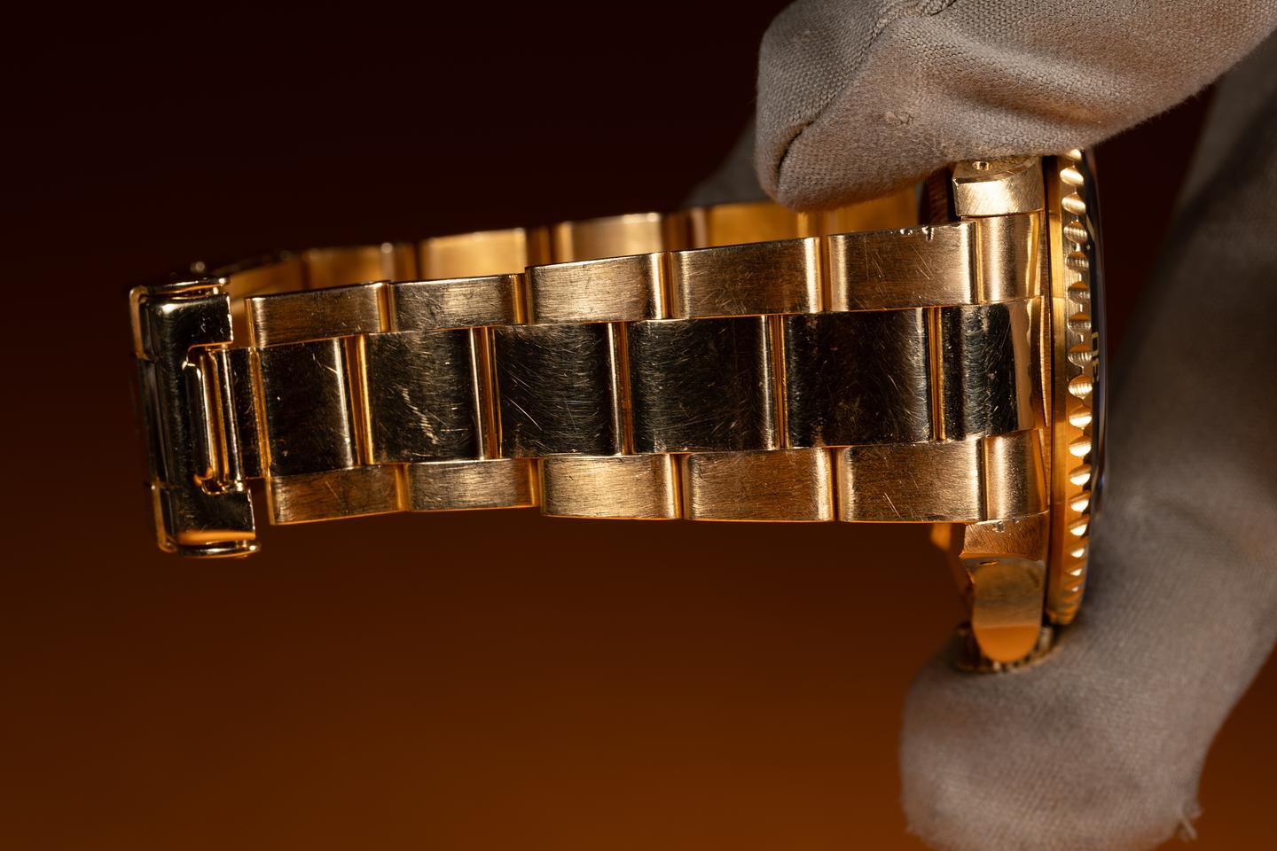 Case: The thick, even 18k yellow gold case appears to be unpolished showing sharp prominent factory bevels and light to average wear from use. The blue bezel insert is also in excellent condition showing only light wear from use.
