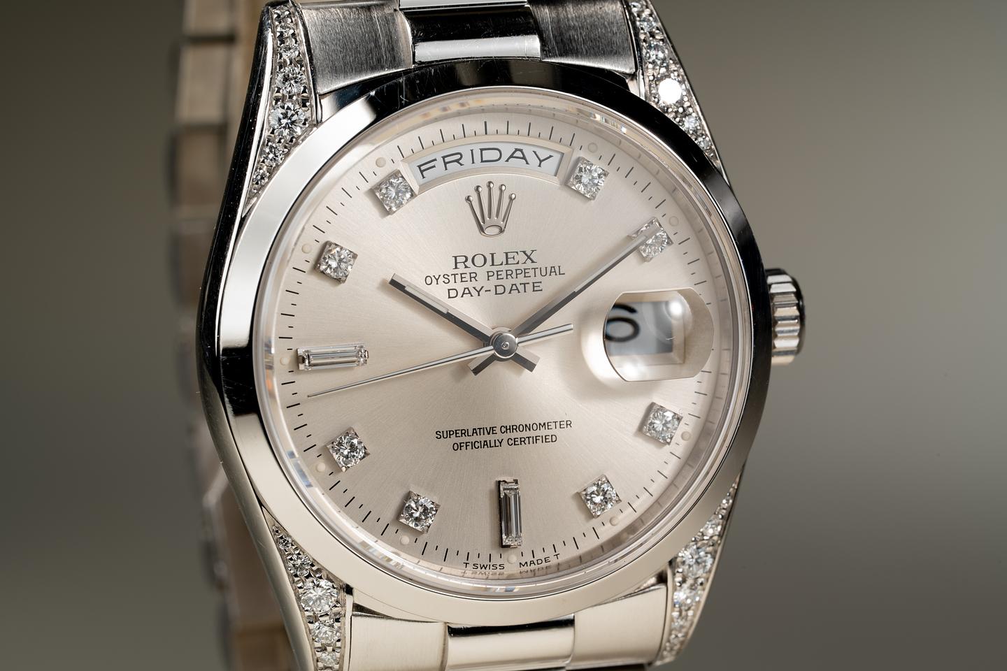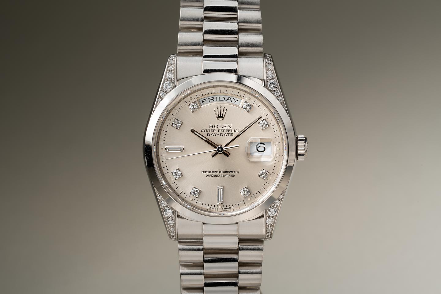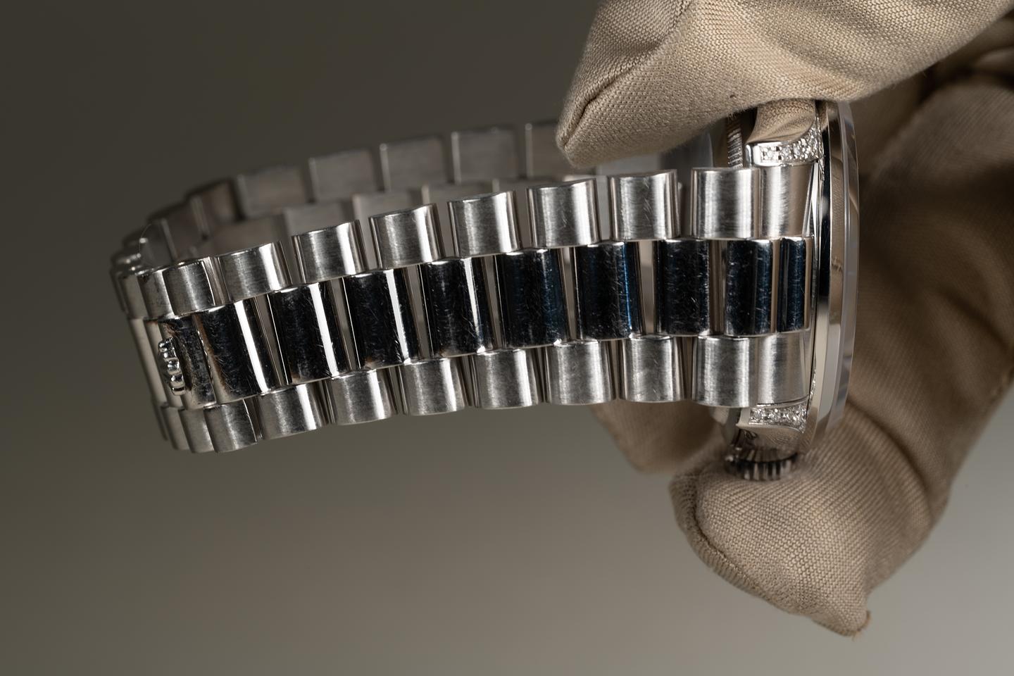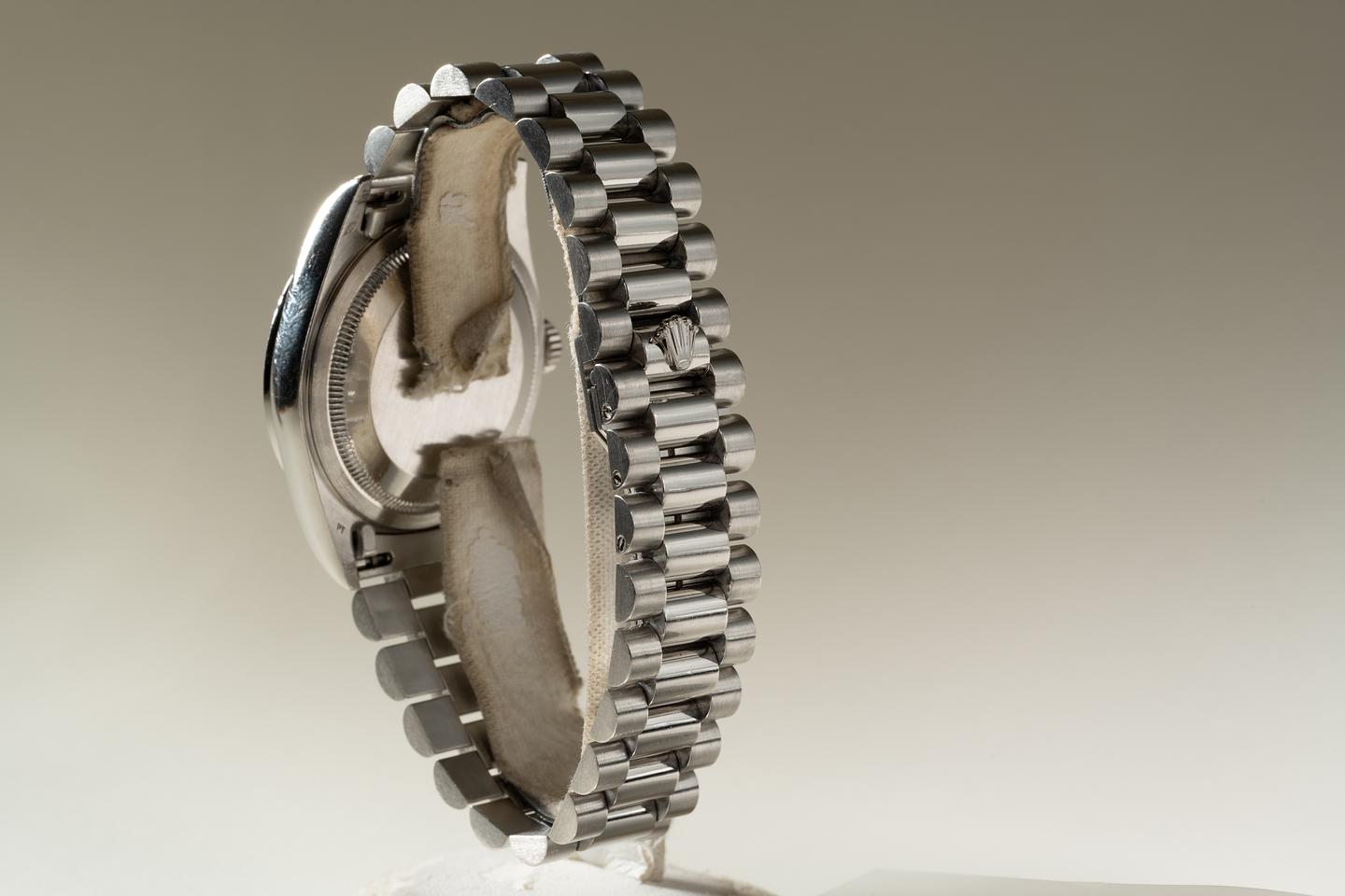 Bracelet: The 22 link 18K platinum President bracelet is excellent showing only light stretch for its age. The clasp is stamped with a matching 1994 date code.