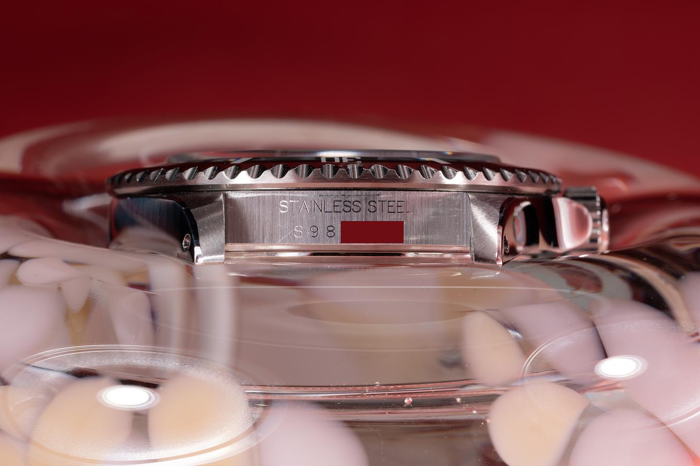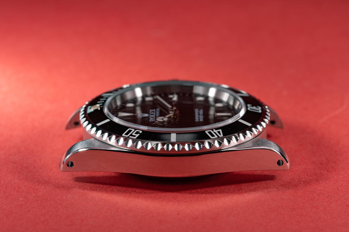 Case: The recently polished case is excellent showing sharp prominent bevels and only very light wear from use. The black bezel insert is also excellent showing light wear.