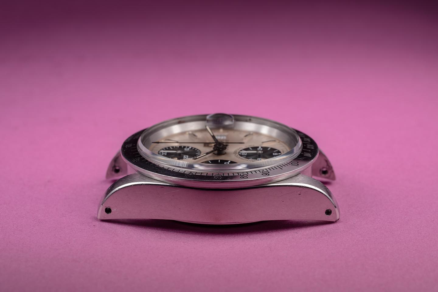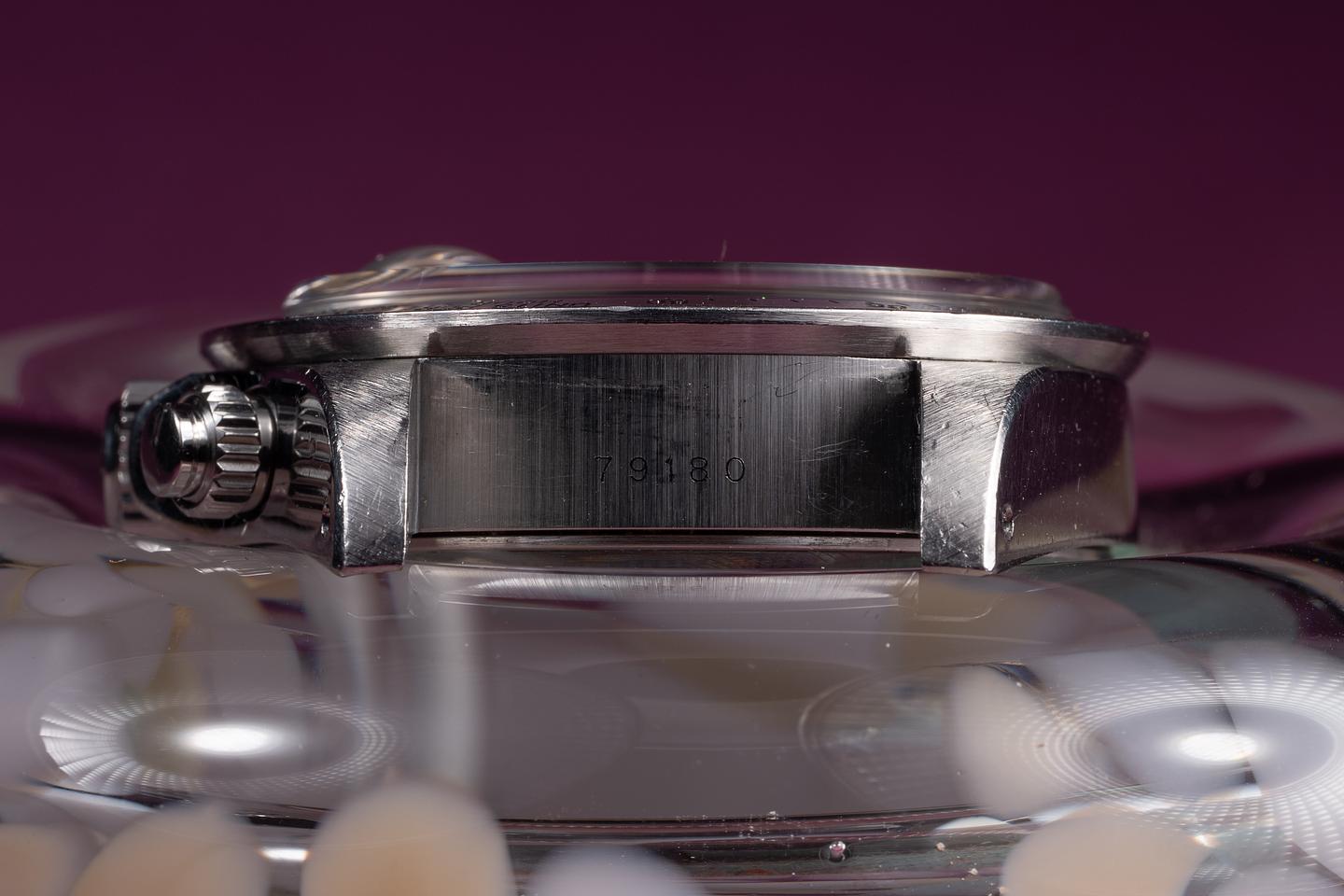 Dial: The silver dial is excellent, showing only very light wear for its age. The lume has aged to a clean creamy hue, and the hands match perfectly. The 6 o'clock lume plot is missing a small portion of its luminous mass.