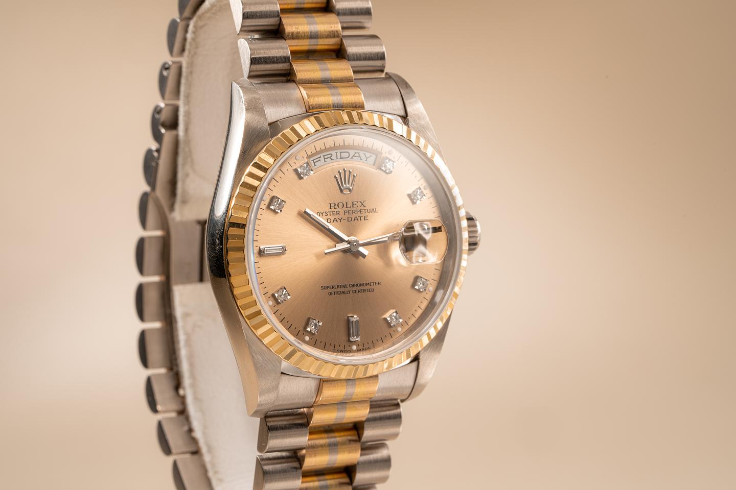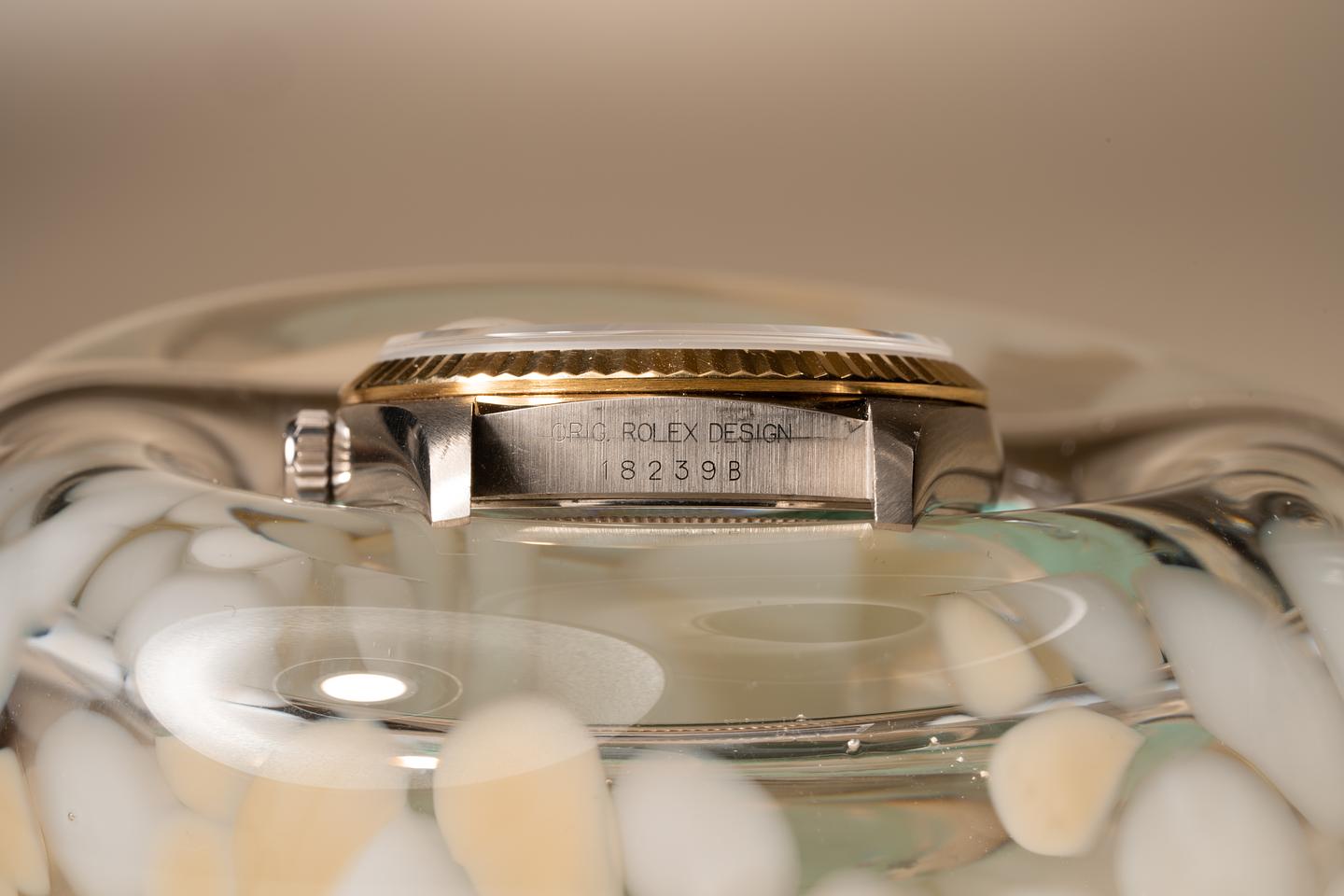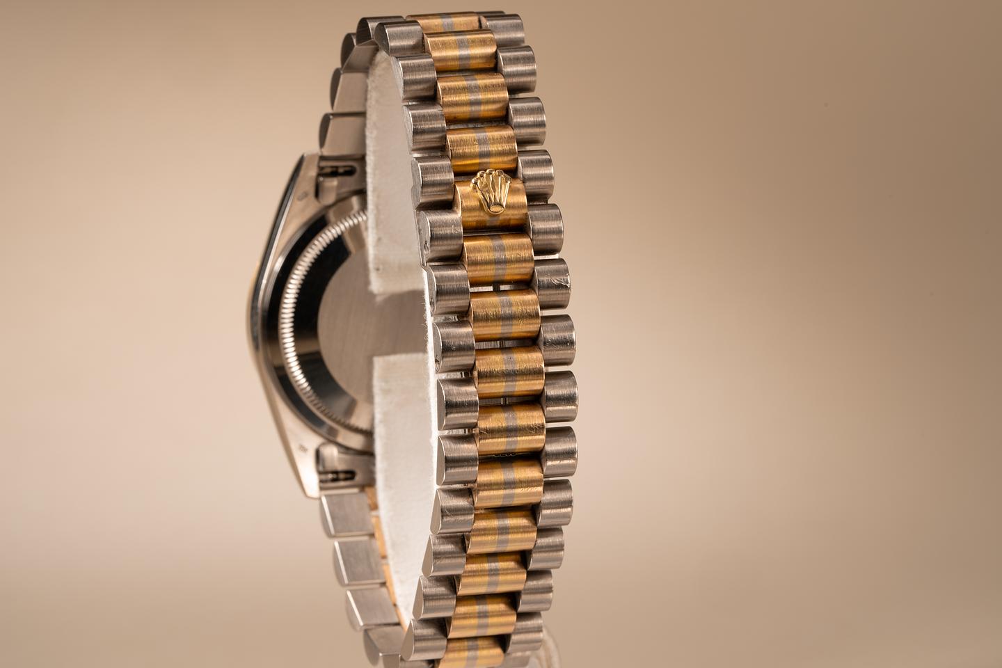 Case: Excellent 18k WG case that shows light wear from use. The 18k YG fluted bezel is sharp and shows very light wear.
