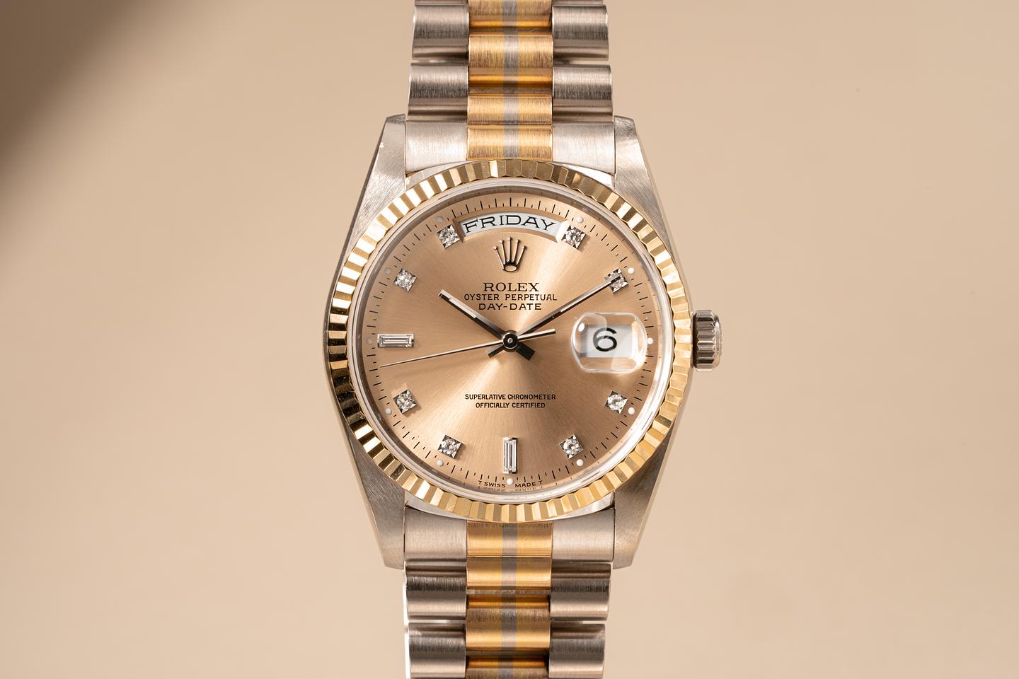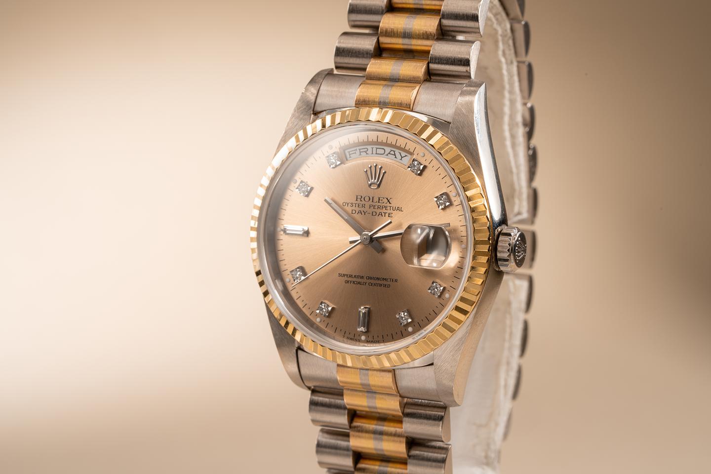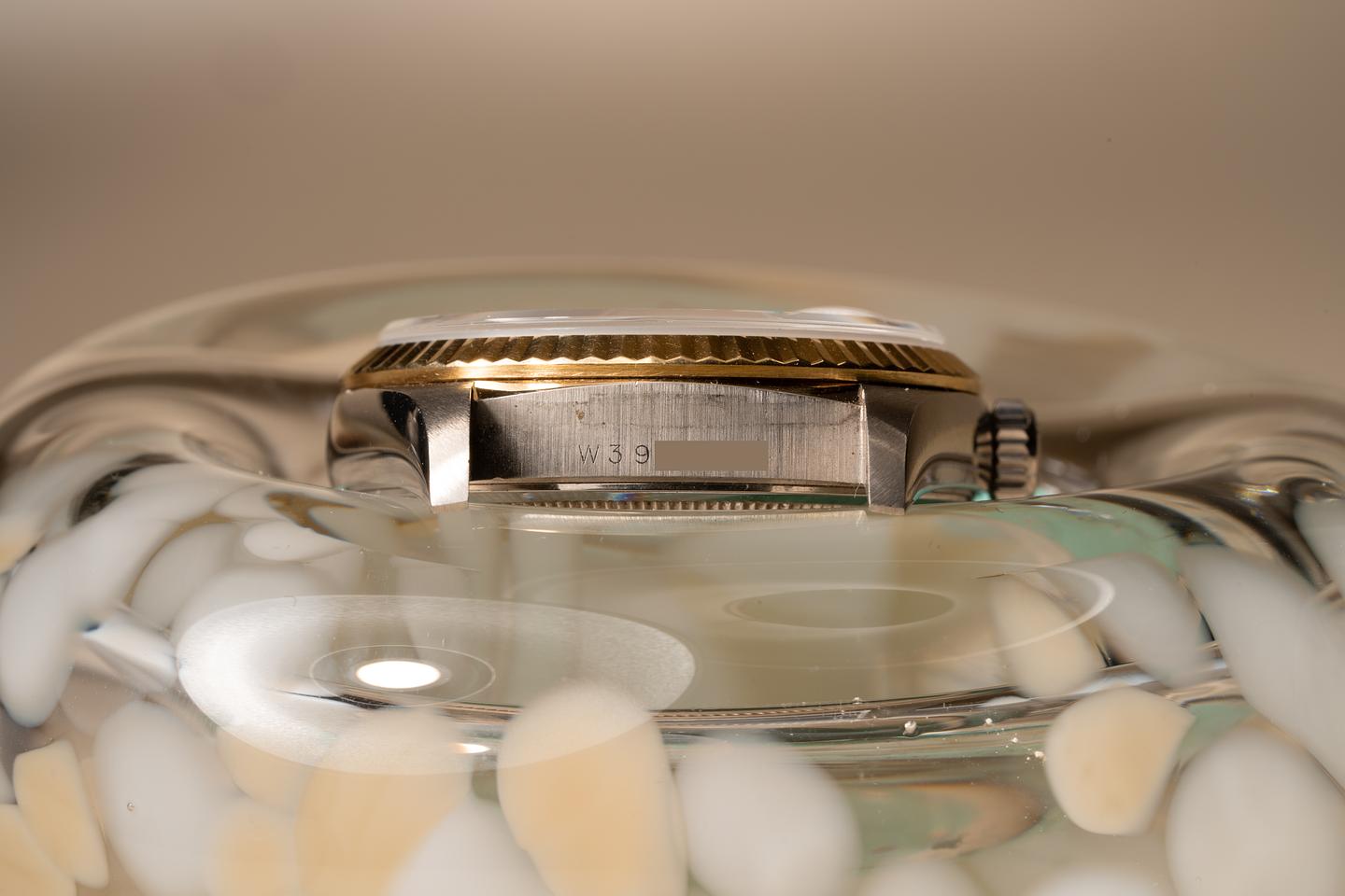 Case: Excellent 18k WG case that shows light wear from use. The 18k YG fluted bezel is sharp and shows very light wear.