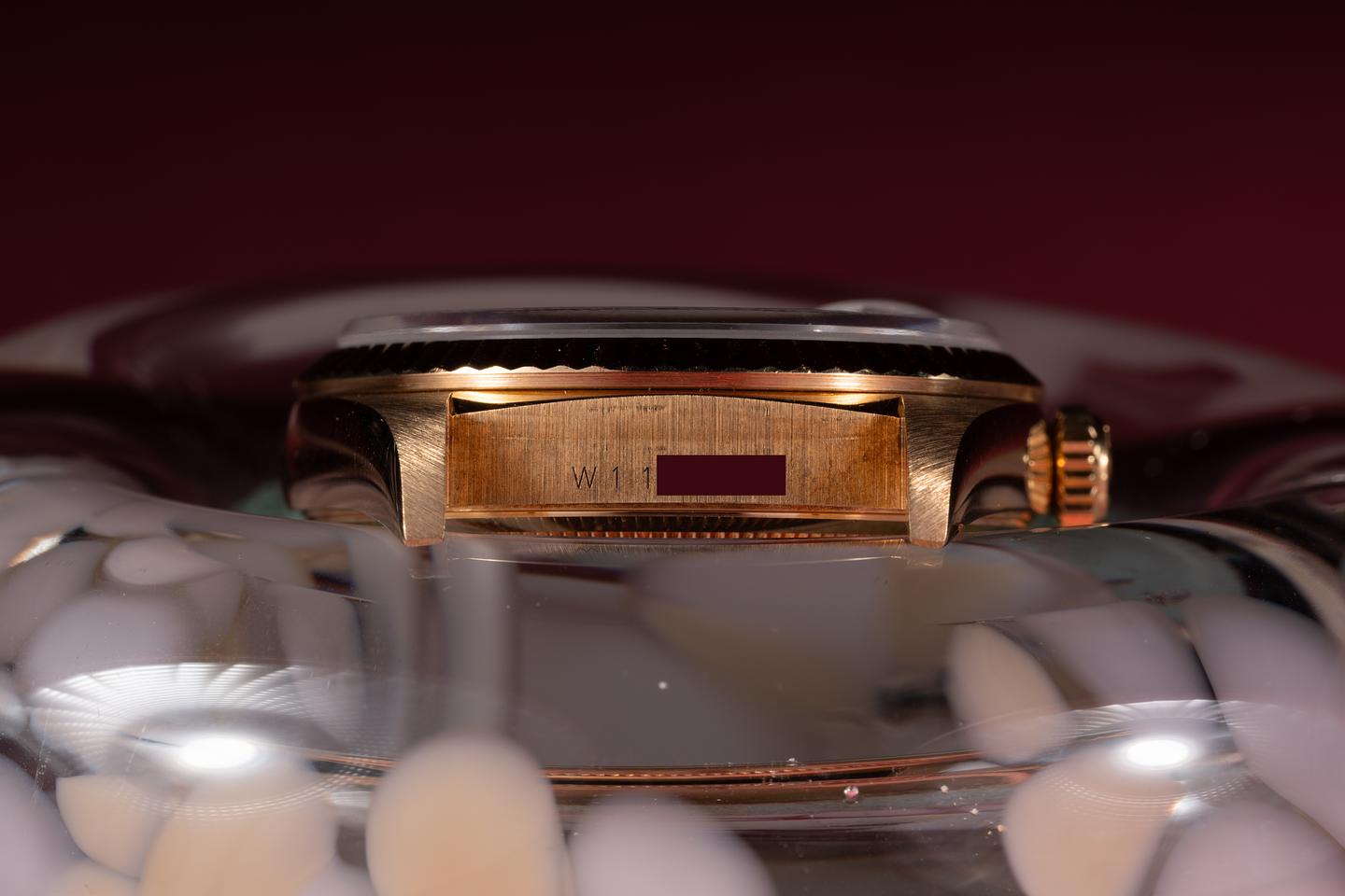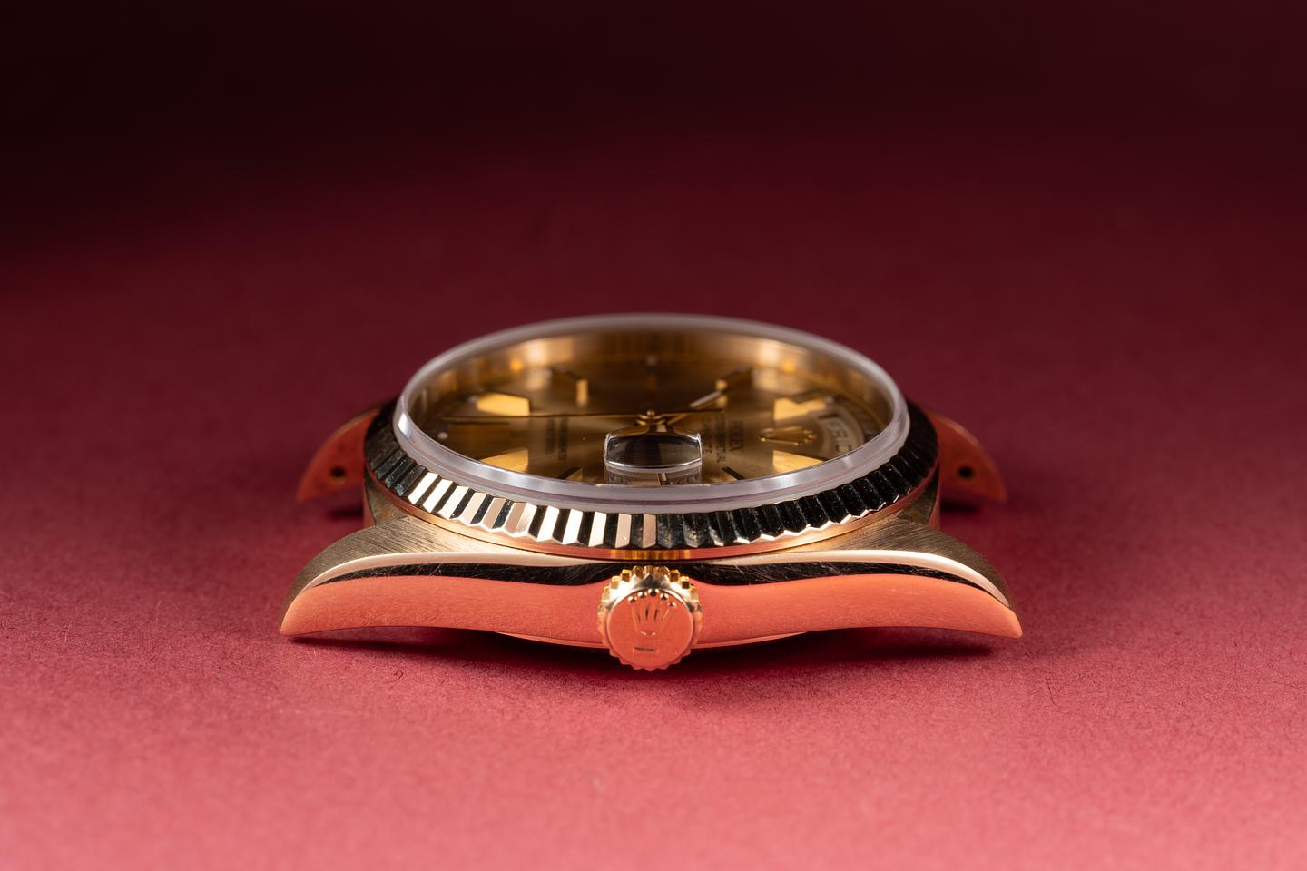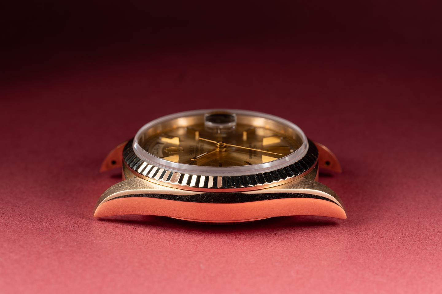 Case: The 18k yellow gold case is excellent showing only light wear for use. The sharp 18k yellow gold fluted bezel is also in excellent condition showing only light wear from use.