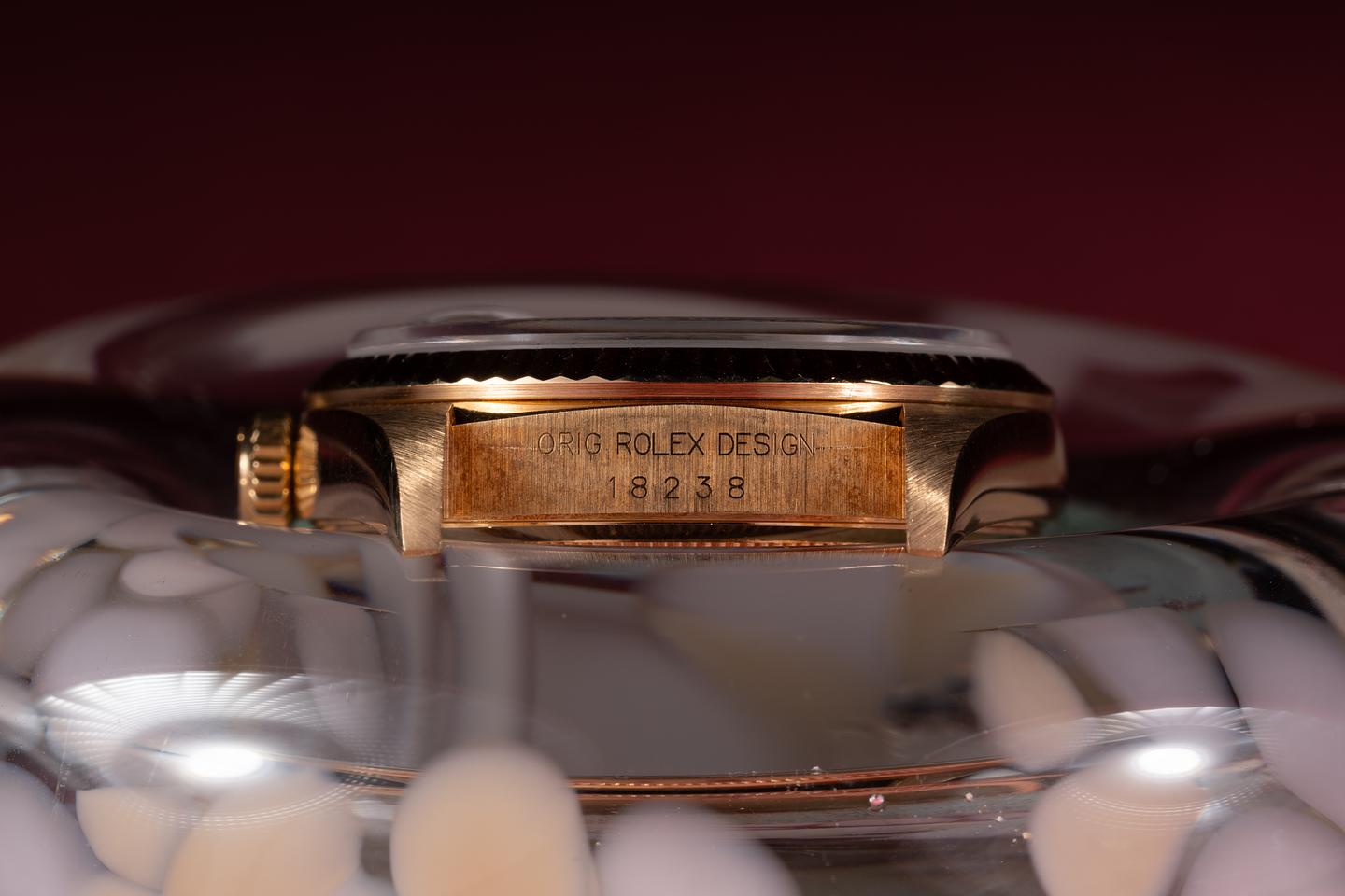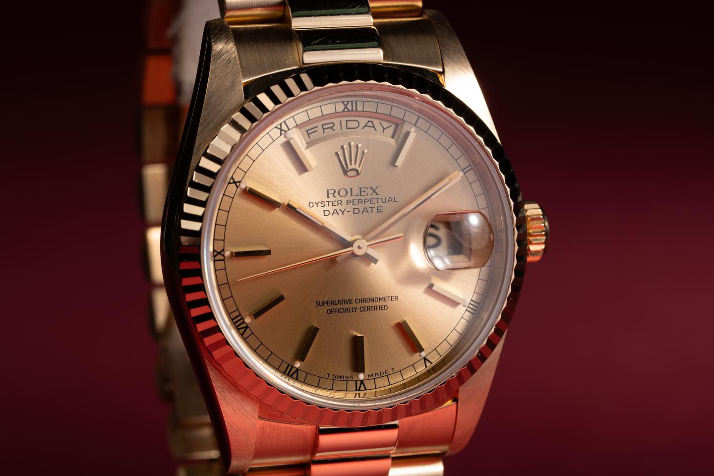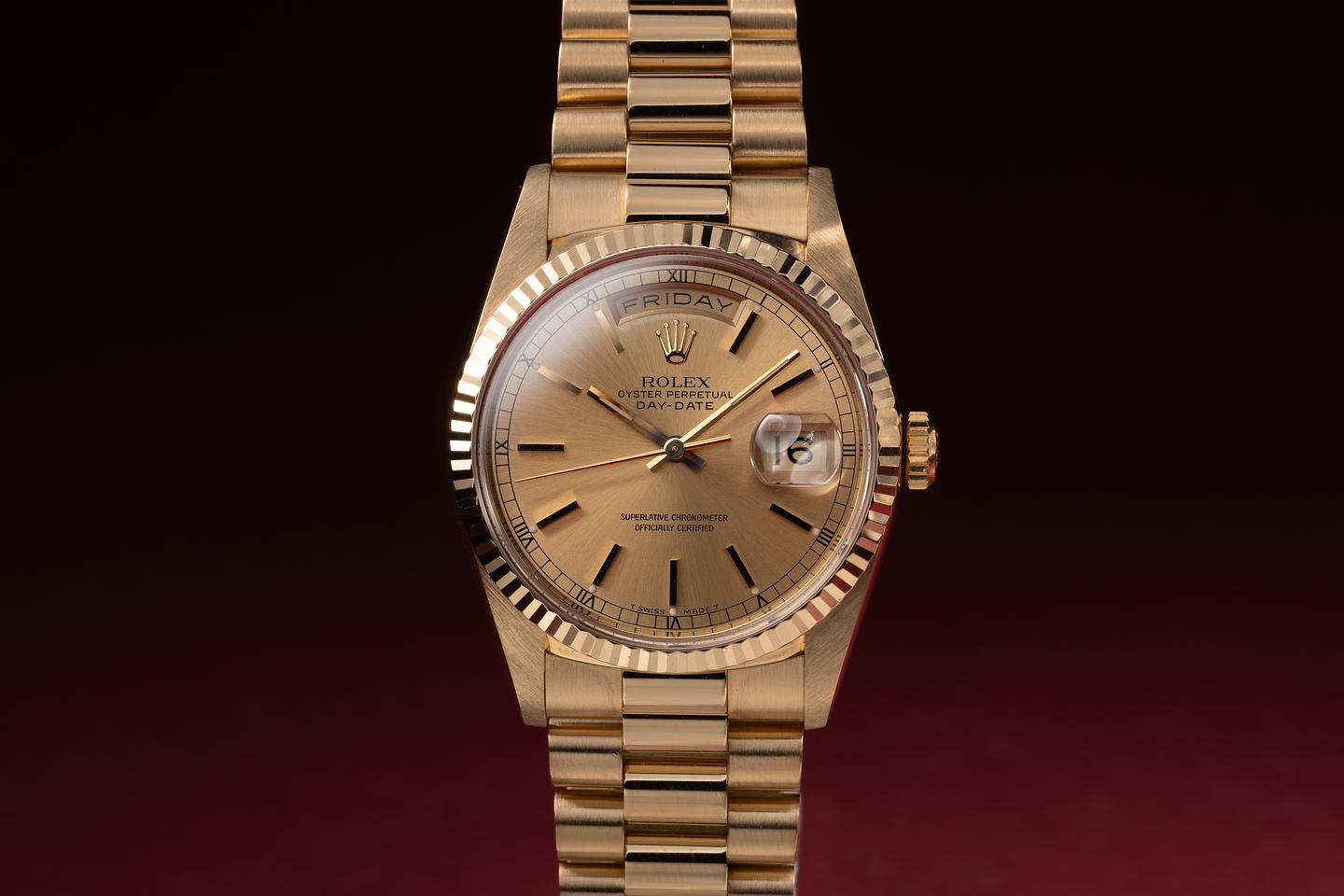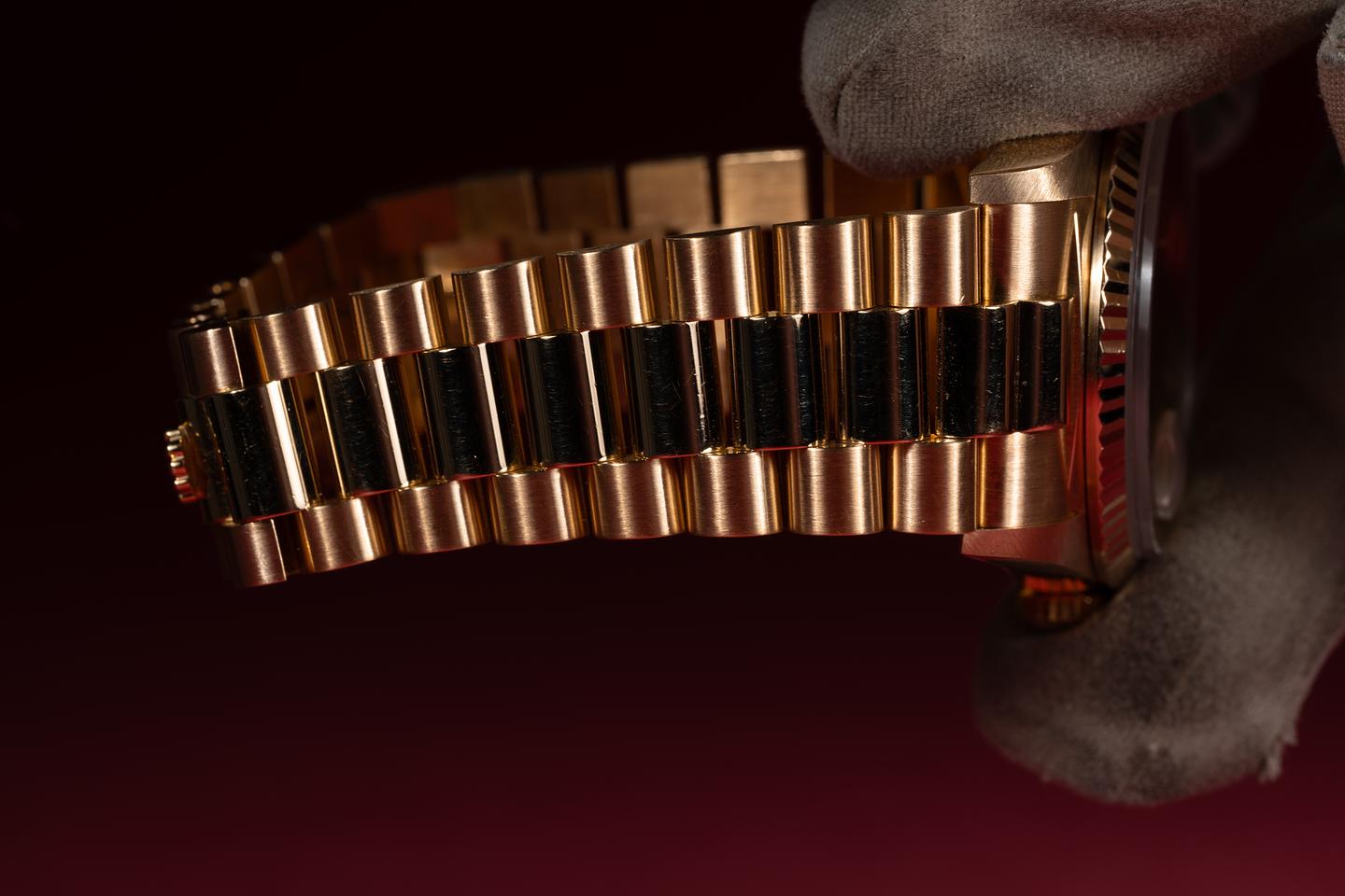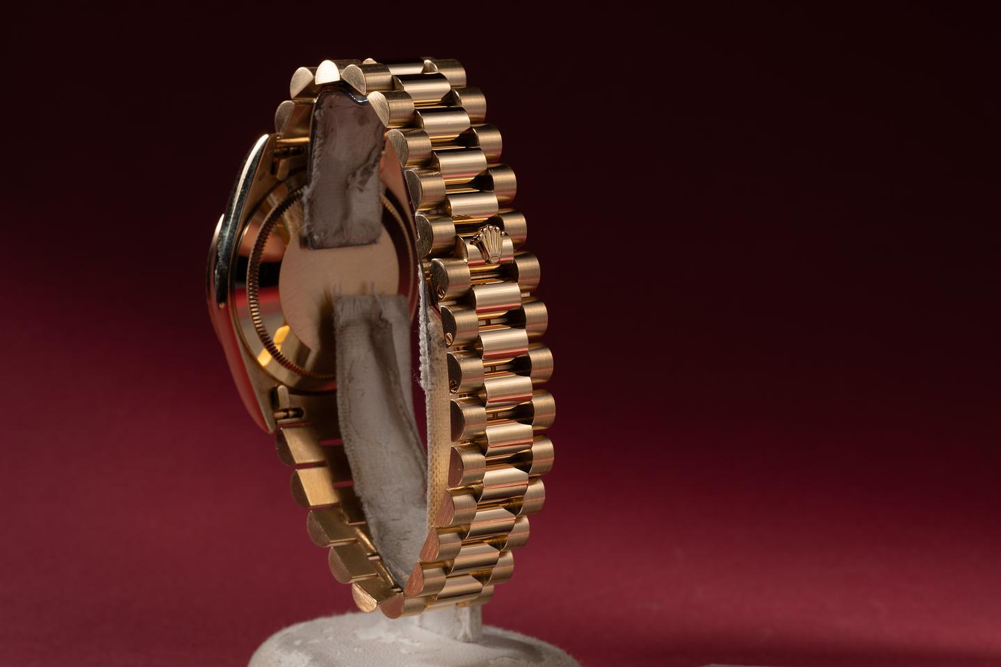 Bracelet: The 22 link 18K yellow-gold President bracelet is excellent showing only very light stretch for its age. The clasp is stamped with a matching 1995 date code.