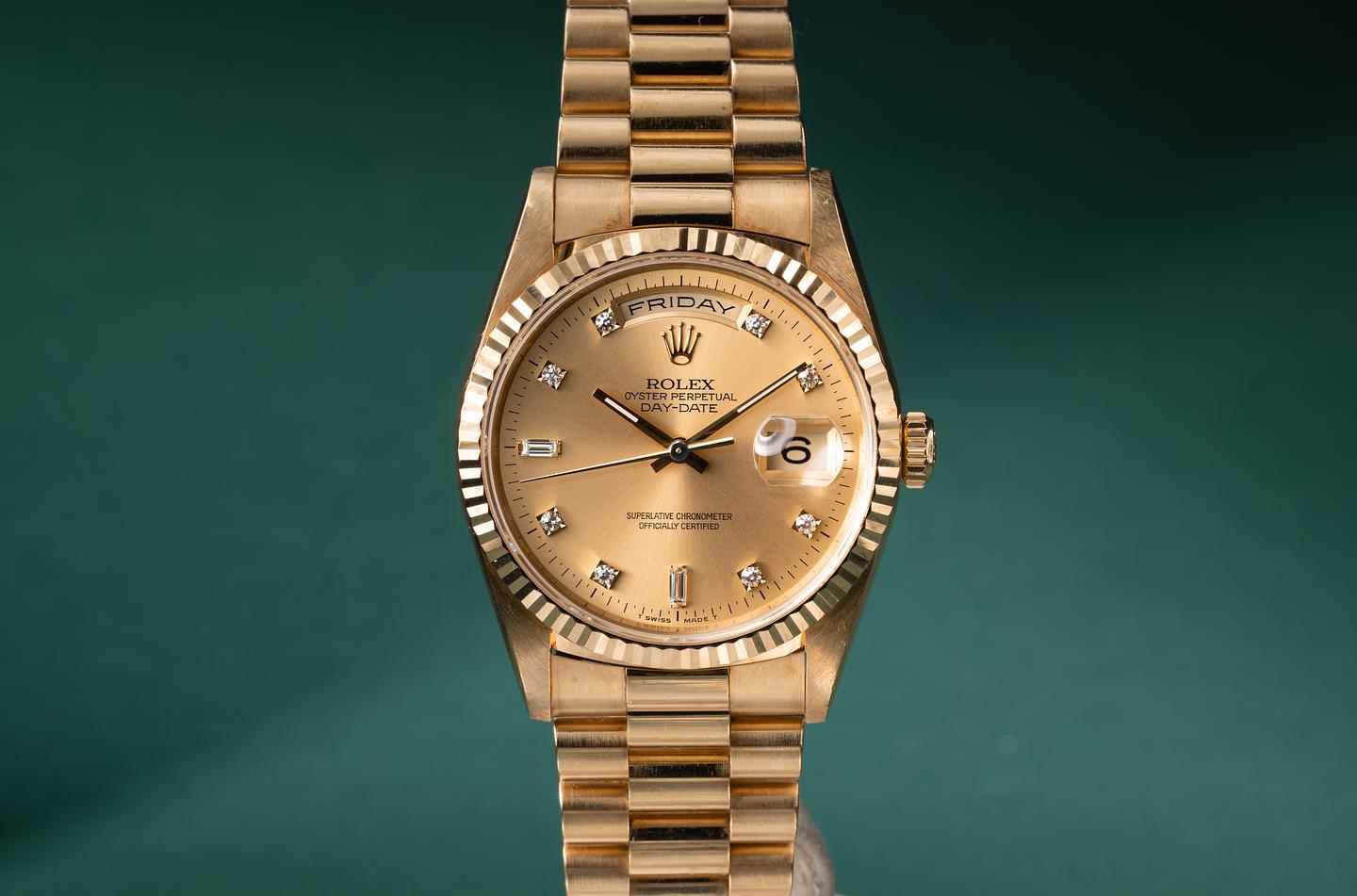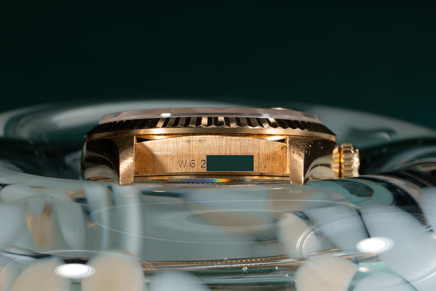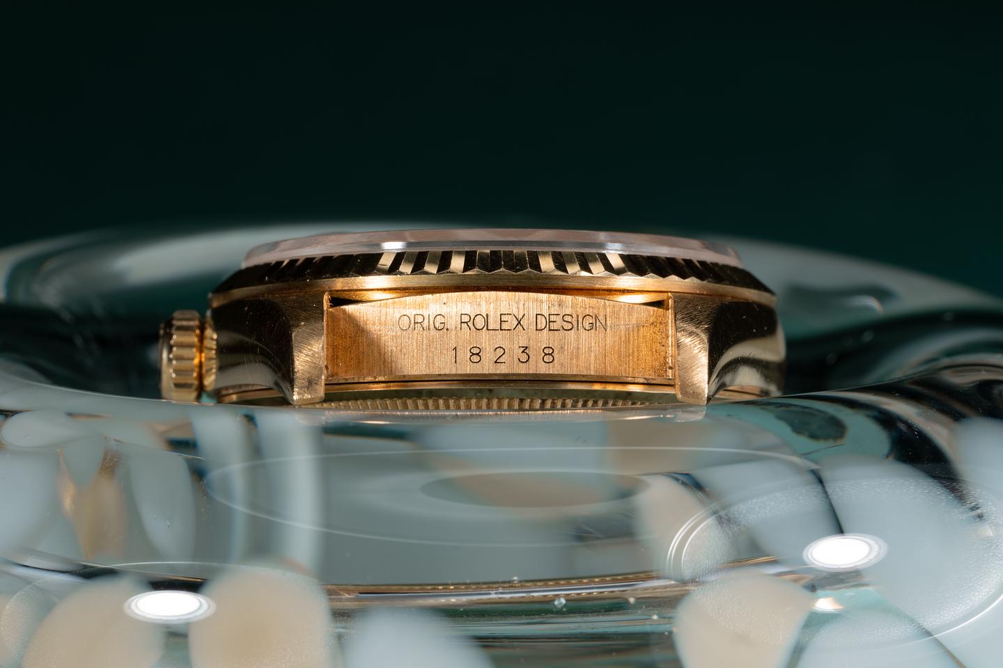 Bracelet: The 22 link 18k yellow gold oyster bracelet is excellent showing only light stretch for its age. The clasp is stamped with a matching 1995 date code.