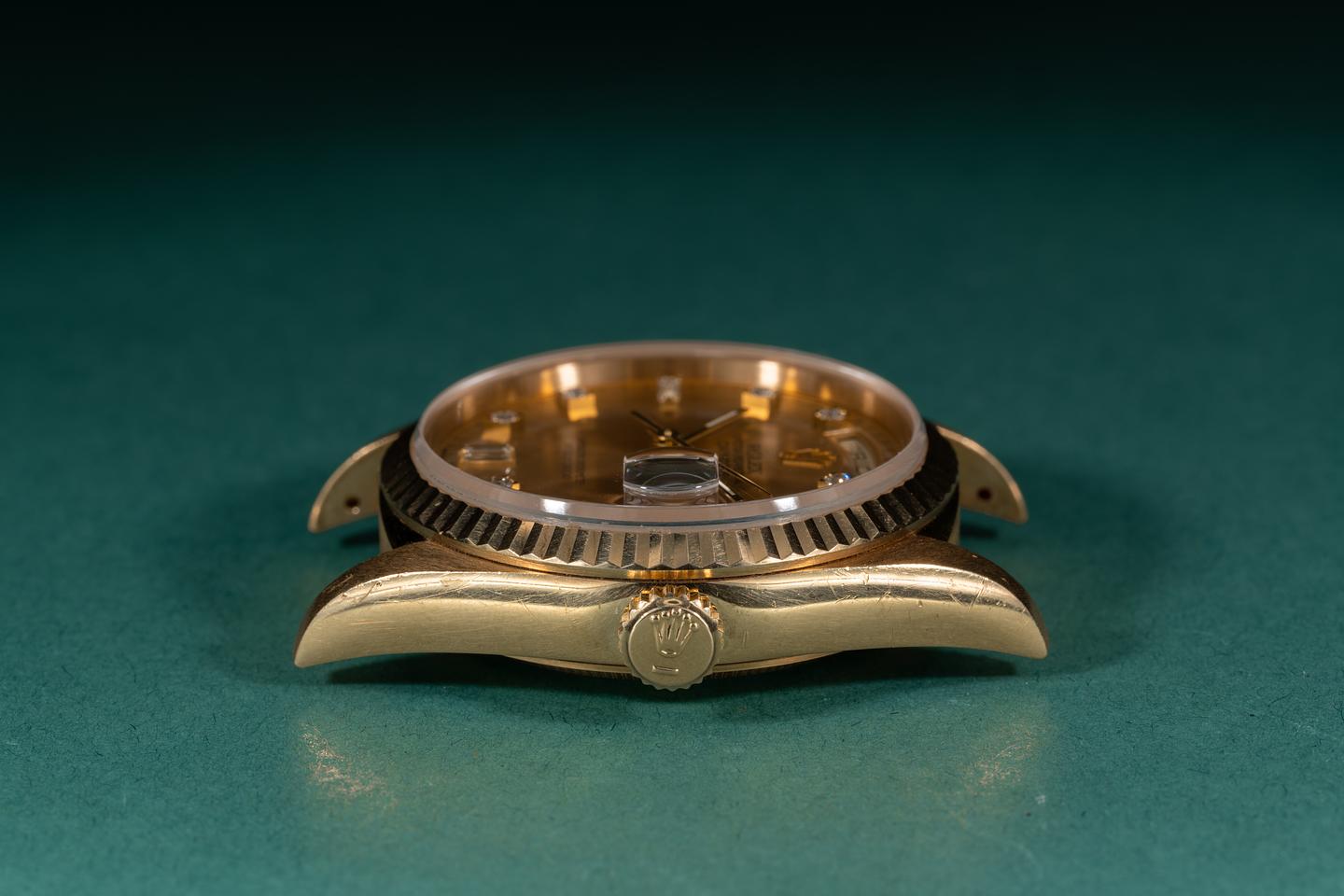 Case: The thick and even 18k yellow gold case is excellent showing some light wear from use. The sharp 18k yellow gold fluted bezel is also in excellent condition showing some light wear from use.