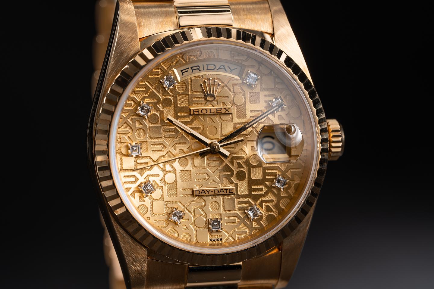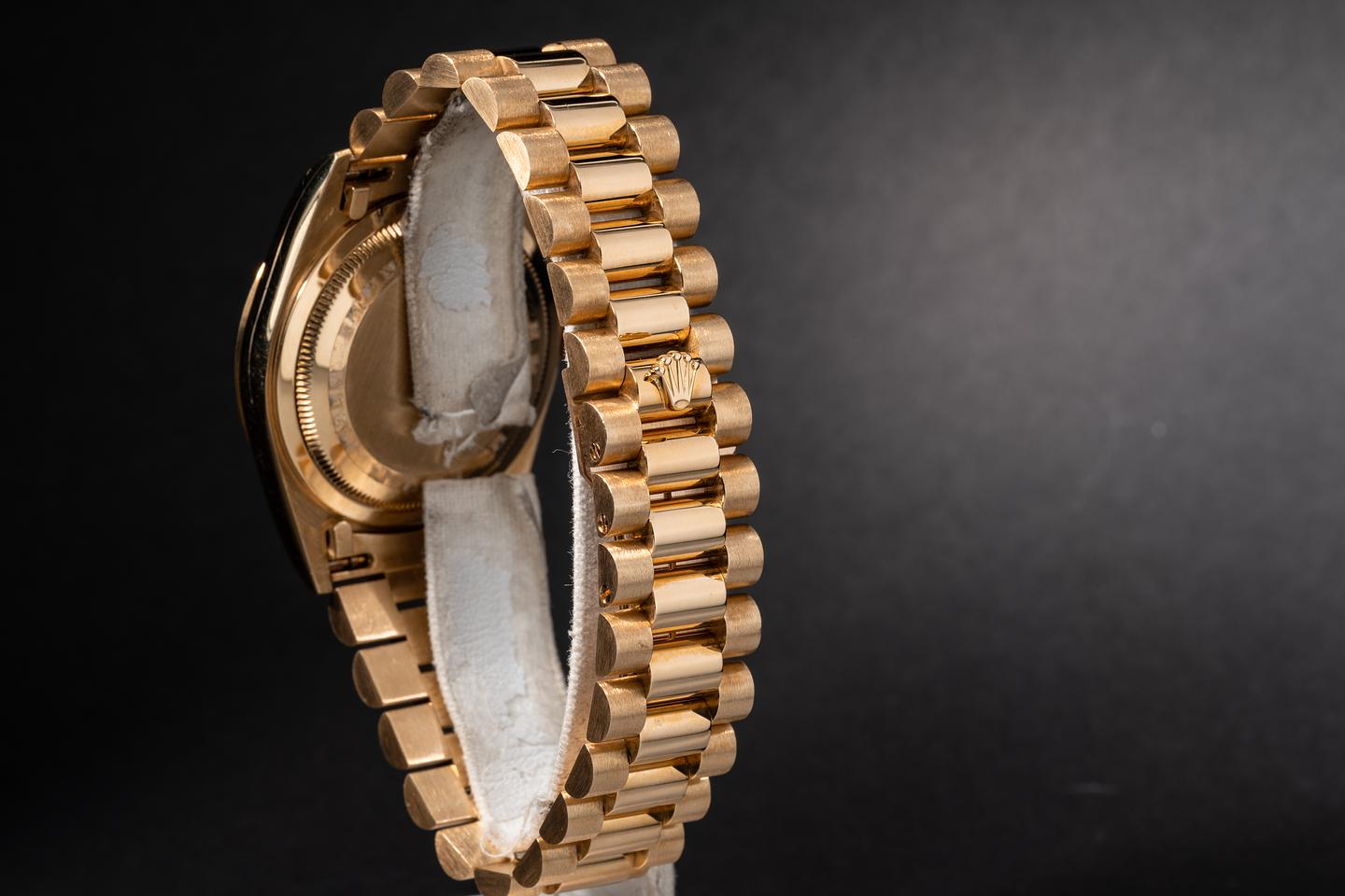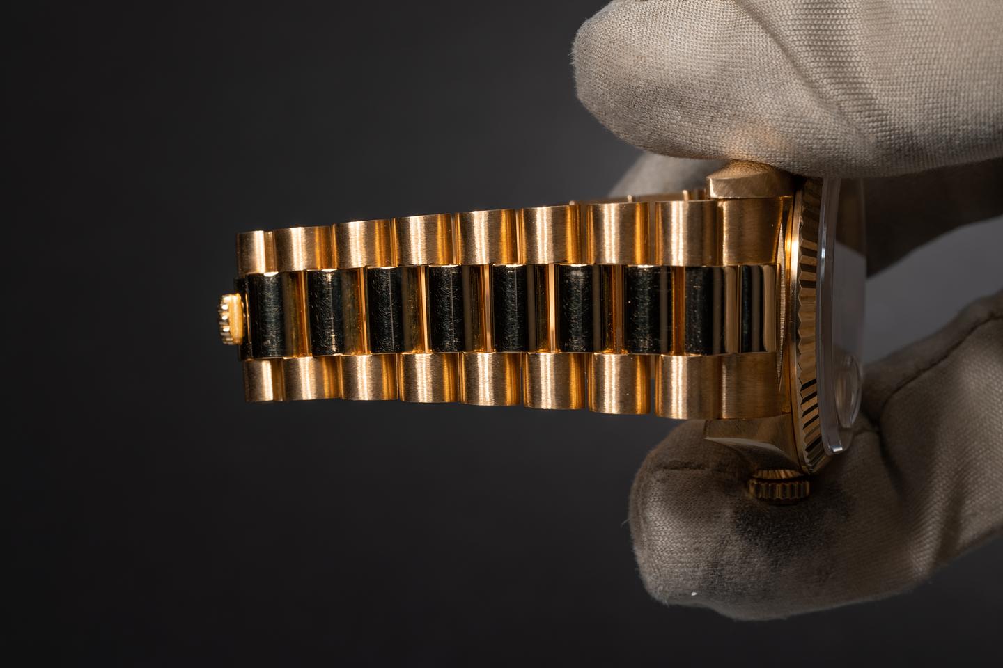 Bracelet: The 22 link 18K yellow gold president bracelet is excellent showing only extremely light stretch for its age. The clasp is stamped with a 1993 date code.