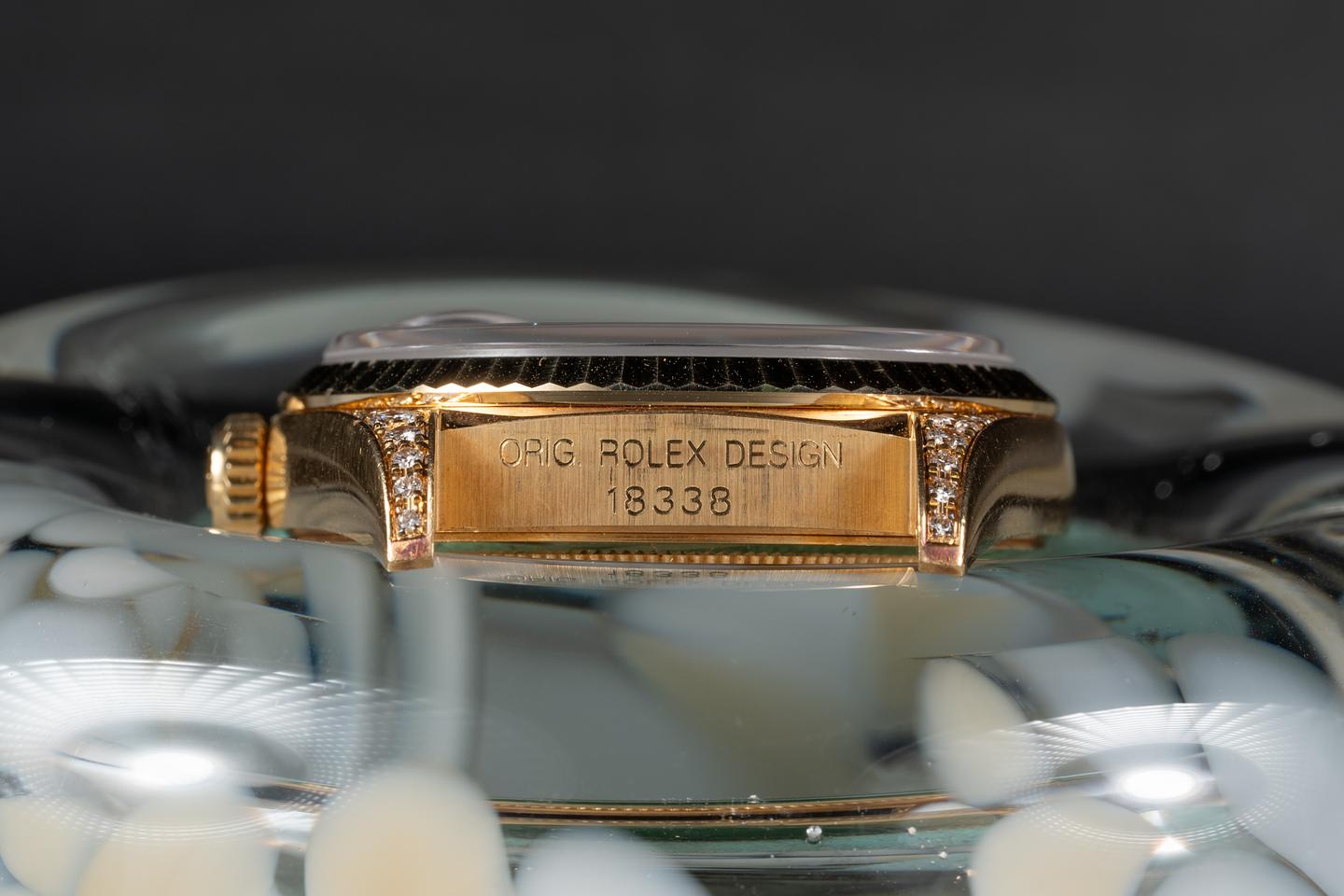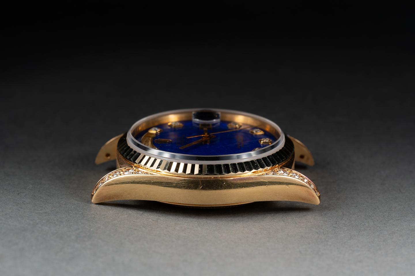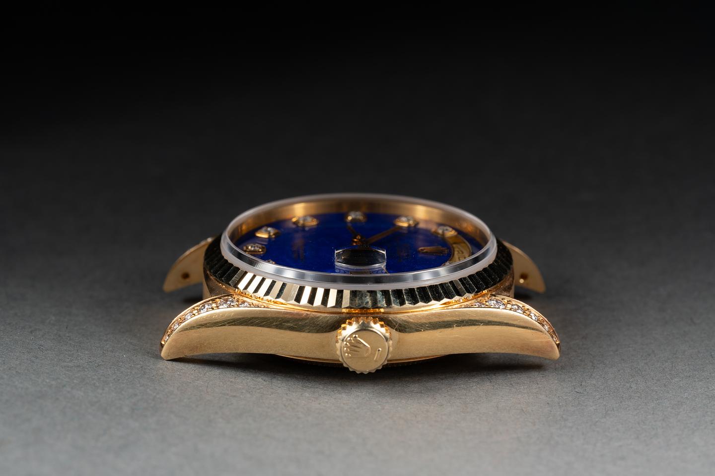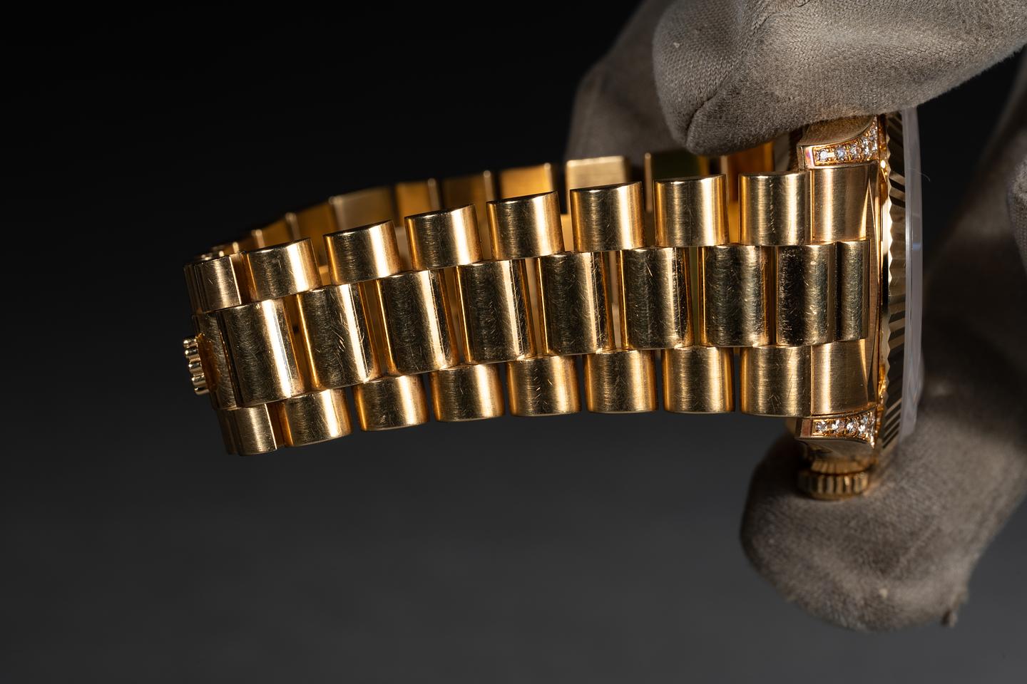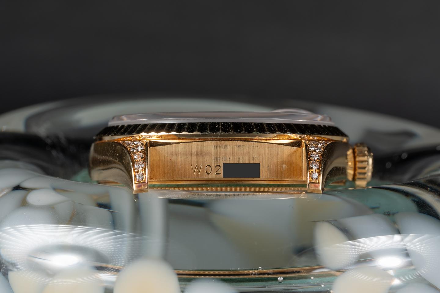 Case: The thick and even 18k yellow gold diamond encrusted case is excellent showing only light wear from use. The sharp 18k yellow gold fluted bezel is also in excellent condition showing only very light wear.