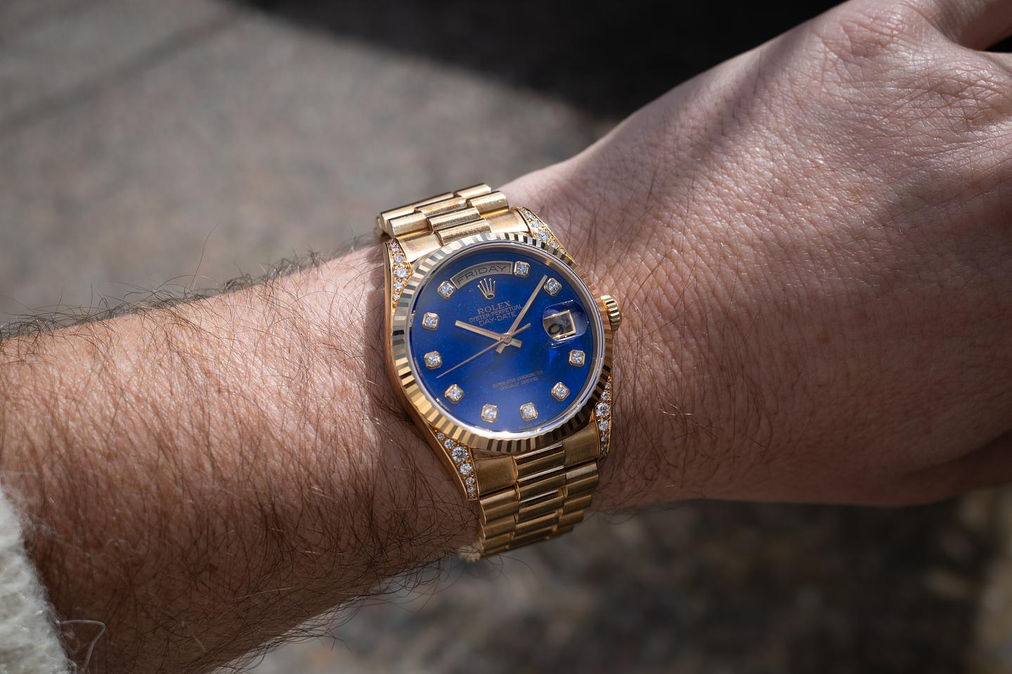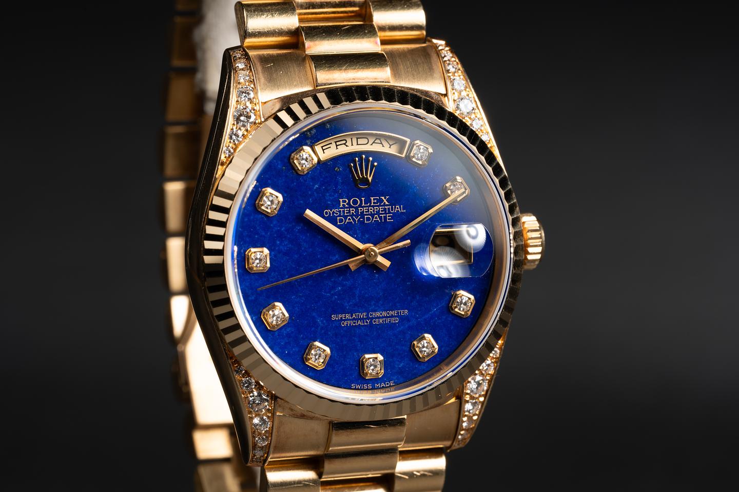 Dial: The deep blue lapis lazuli stone diamond dial is excellent showing no visible wear. The no lume hands are also in excellent condition.