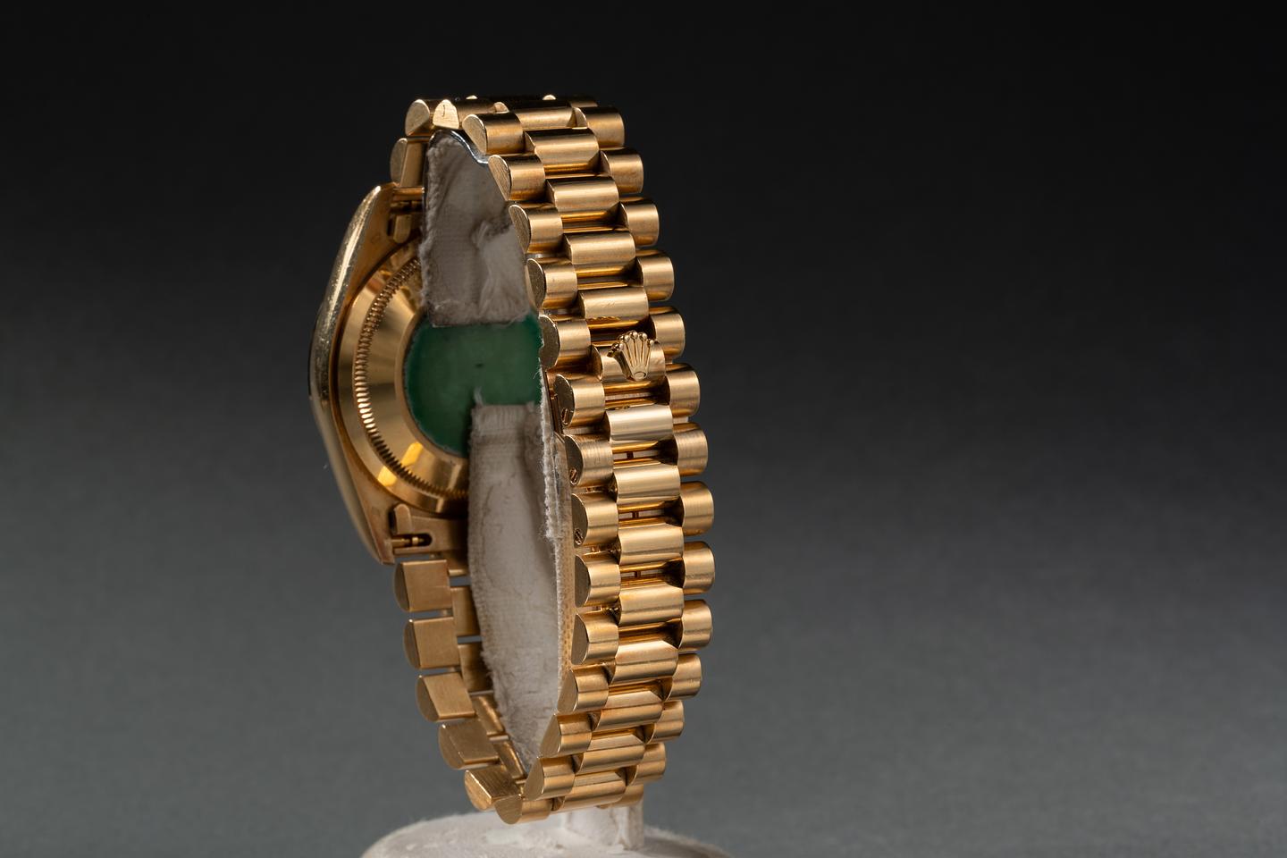 Bracelet: The 22 link 18K yellow-gold President bracelet is excellent showing only very light stretch for its age. The clasp is stamped with a matching 1995 date code.