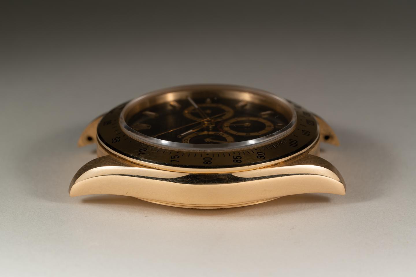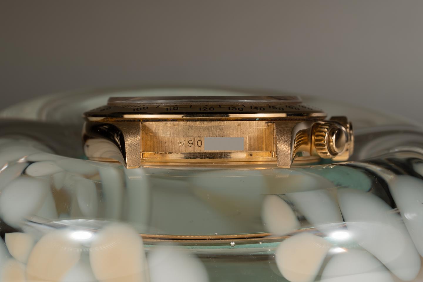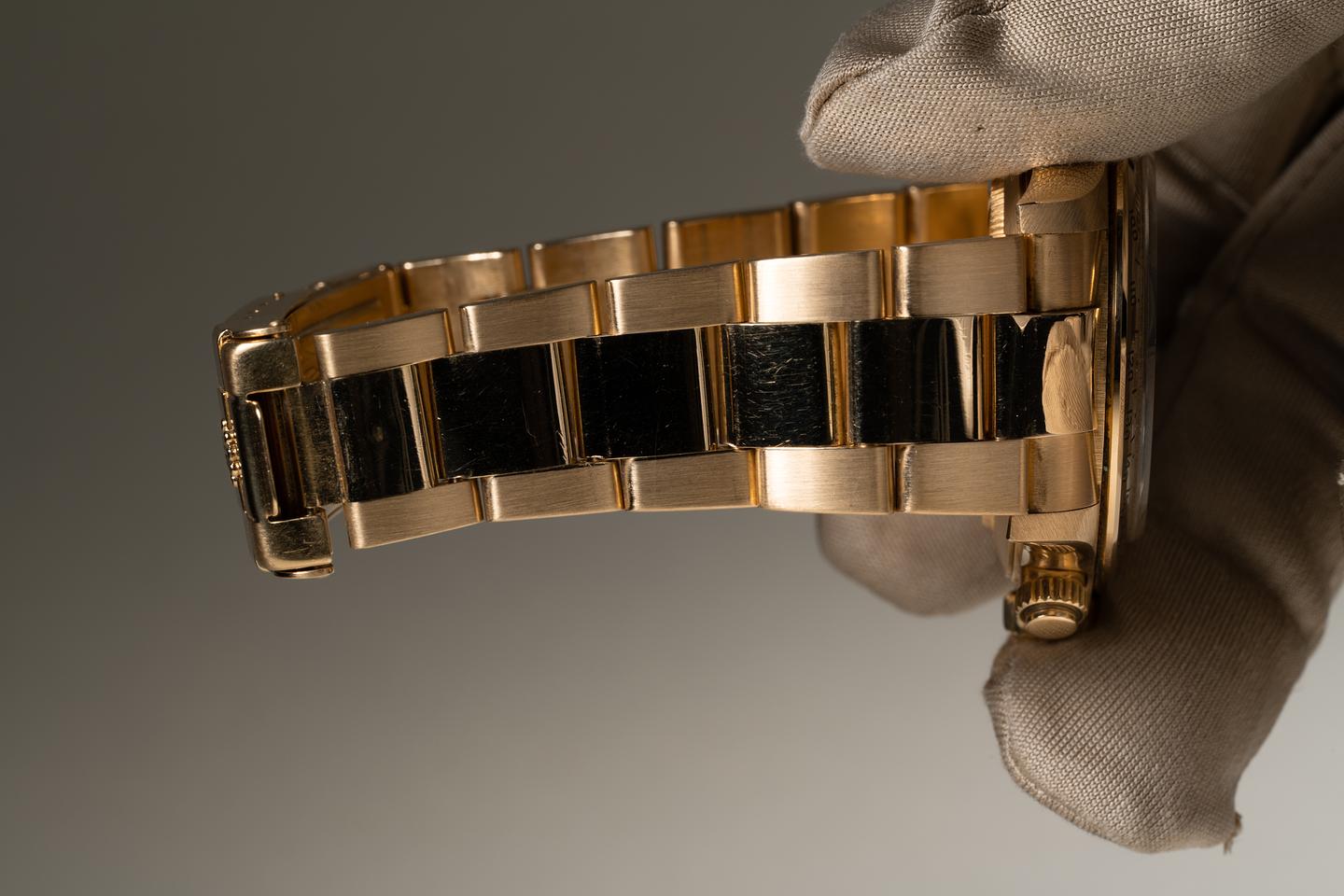 Case: The thick and even 18k yellow gold case is excellent showing only very light wear. The 18k yellow gold bezel is also in excellent condition showing only very light wear.